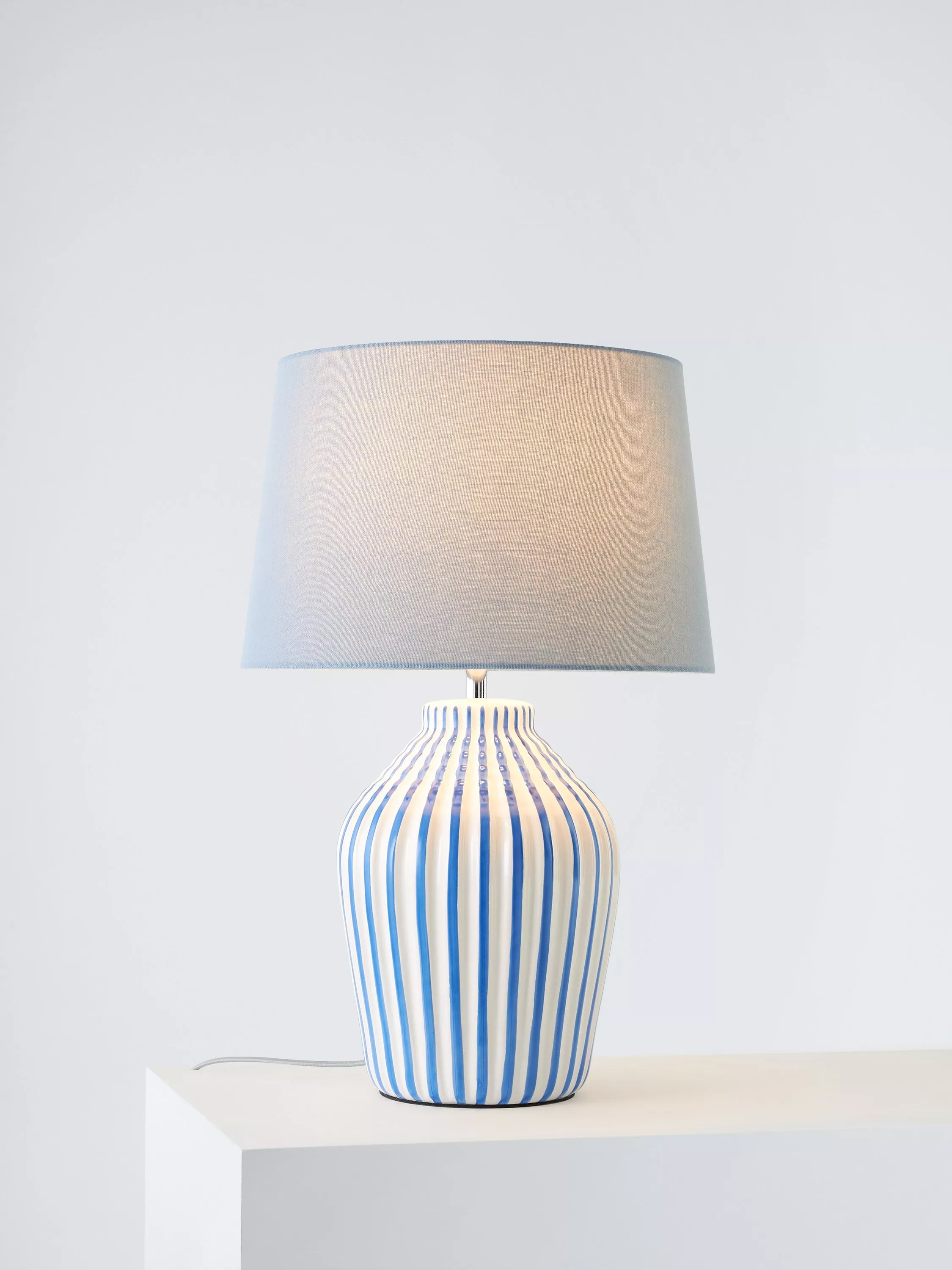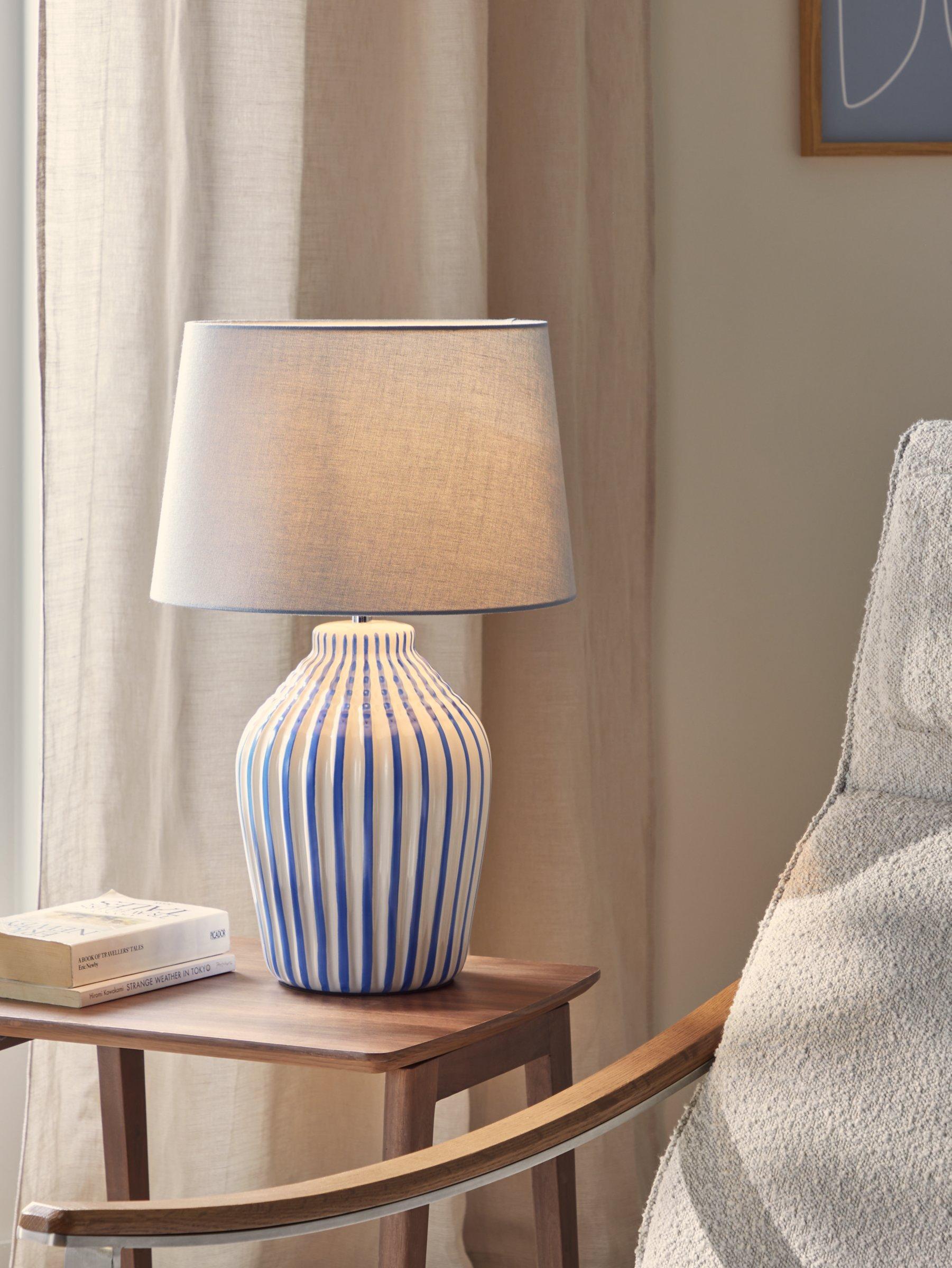 Add a pop of colour and style to your home with our Trevone table lamp. Showcasing a textured ceramic rib base, this lamp combines a contrast stripe design to create a visual treat in the home. A matching linen shade and fabric flex complete the look.
