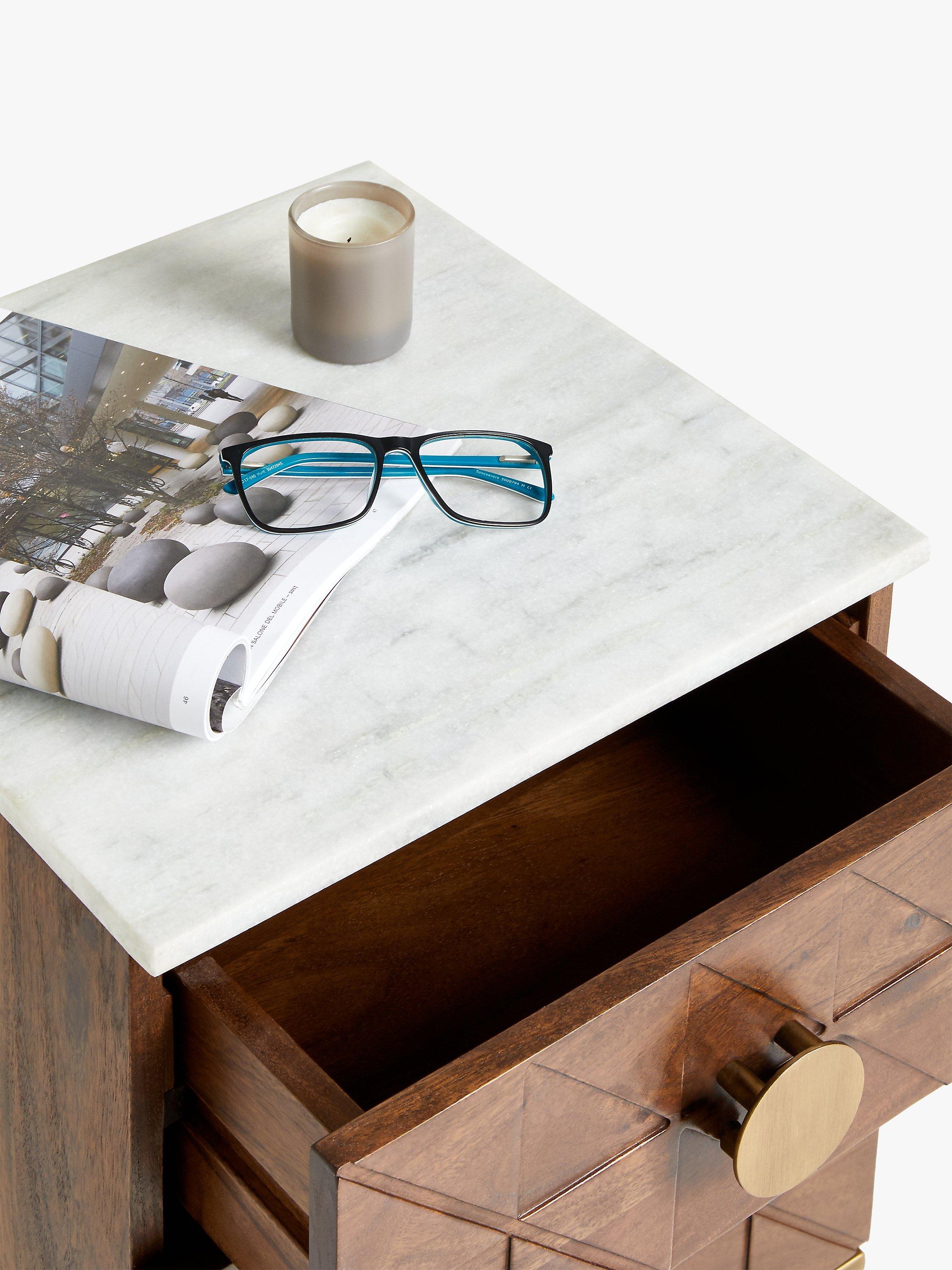- Acacia wood, marble, metal, veneers