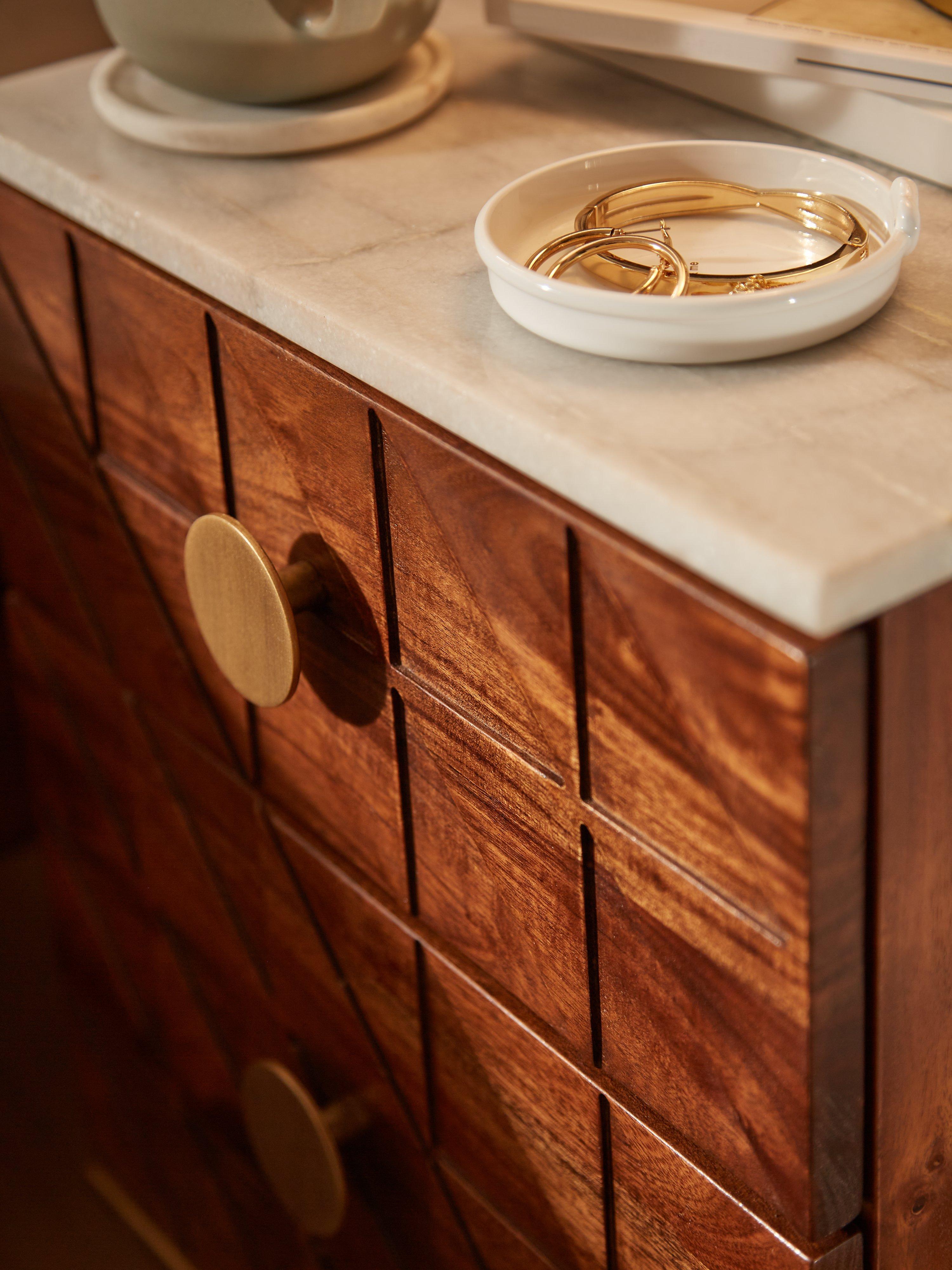 Durable, shown on the circle-shaped drawer handles and sleek, tapered legs. The drawer fronts are cut with a tessellated pattern to create a geometric look, and the thick, natural marble surface top lends a cool, neutral contrast.