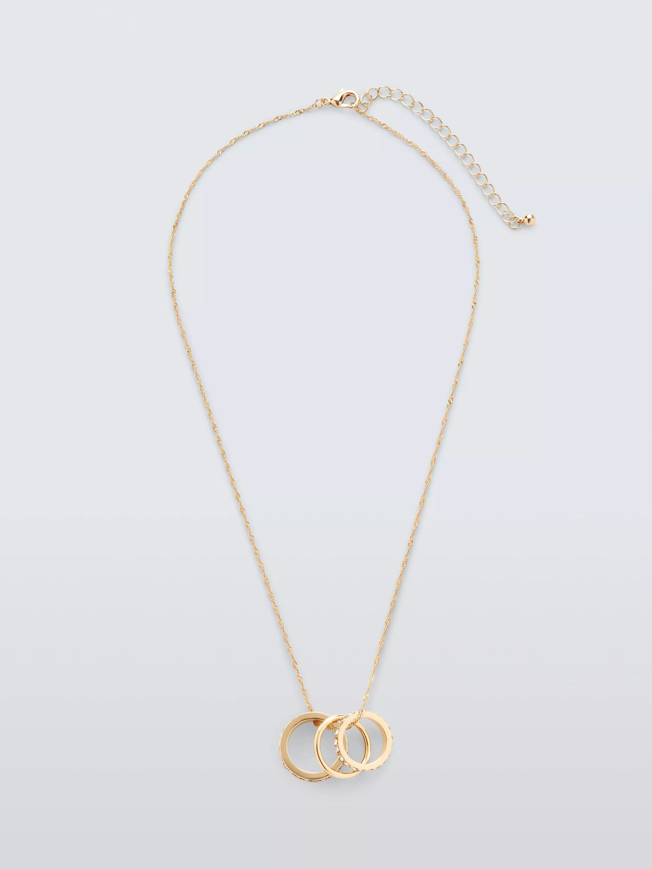 This twist chain necklace boasts 3 rings, one smoothly polished and the others encrusted with diamante stones and double colour encrusted baguette stones. Adjustable in length for the perfect fit.