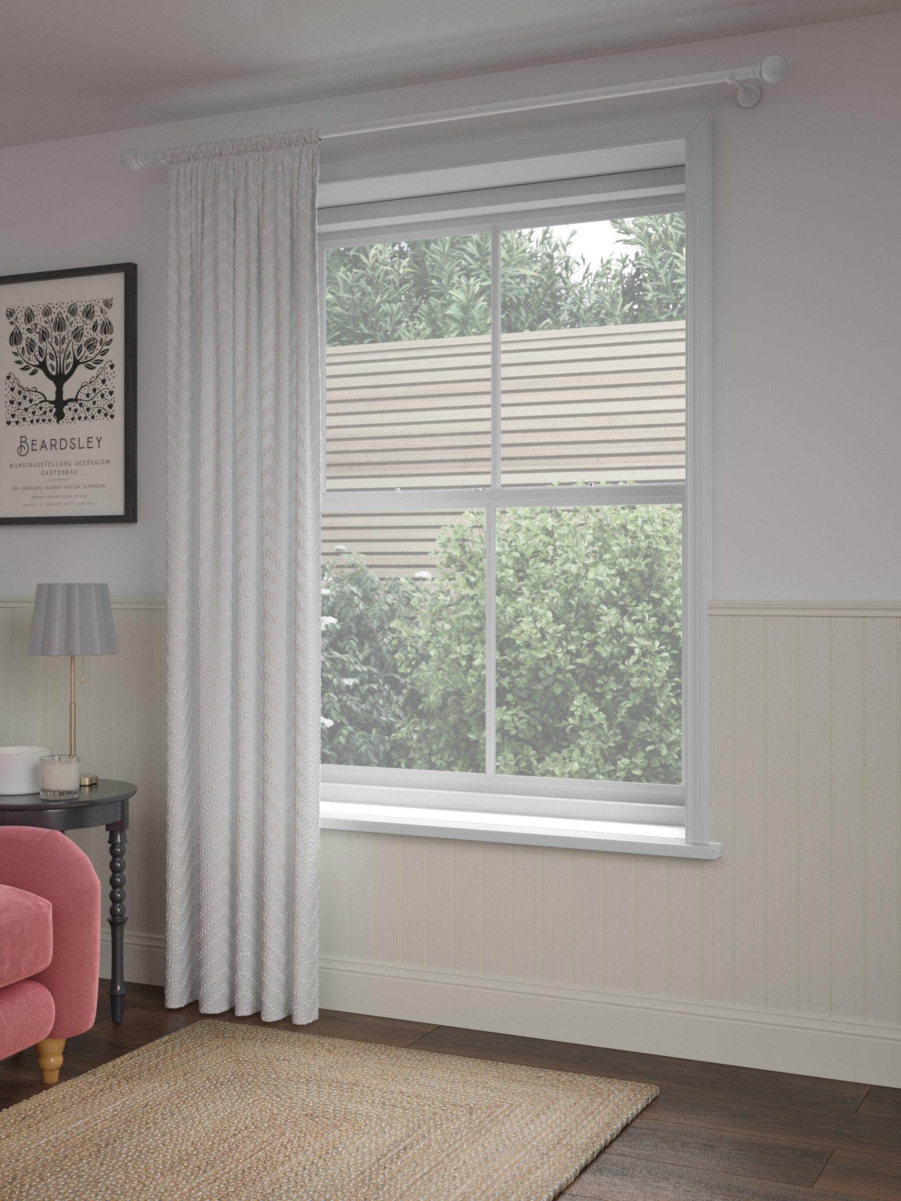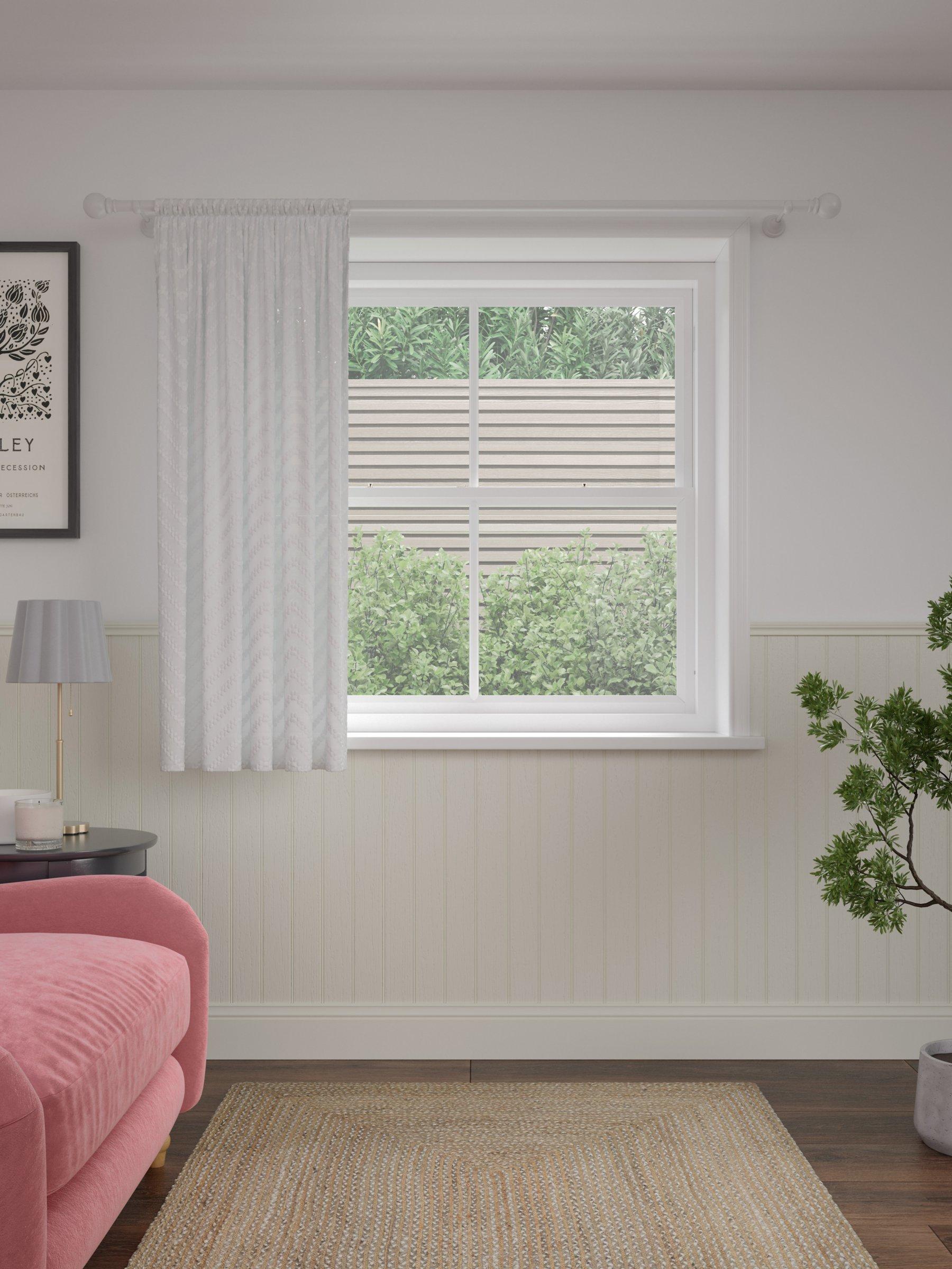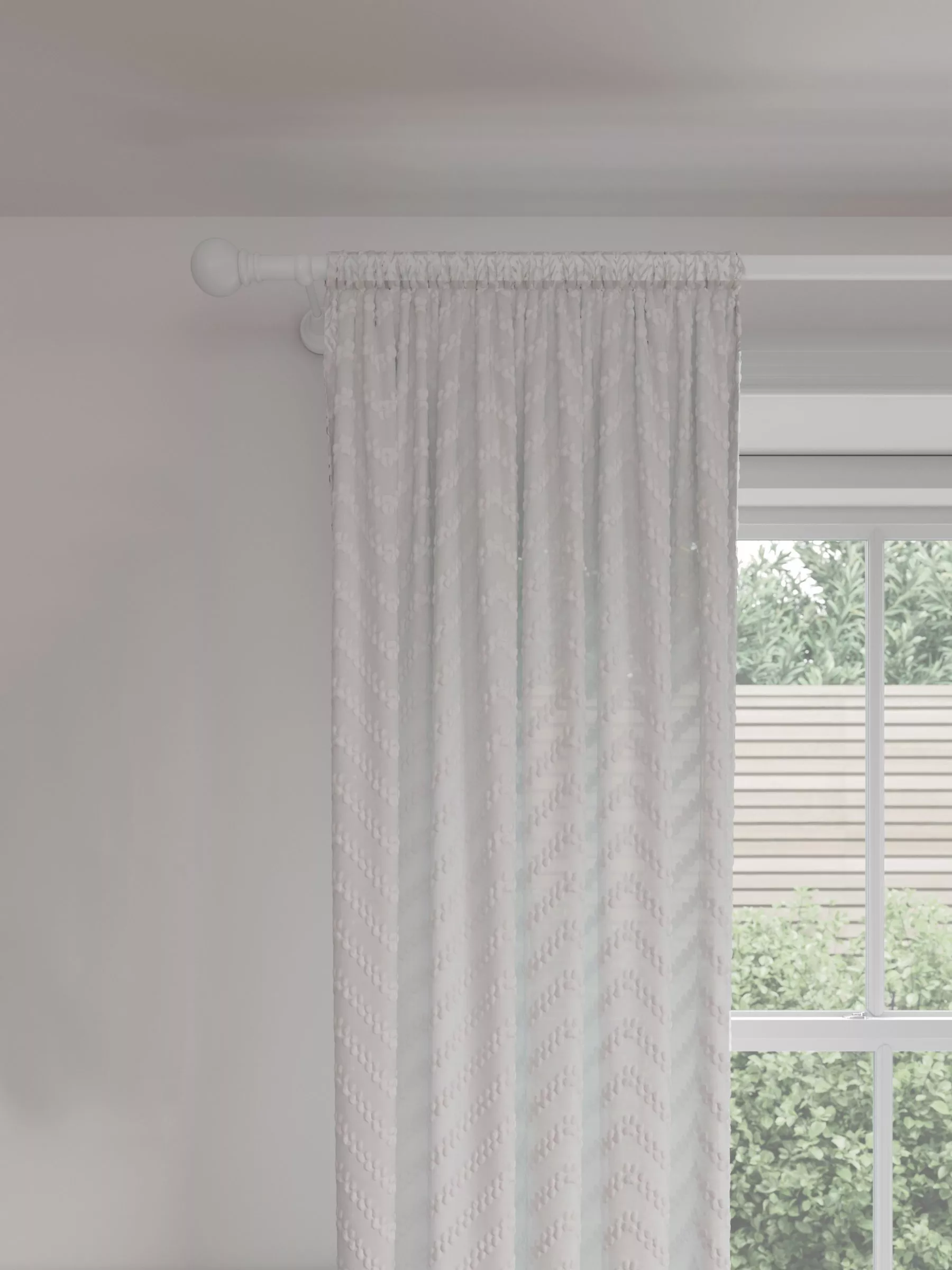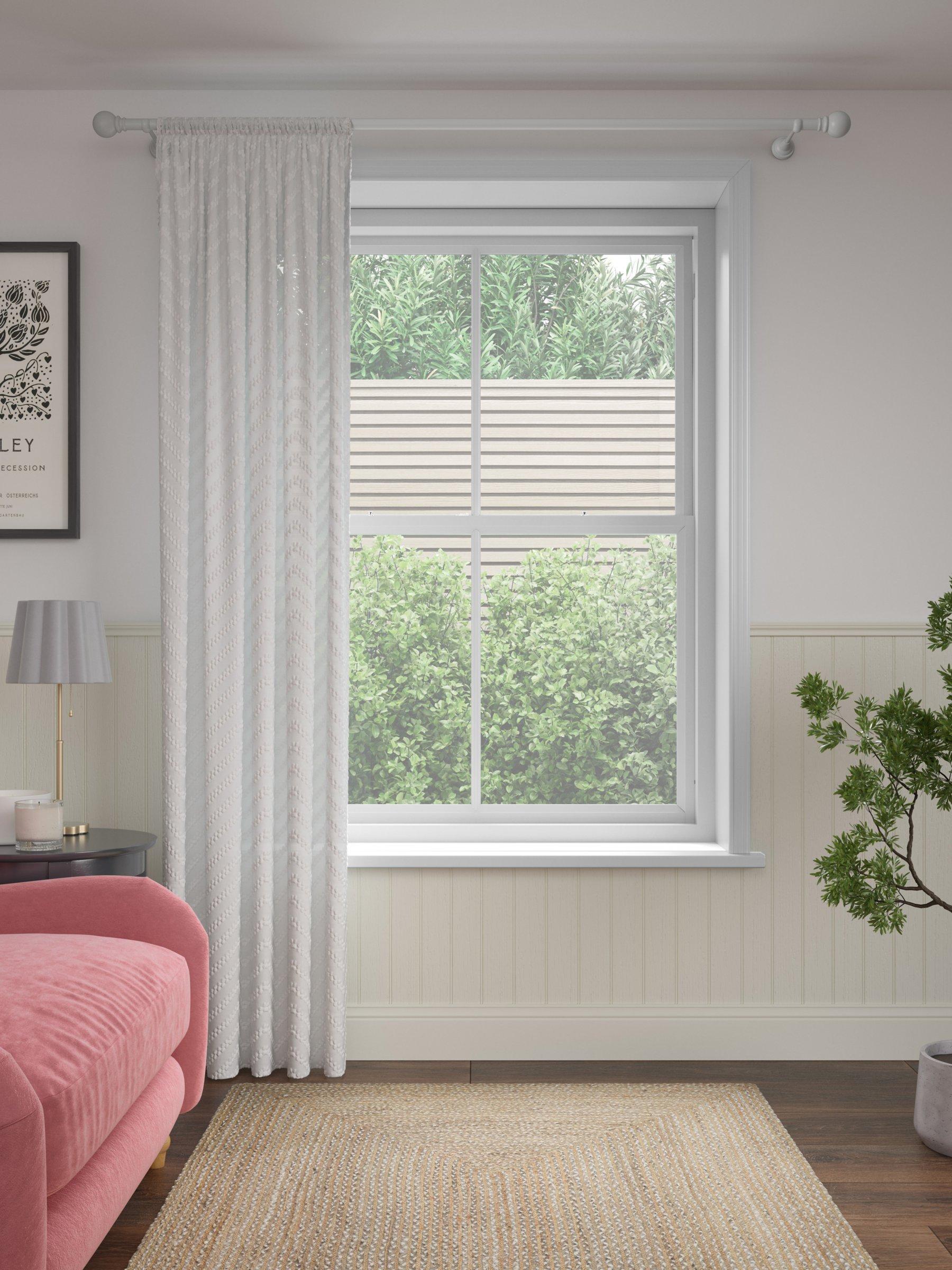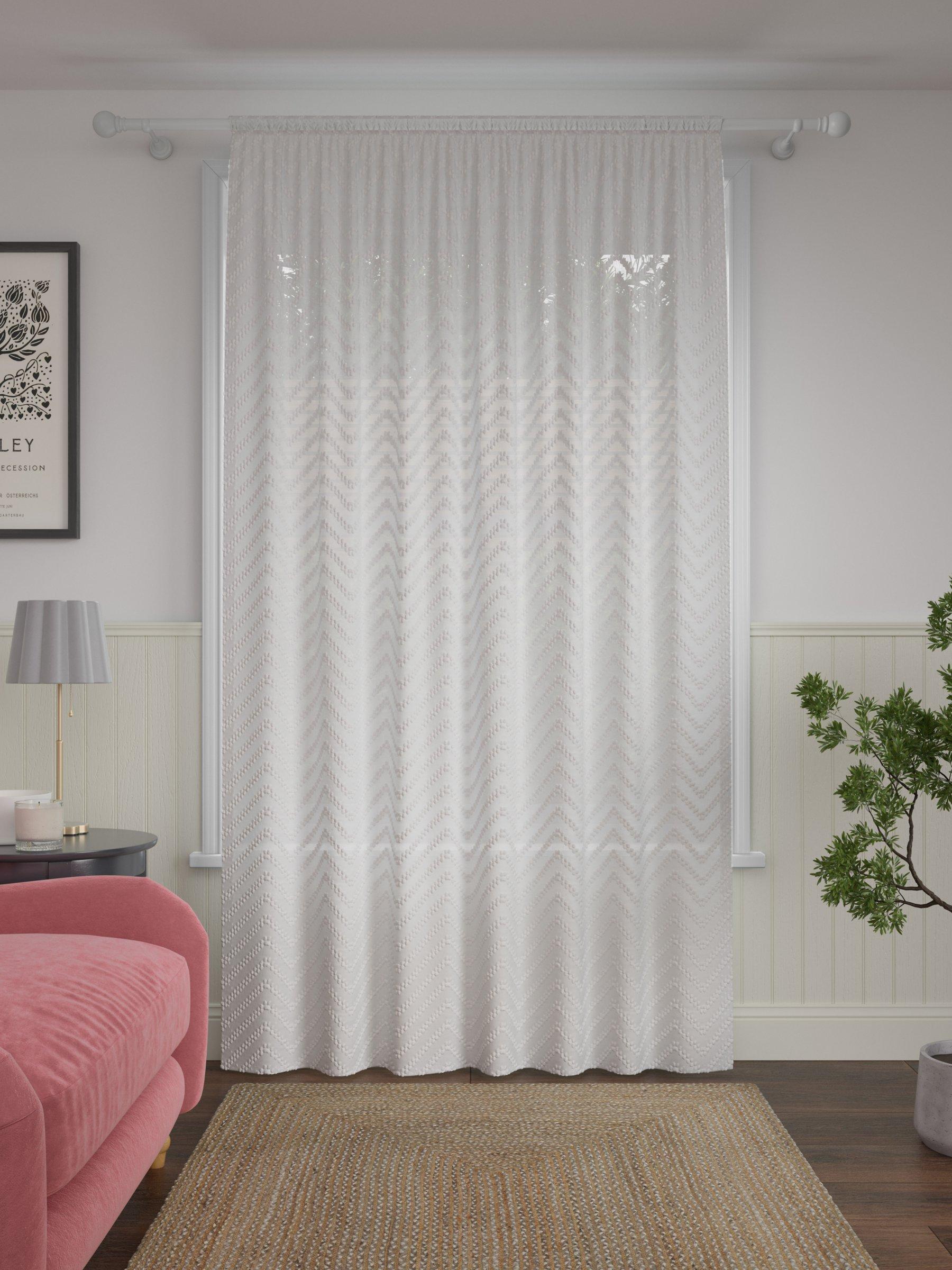 A sheer panel designed with a textured geometric pattern, creating an effortlessly chic look. The design has a simple easy to hang rod pocket header.