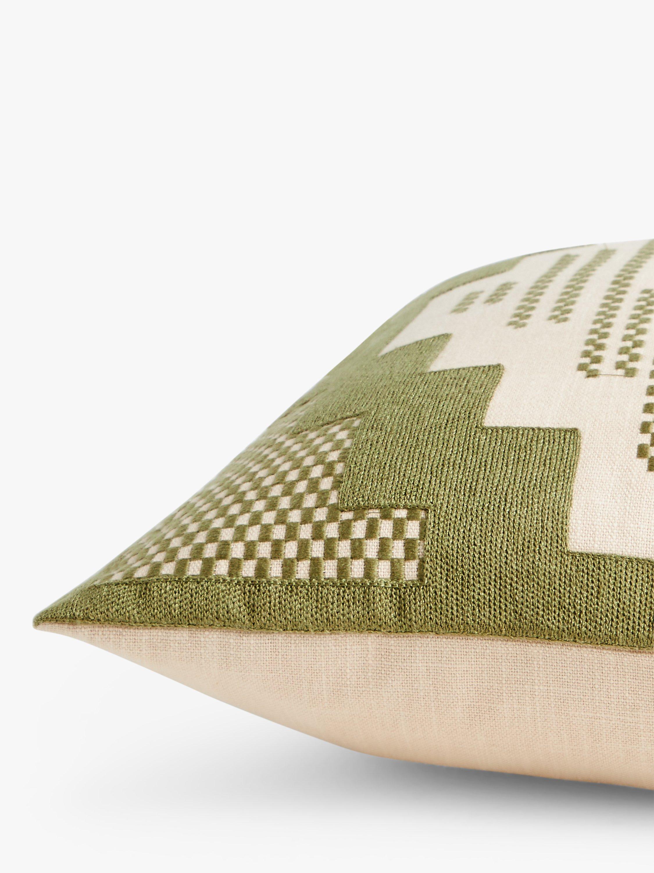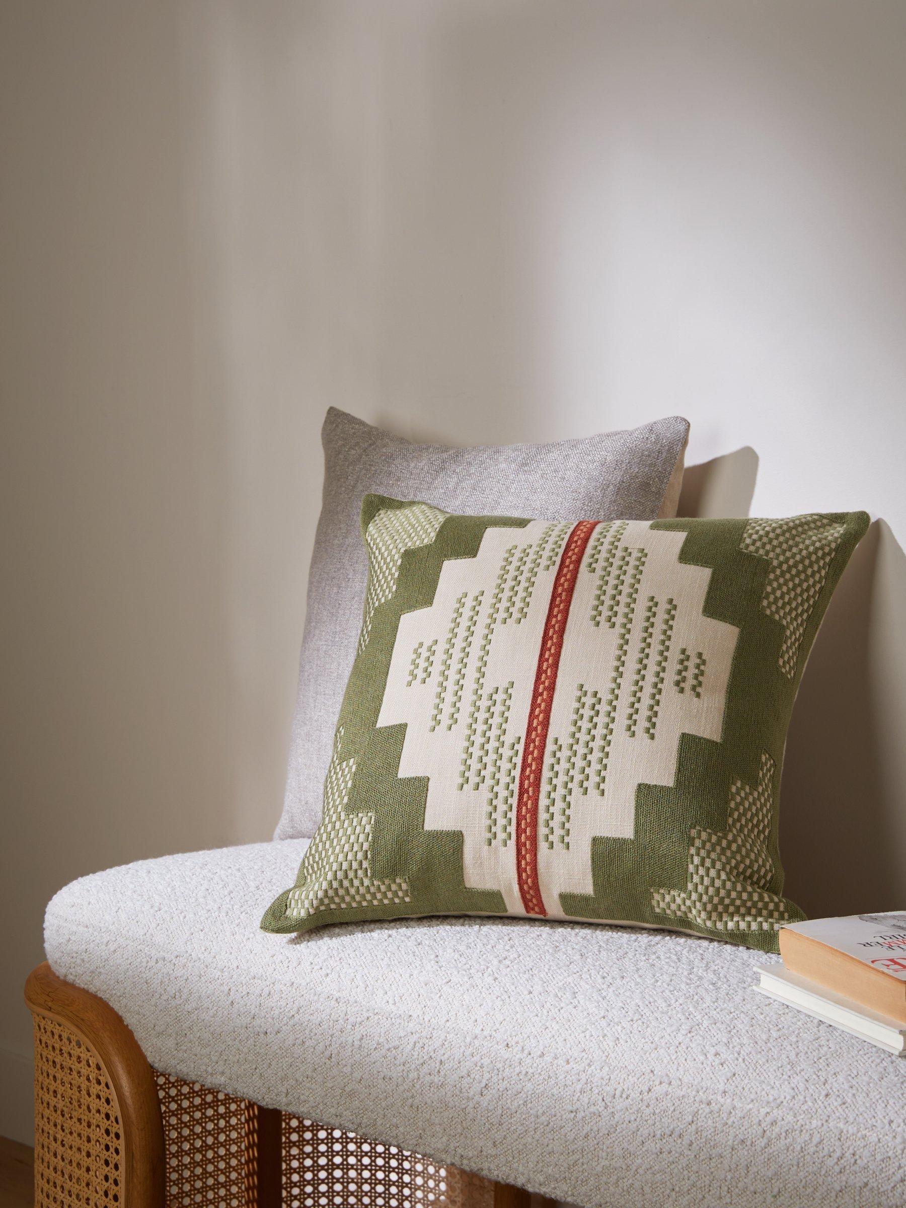 The geometric design of this cushion blends computerised embroidery with patchwork.
