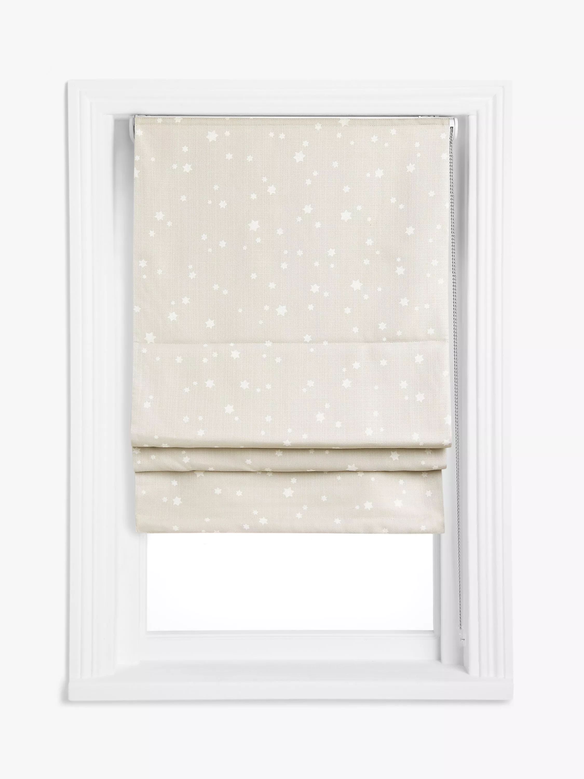 Twinkling stars feature on this blackout Roman blind which can be fitted inside or outside a window recess.