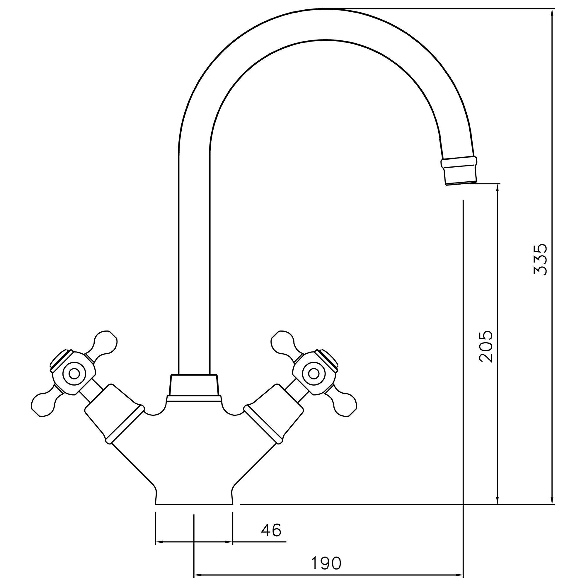 H335 x W190 x D46mm, Spout reach: 190mm, Height to end of spout: 205mm