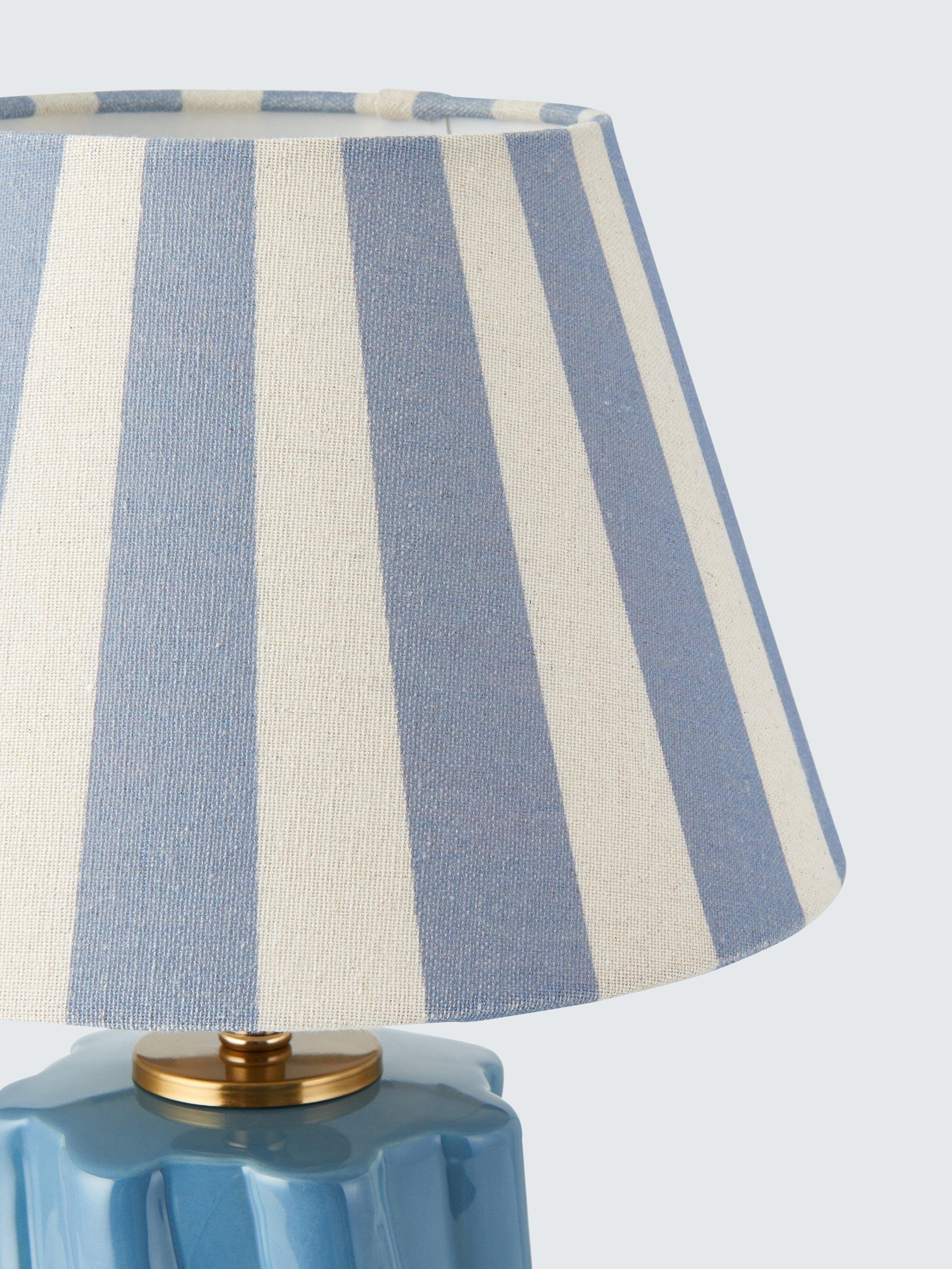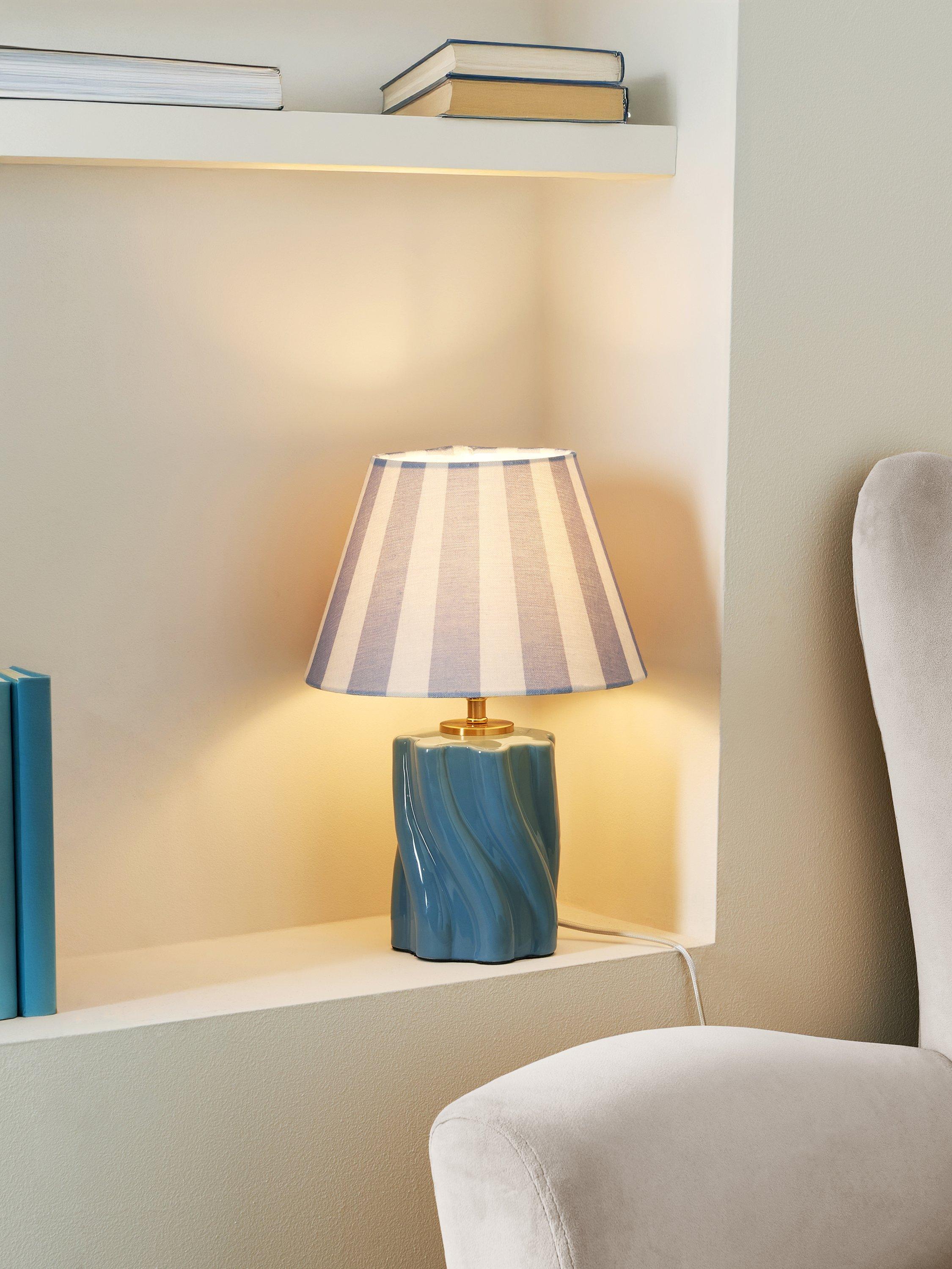 Fashionably nostalgic, our Twist ceramic table lamp has a gloss-glazed base complemented with a bold striped shade. We like the statement size and love to show this one off in the hallway, lounge or on a bedroom table. One ES LED bulb is required.