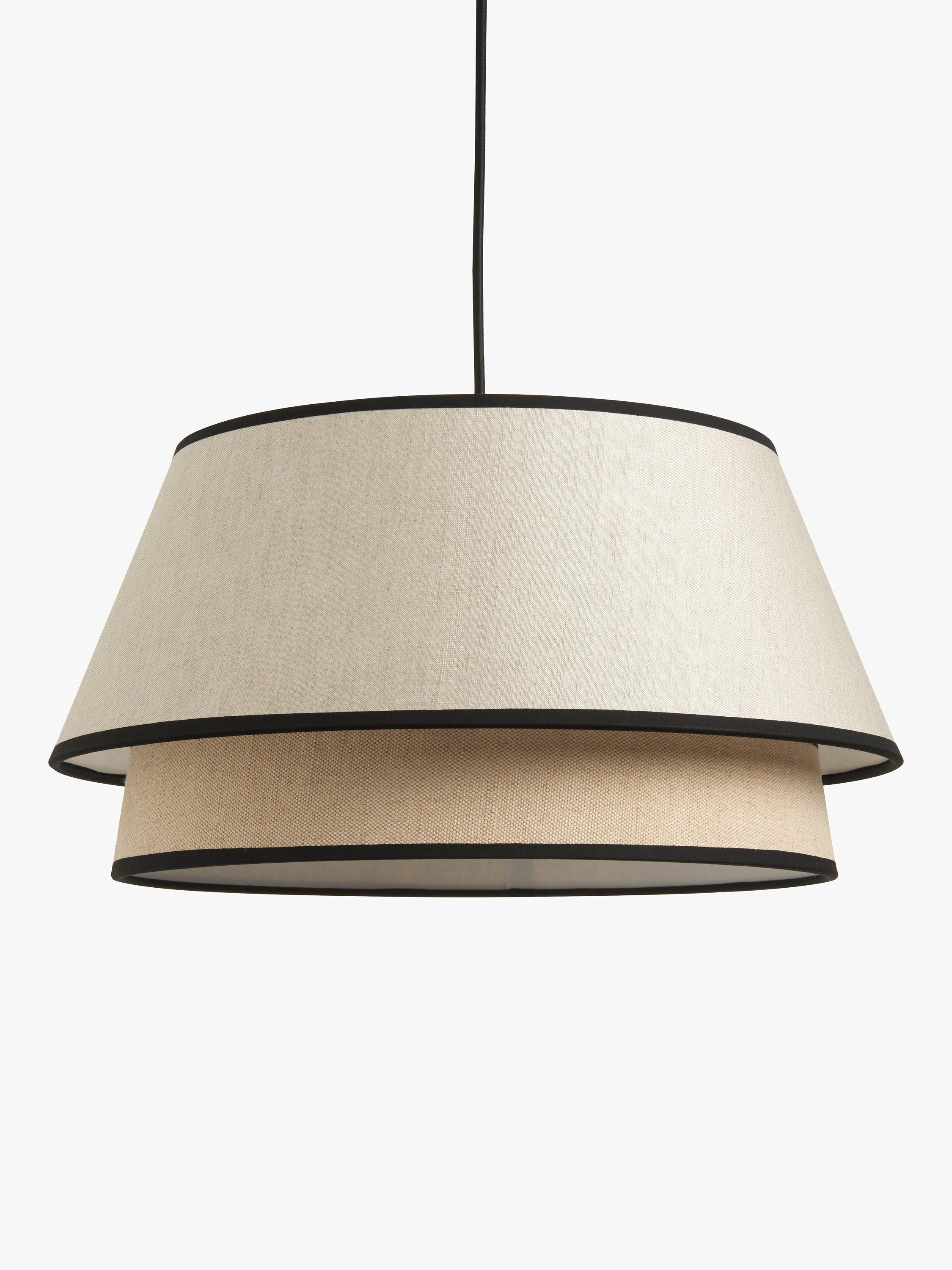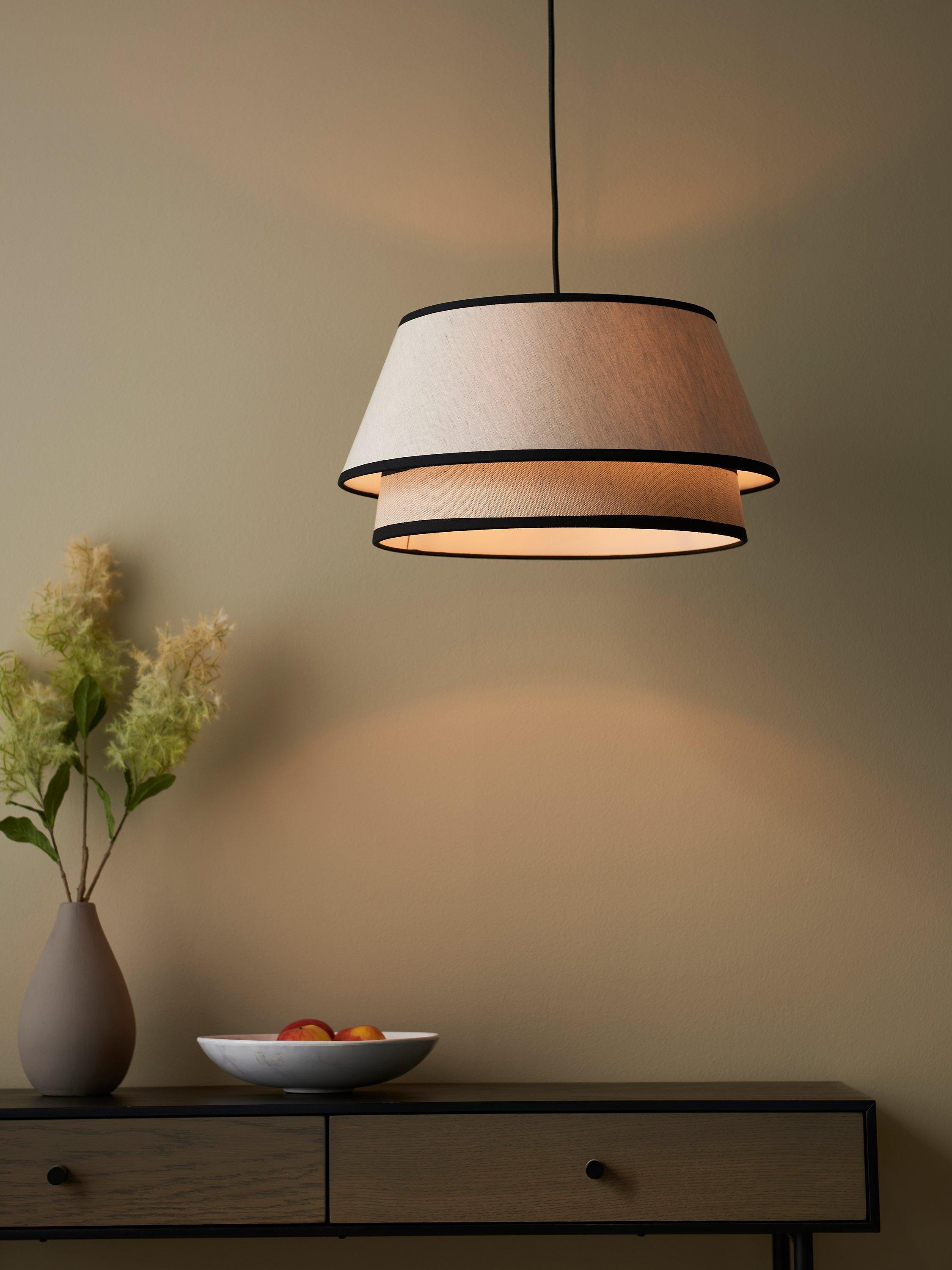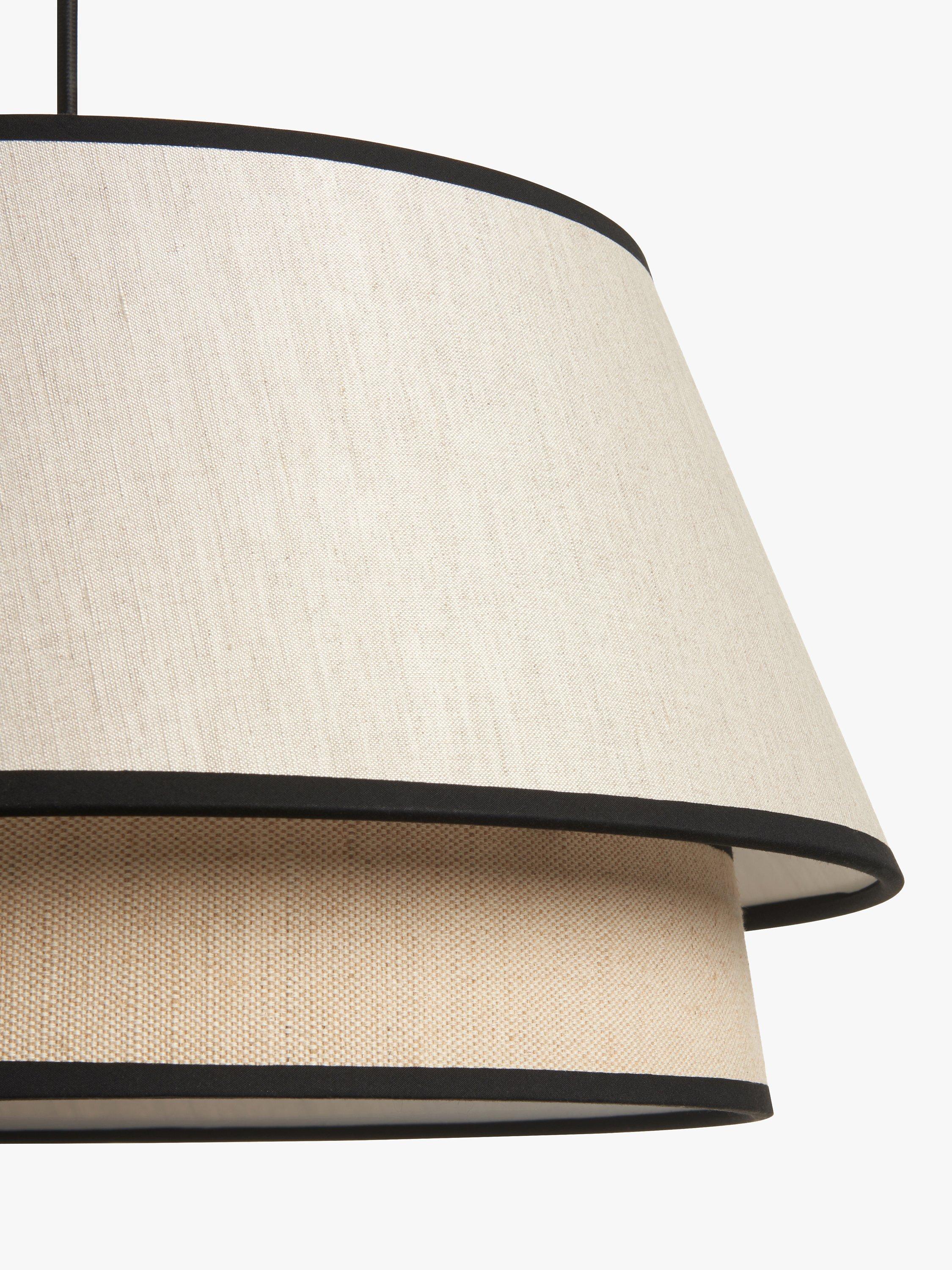 We've created this two-tier pendant from a mix of fabrics, using textured faux linen and natural cotton. Taking inspiration from Japanese design, both shades have a cotton taped edge which creates a distinctive contrast. The shades give out a warm glow when the light is switched on, filling your space with a relaxing ambience.