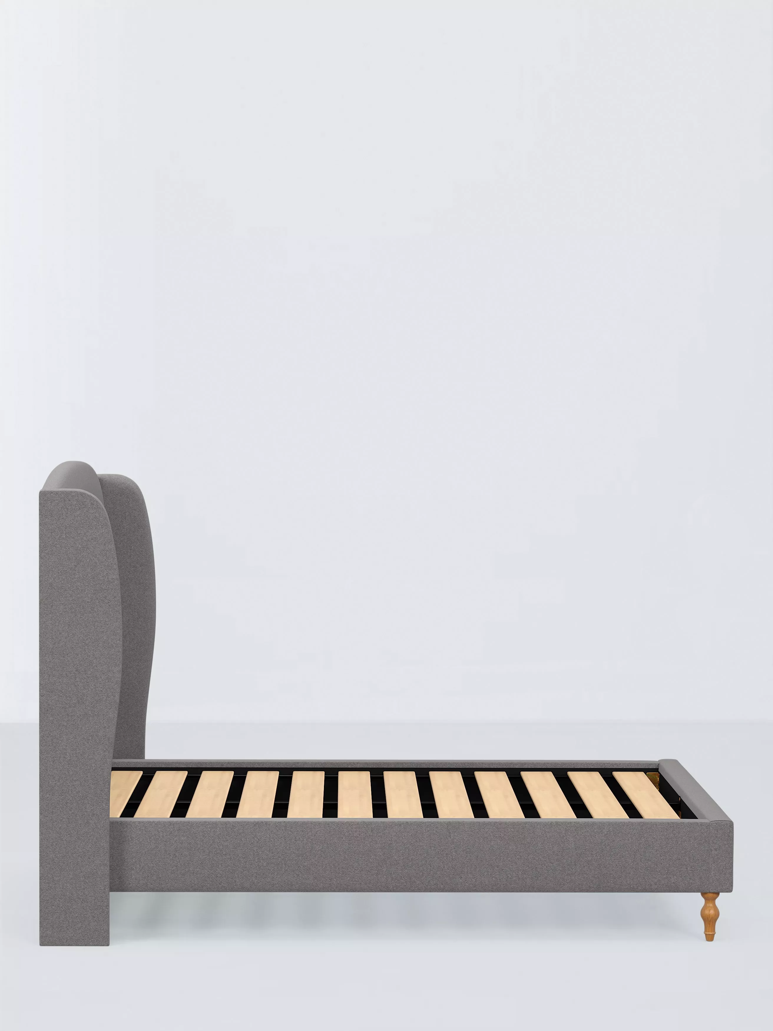 The Tyne bed frame features a smoothly curved winged headboard giving your sleeping space a touch of sophisticated class. It boasts a satisfyingly clean profile and twisted wooden legs and solid slats in the base ensure a firmer foundation for your mattress. Handcrafted in the UK, each frame is made to order by a team of skilled craftsmen.