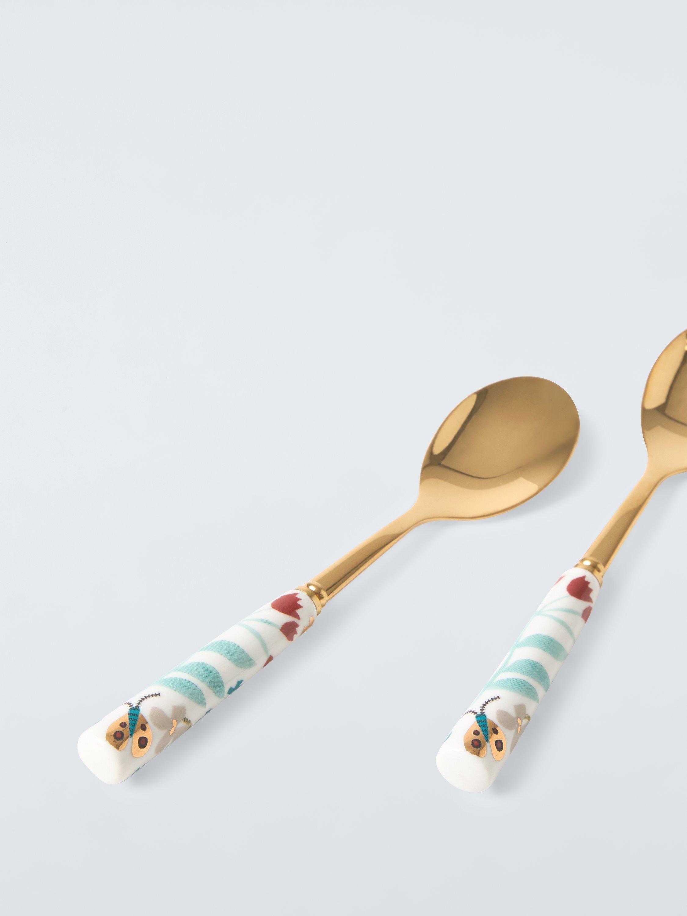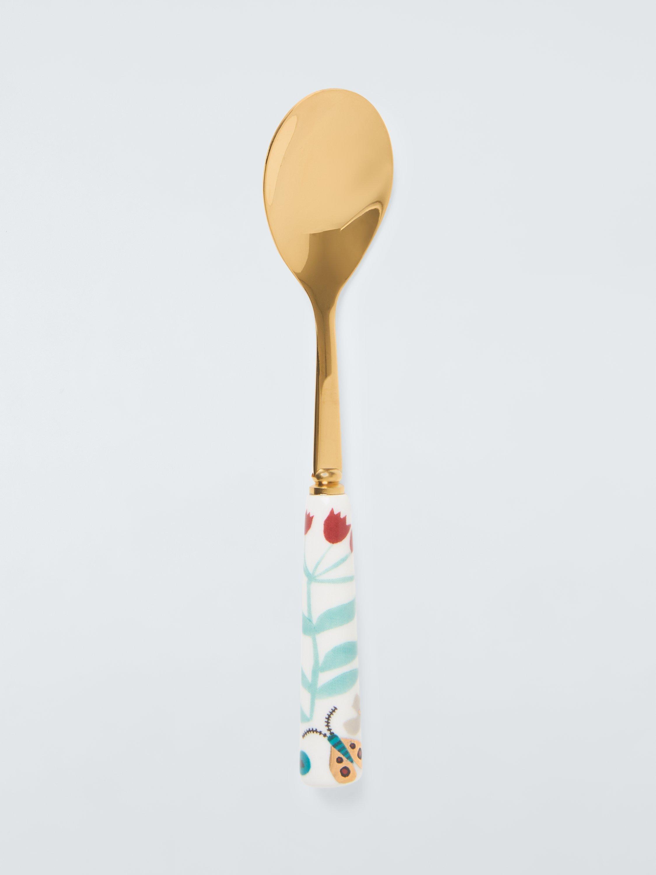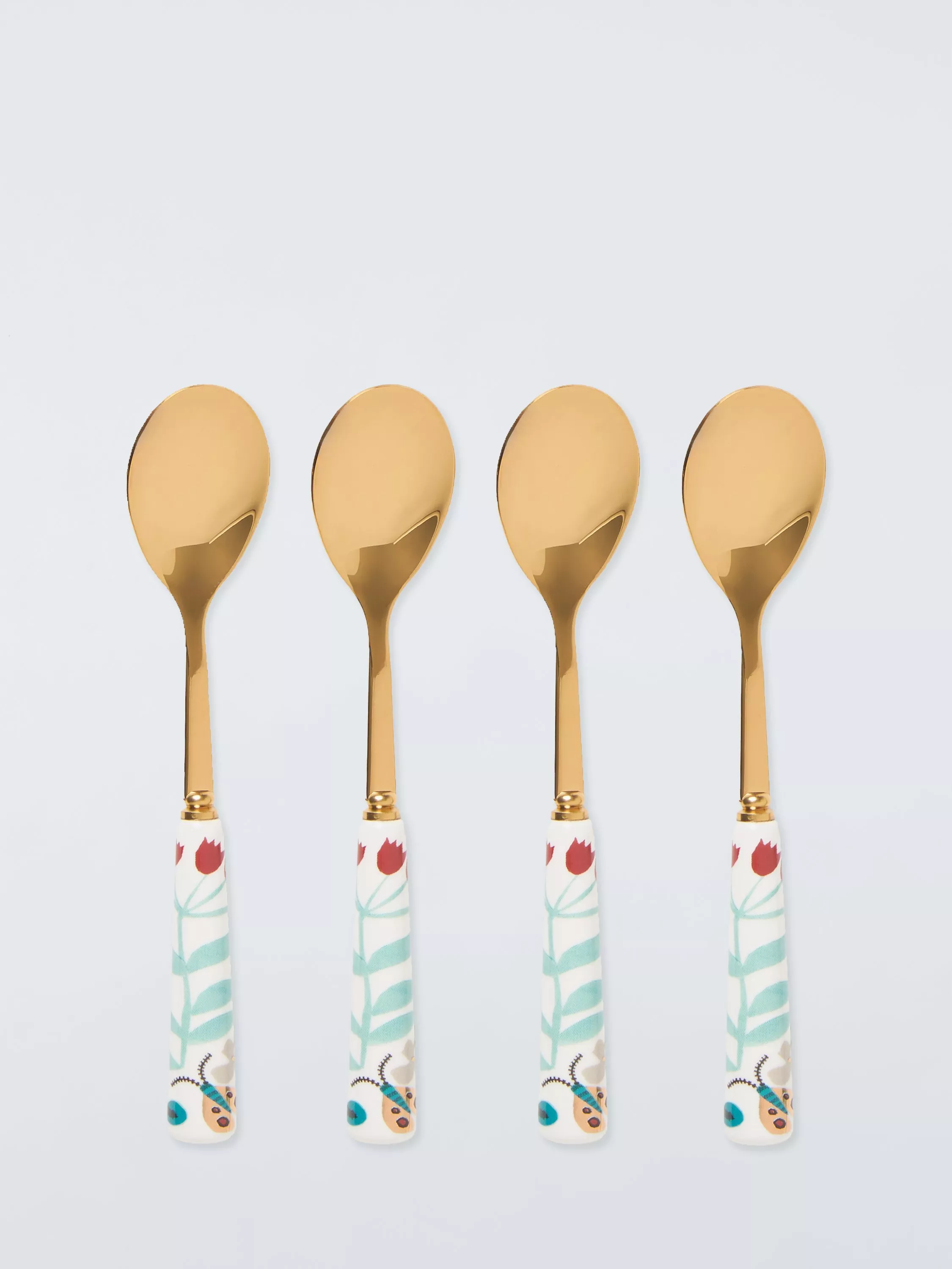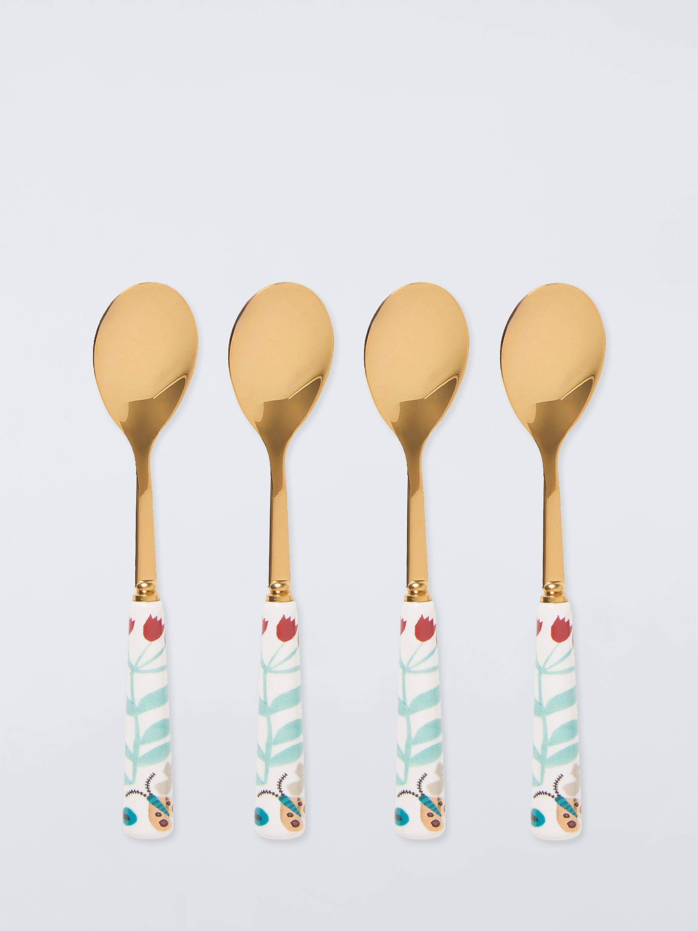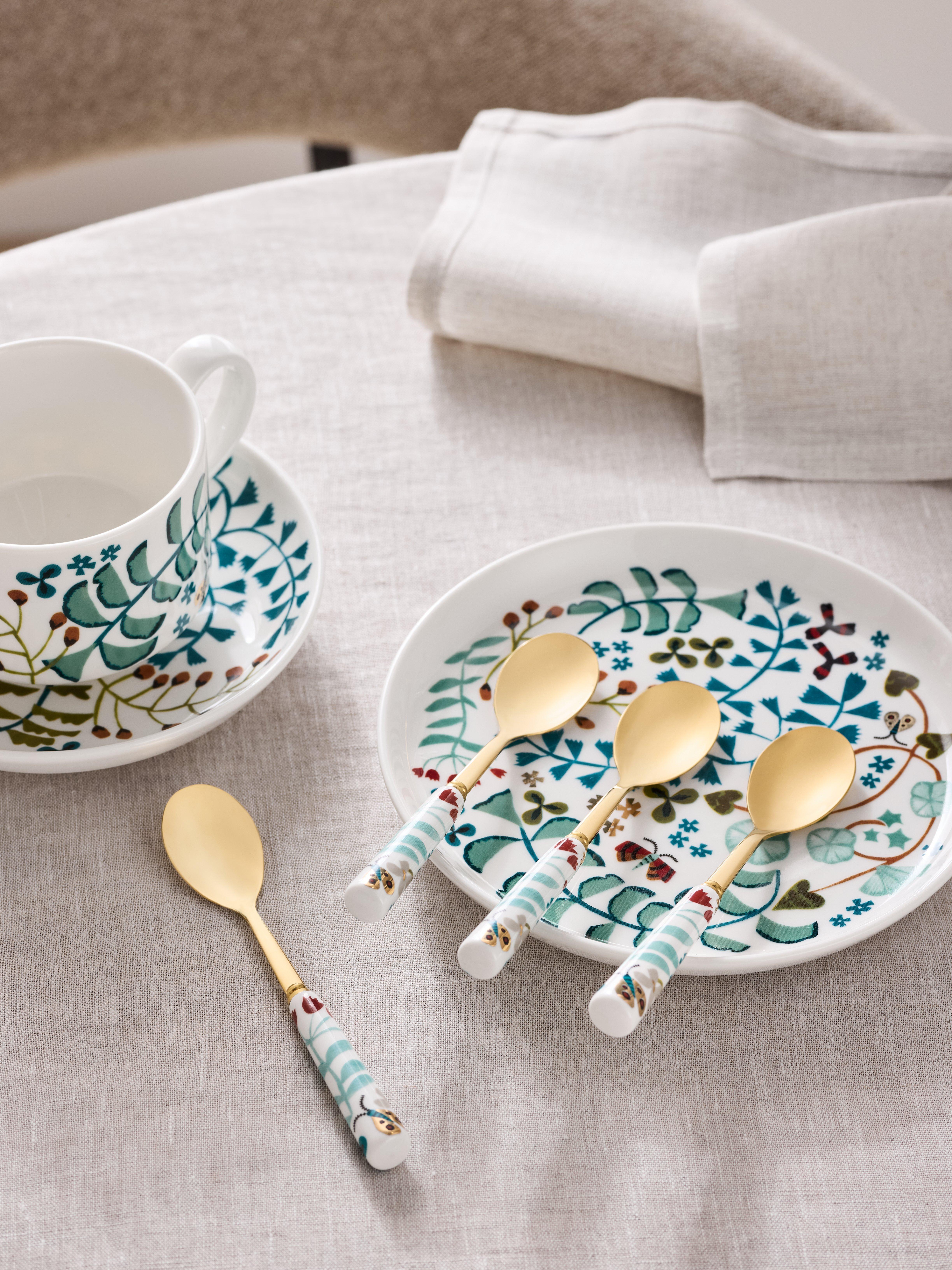 Four stainless steel teaspoons with a gold-toned finish. Featuring our nature-inspired Ulla print on the ceramic handles. They match our Ulla table linens, pastry forks and cake slice.
