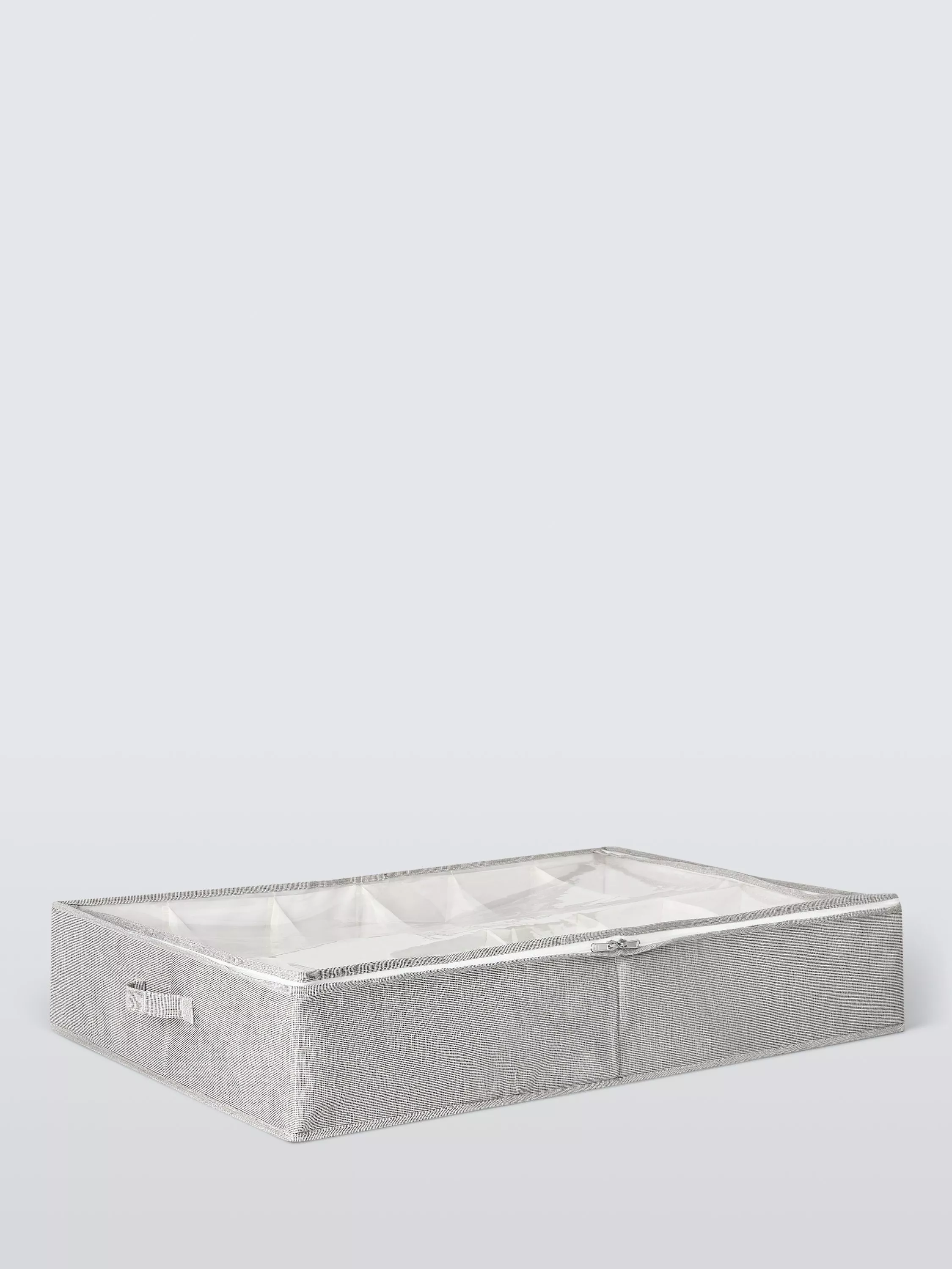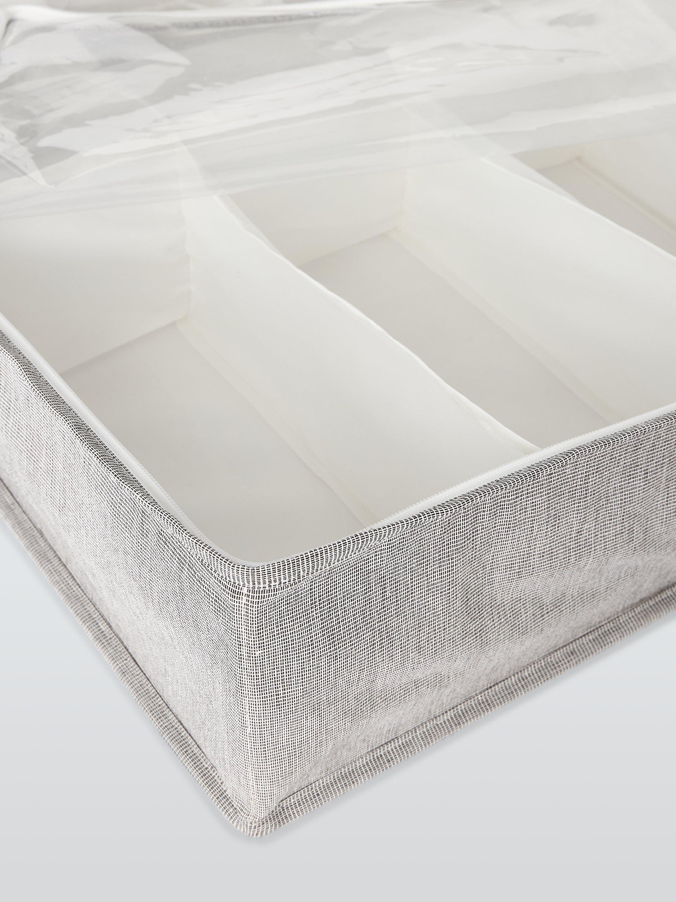 Keep out of season shoes and boots neatly tucked away and free from dust beneath the bed with this compartmentalised, zipped polyester storage bag. The clear top lets you see what's stored inside.