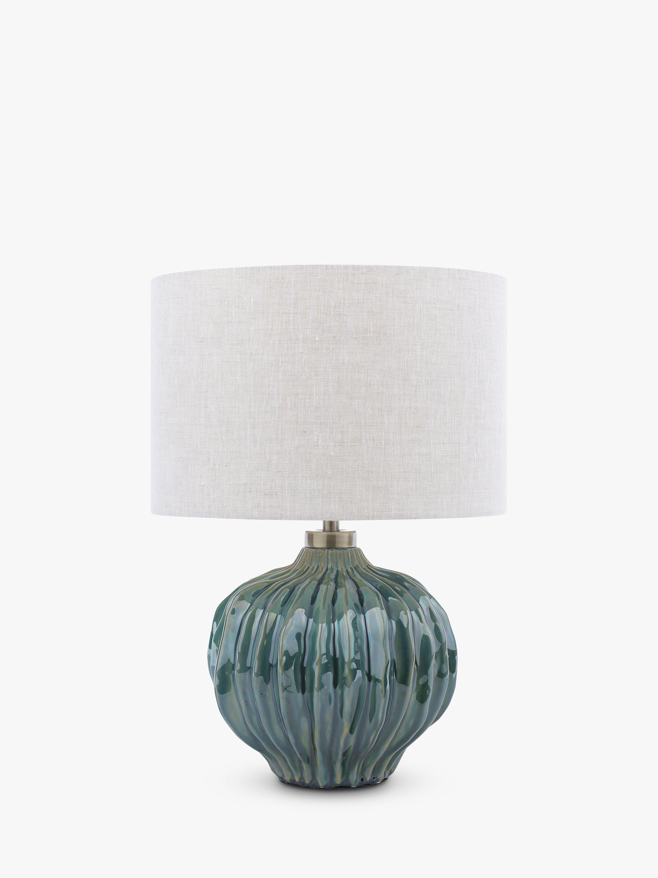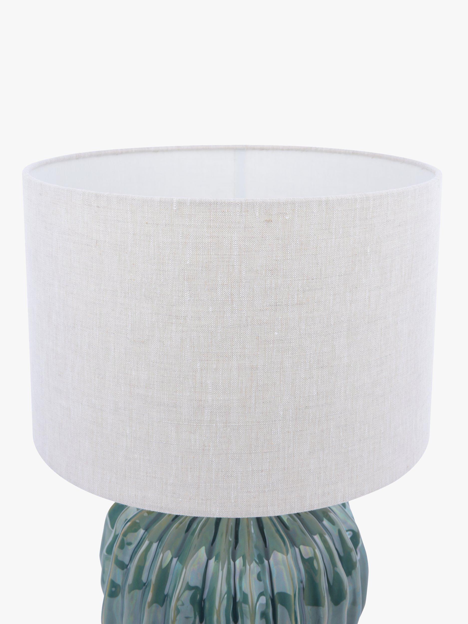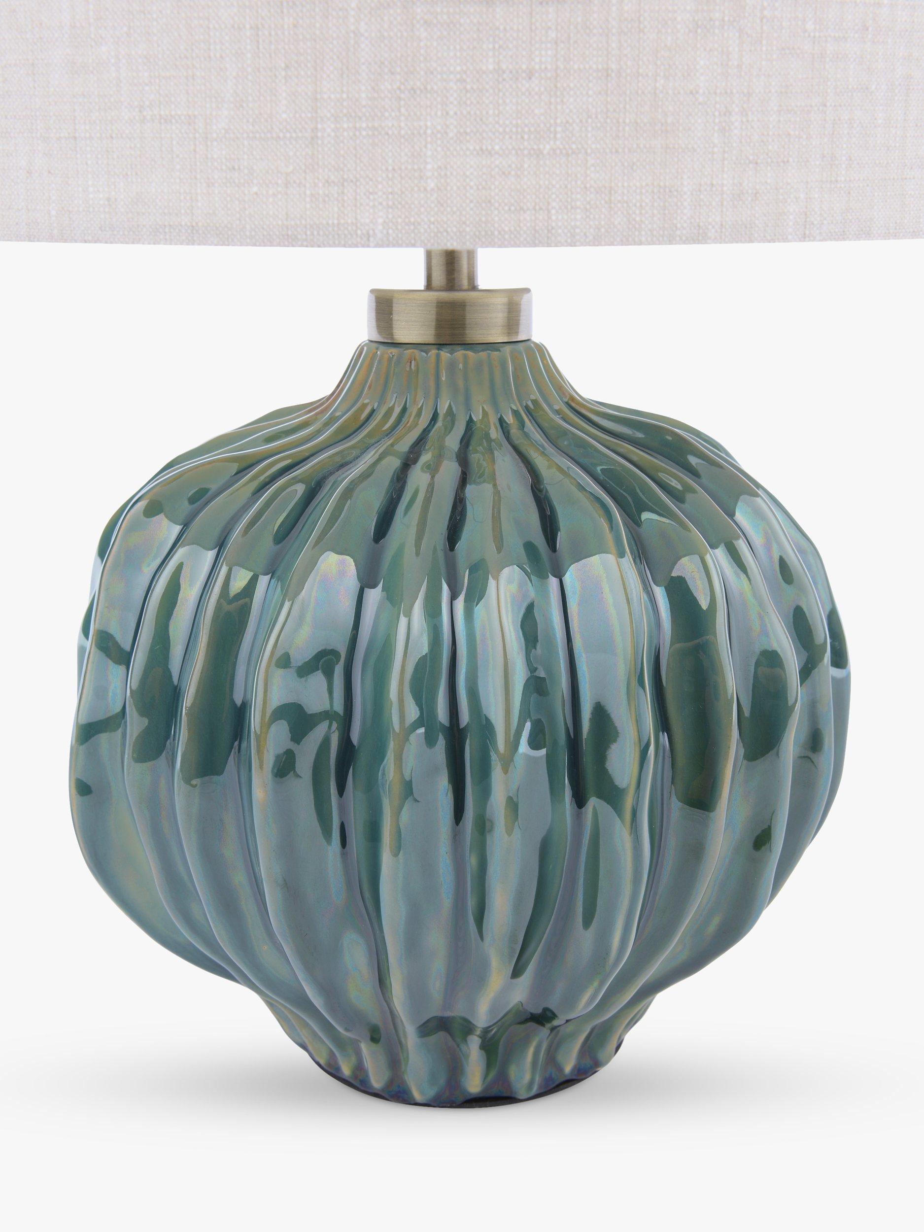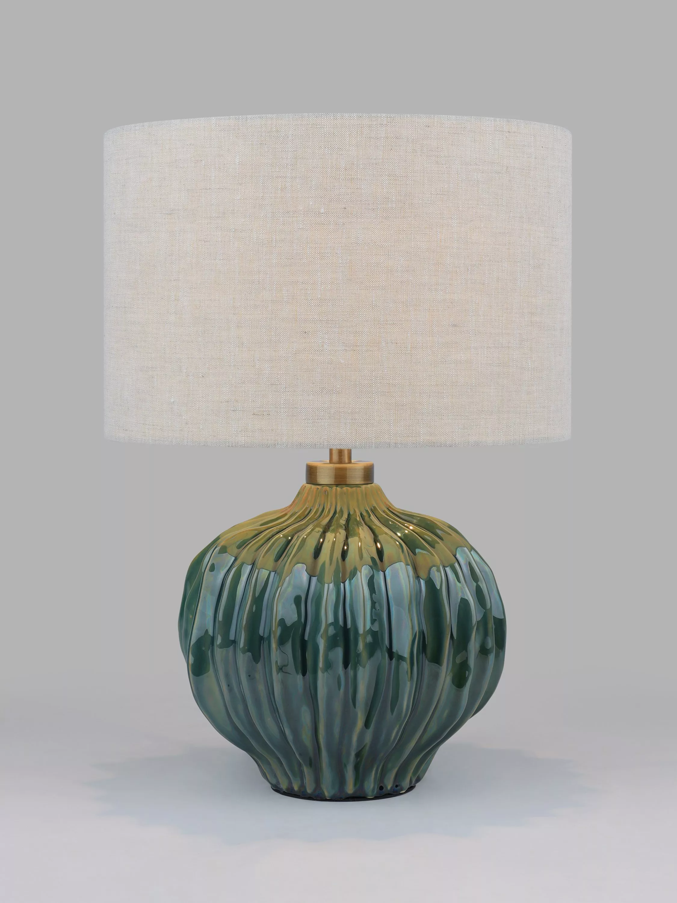 The organic shape, of this ceramic lamp base, has elegant ribbed edges that catch the detailing of the stunning reactive glaze. Finished with a textured linen shade, antique brass metalwork and fabric flex.
