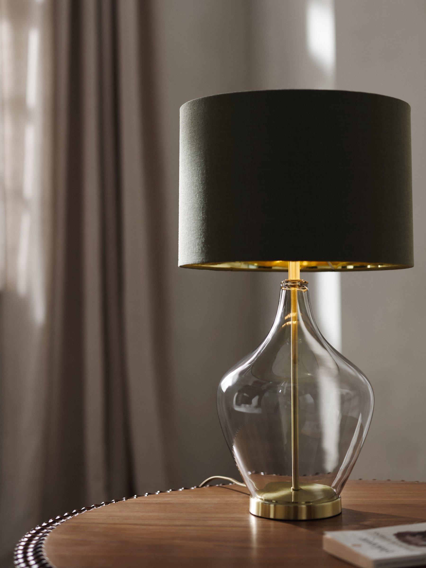Decorate your space with our Ursula table lamp. Designed with a glass base that's cut into a sleek, organic shape, its semi-transparent style showcases a central metal frame that has a retro satin brass finish. Providing a warm glow of light that's further enhanced thanks to the metallic lampshade lining, it's an eye-catching and timeless lighting solution for any room.