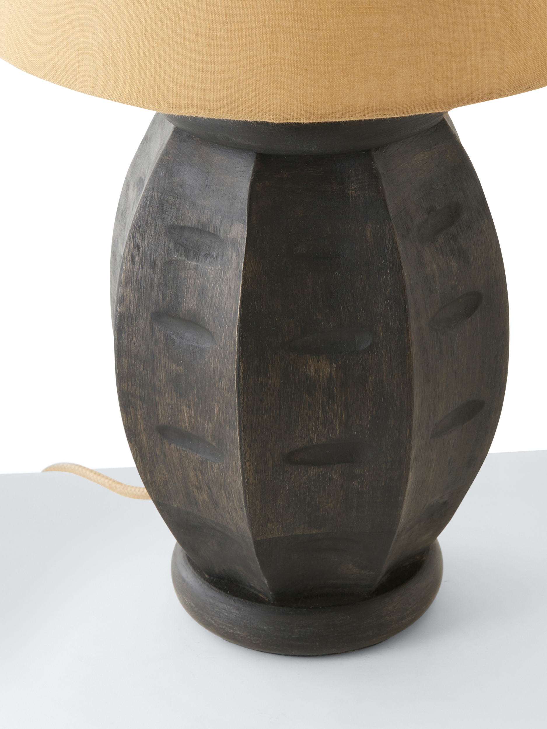 The Usike table lamp is handcrafted from sustainable solid mango wood. Its unique carved pattern and black stain has a rustic charm. Complimented by a faux linen lampshade and an aged brass toned plate, this lamp makes the perfect accent for your bohemian decor.
