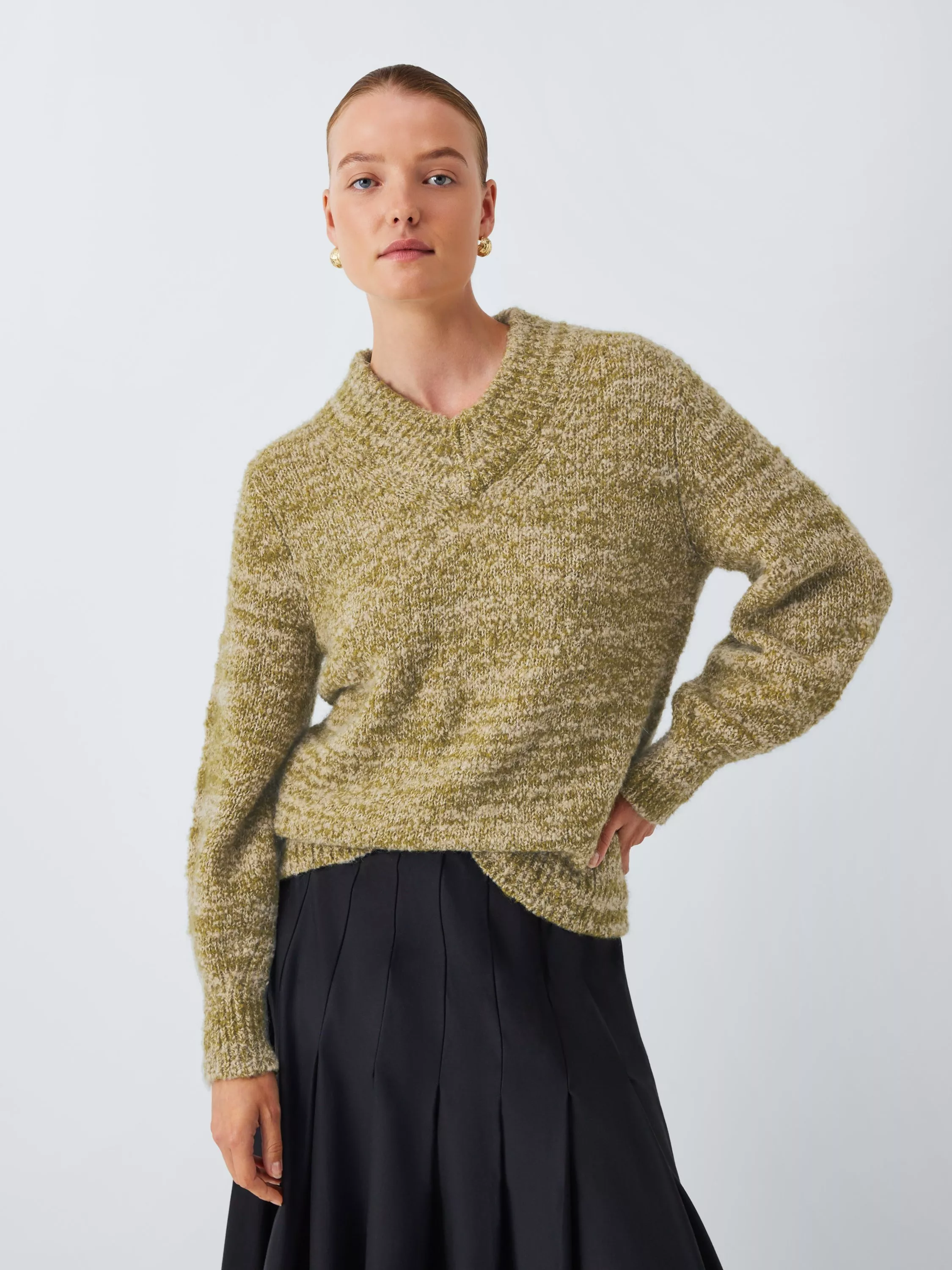 It's hard to beat a boucle fabric for cosiness. We've made this boucle jumper with a fabric blend that includes naturally temperature-regulating wool, luxurious and warm mohair, and nylon, which adds softness to the yarn. Finished with a ribbed knit V-neckline, hem and cuffs.