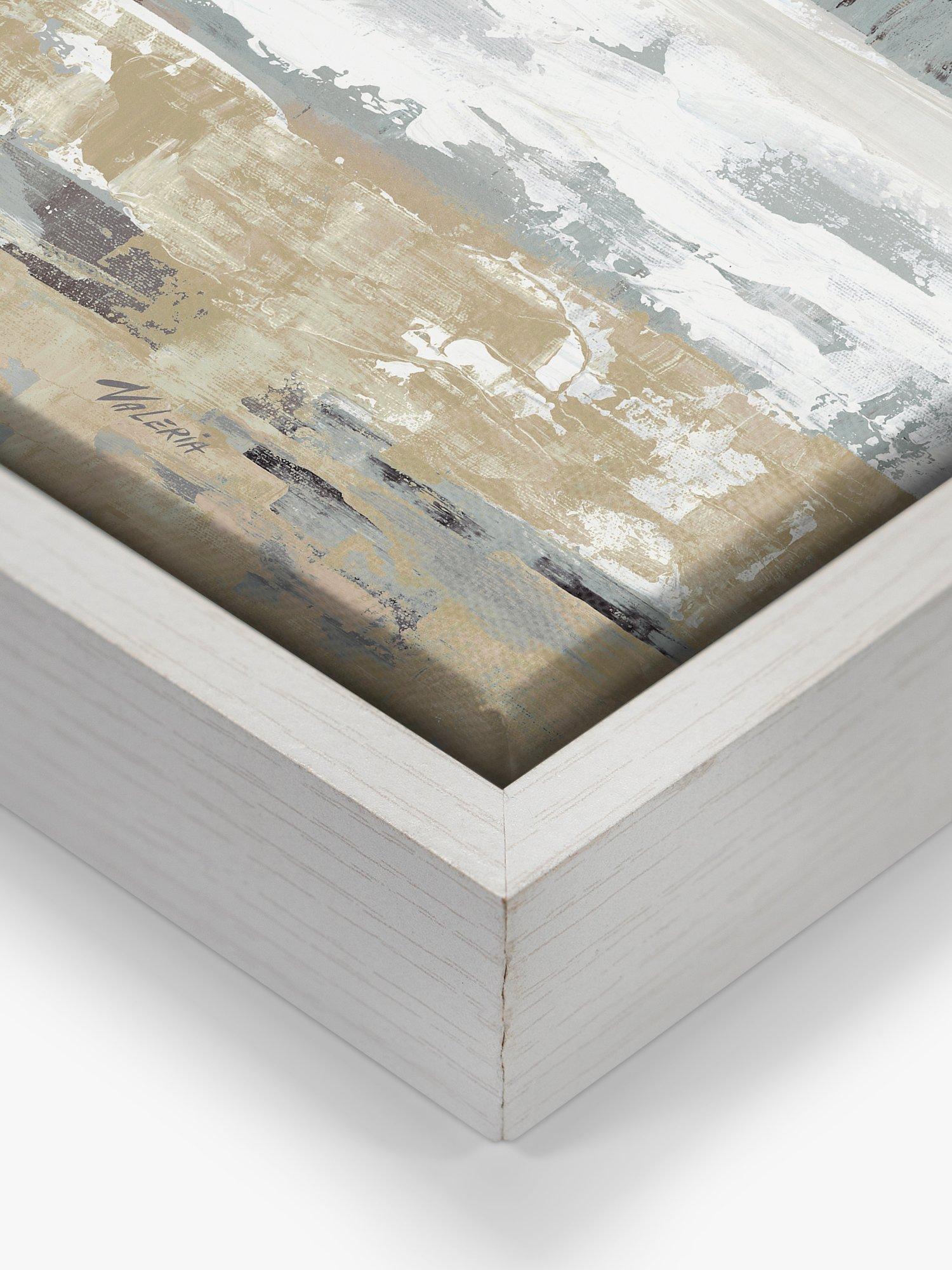 An abstract coastal view by artist Valeria Mravyan in shades of blue, printed on canvas, float mounted and presented in a light wood-effect frame.