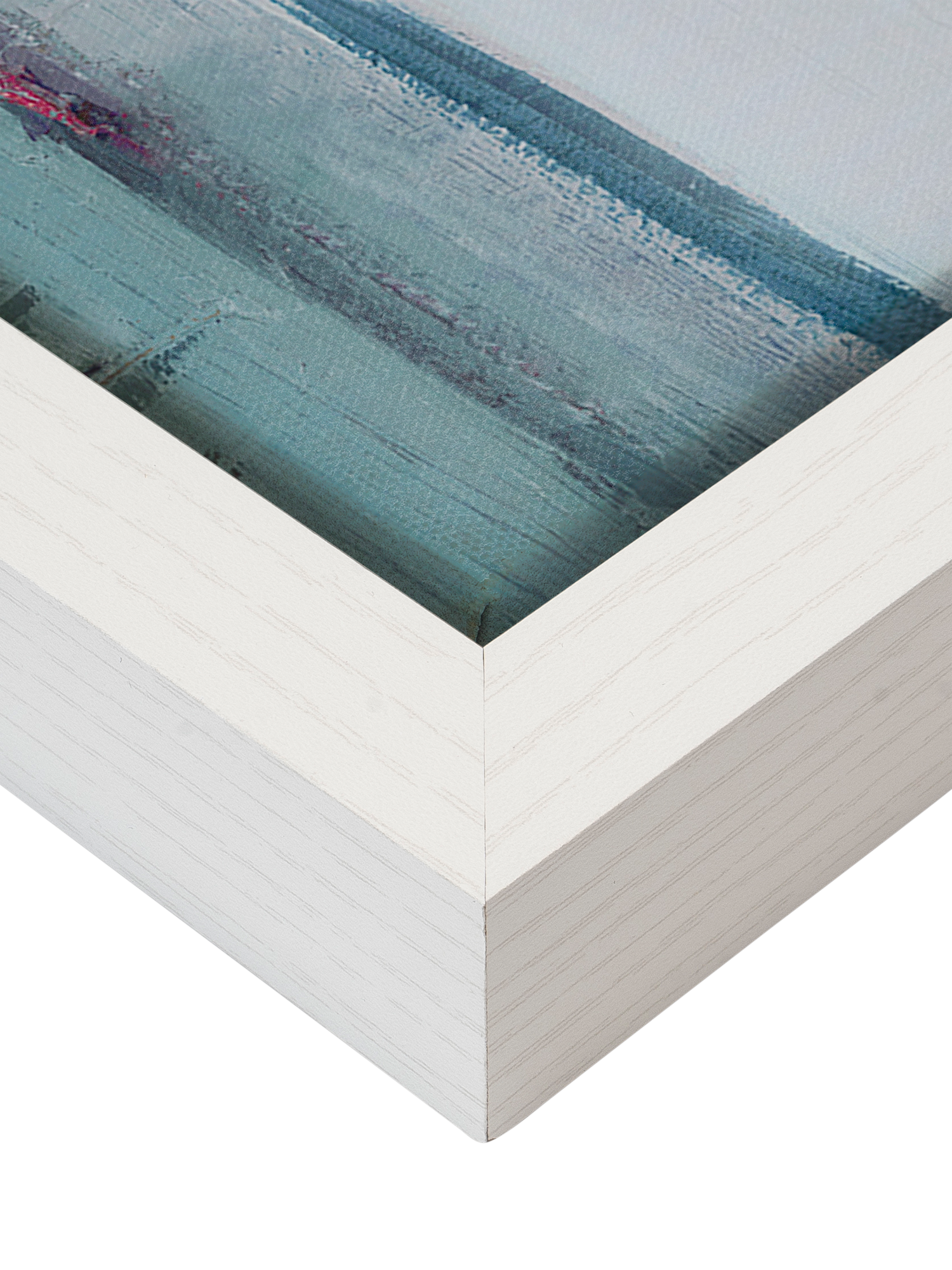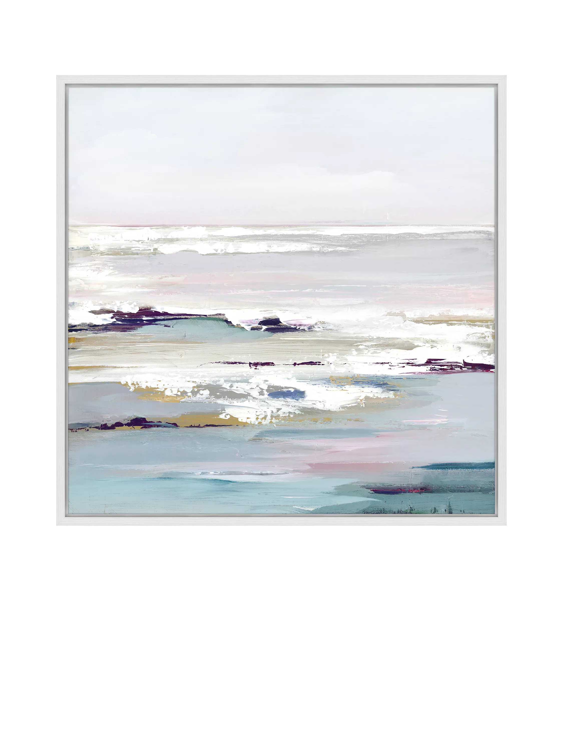 An abstract seascape view by artist Valeria Mravyan in shades of purple, printed on canvas, float mounted and framed.