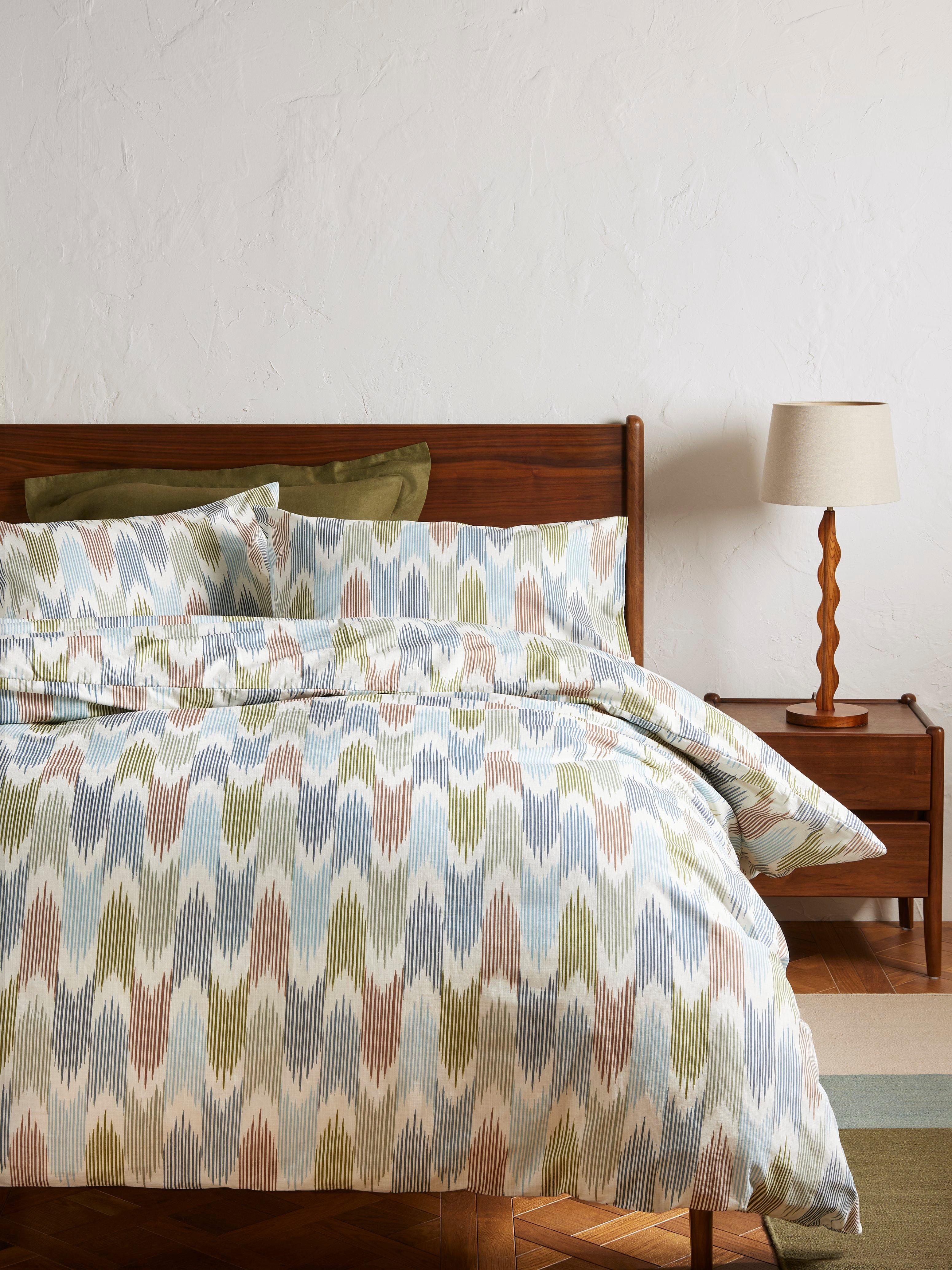 This Ikat-style stripe design brings a fresh and bright spring switch up for brighter, lighter days.