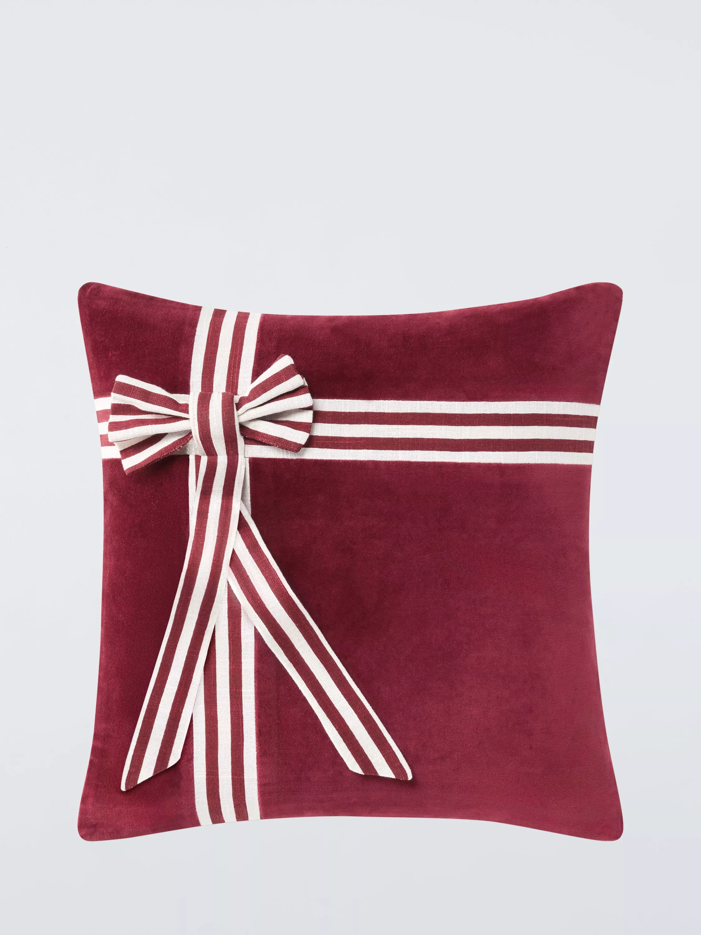 All done up like a special Christmas gift, this festive cushion is made from velvet and finished with a striped, woven bow.