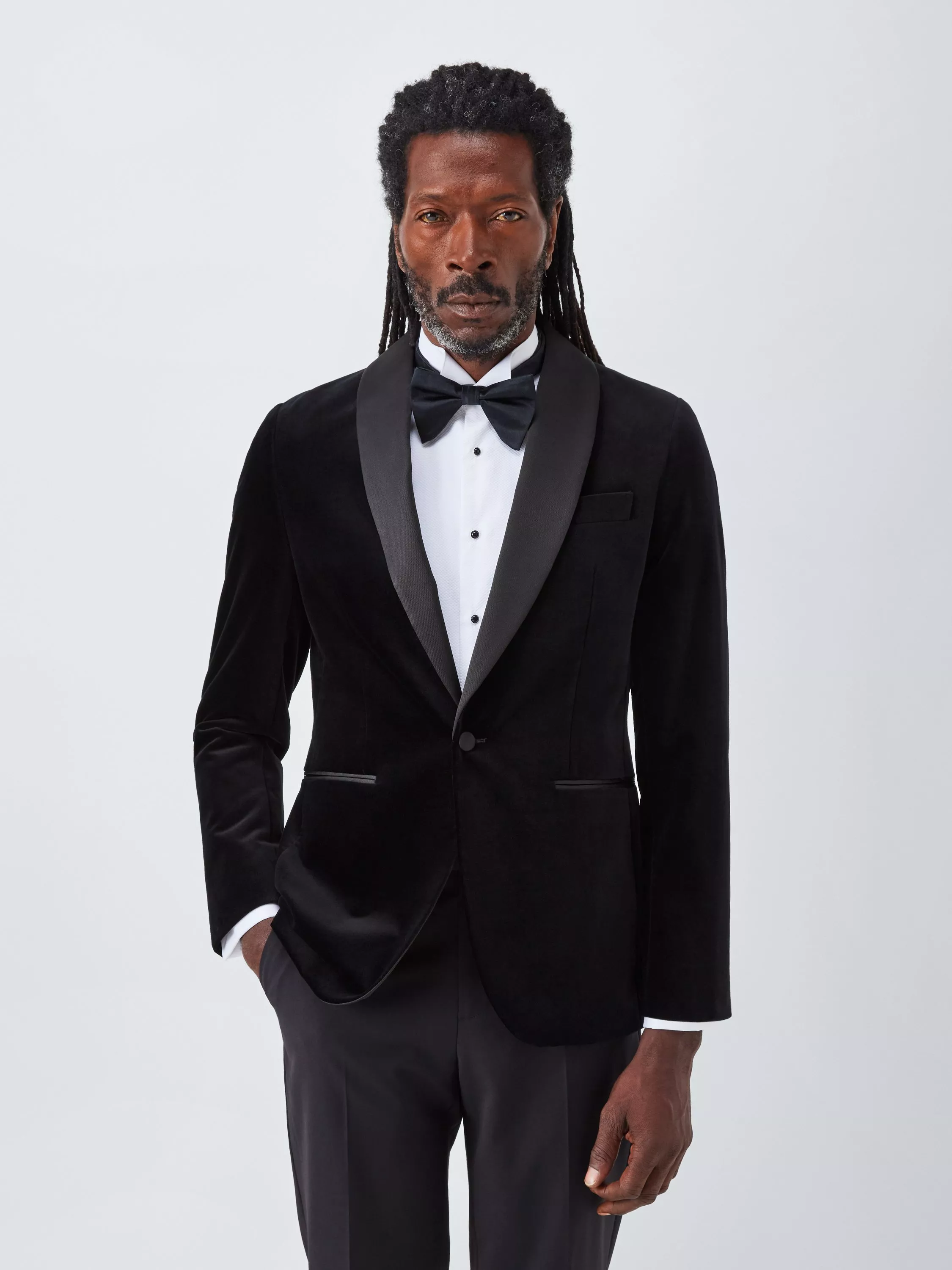 This velvet dinner jacket is styled with satin shawl lapels, jet pockets at the hip and a single welt pocket at the chest. It also benefits from satin buttons and double vents at the back.
