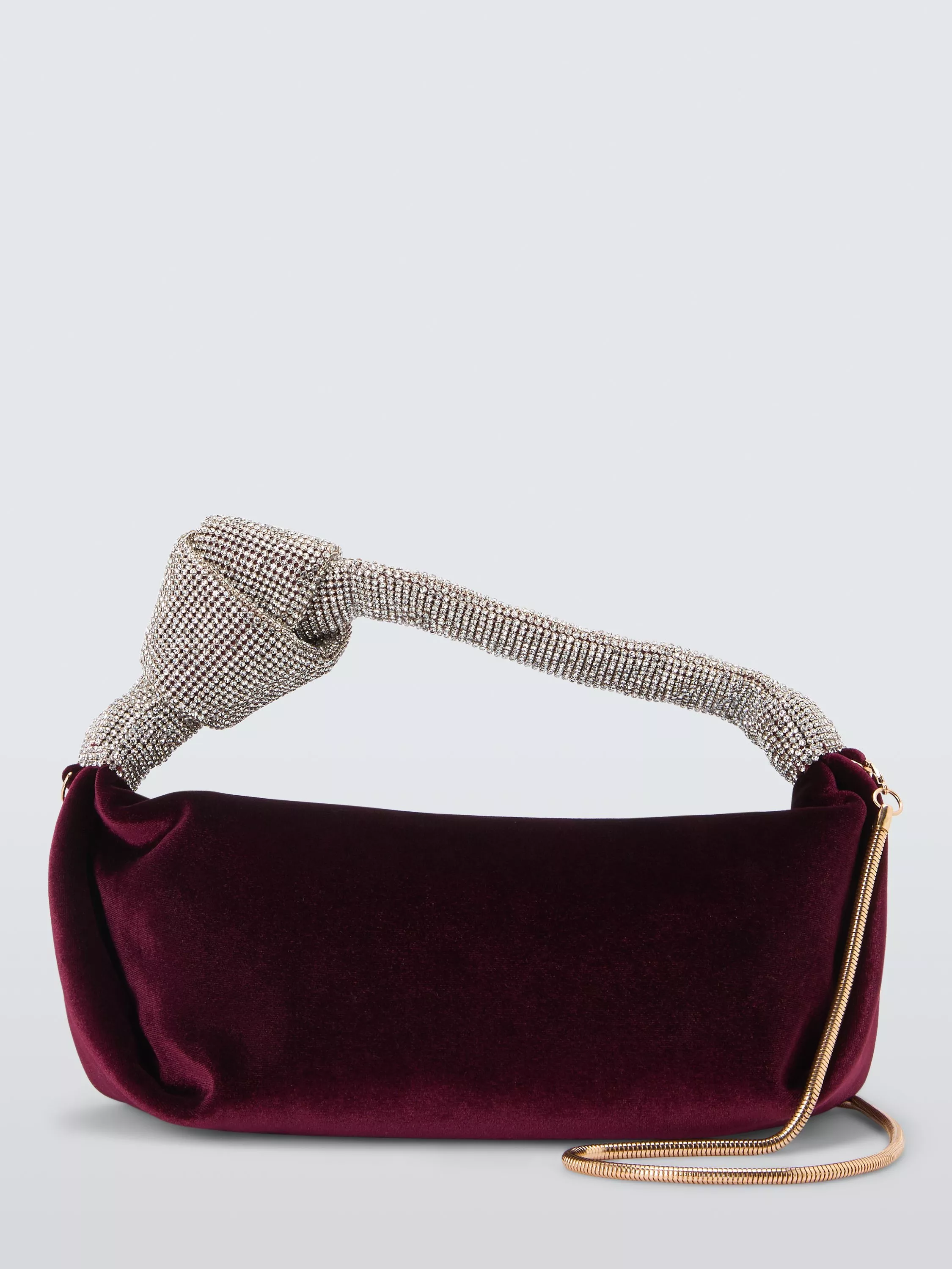 Carry evening essentials easily with this velvet clutch bag. With a soft lining and a secure zip fastening to keeps valuables safe, it also features a heavily embellished knot top handle and an adjustable multiway chain strap for flexible use for your needs, whether held close or slung over your shoulder.