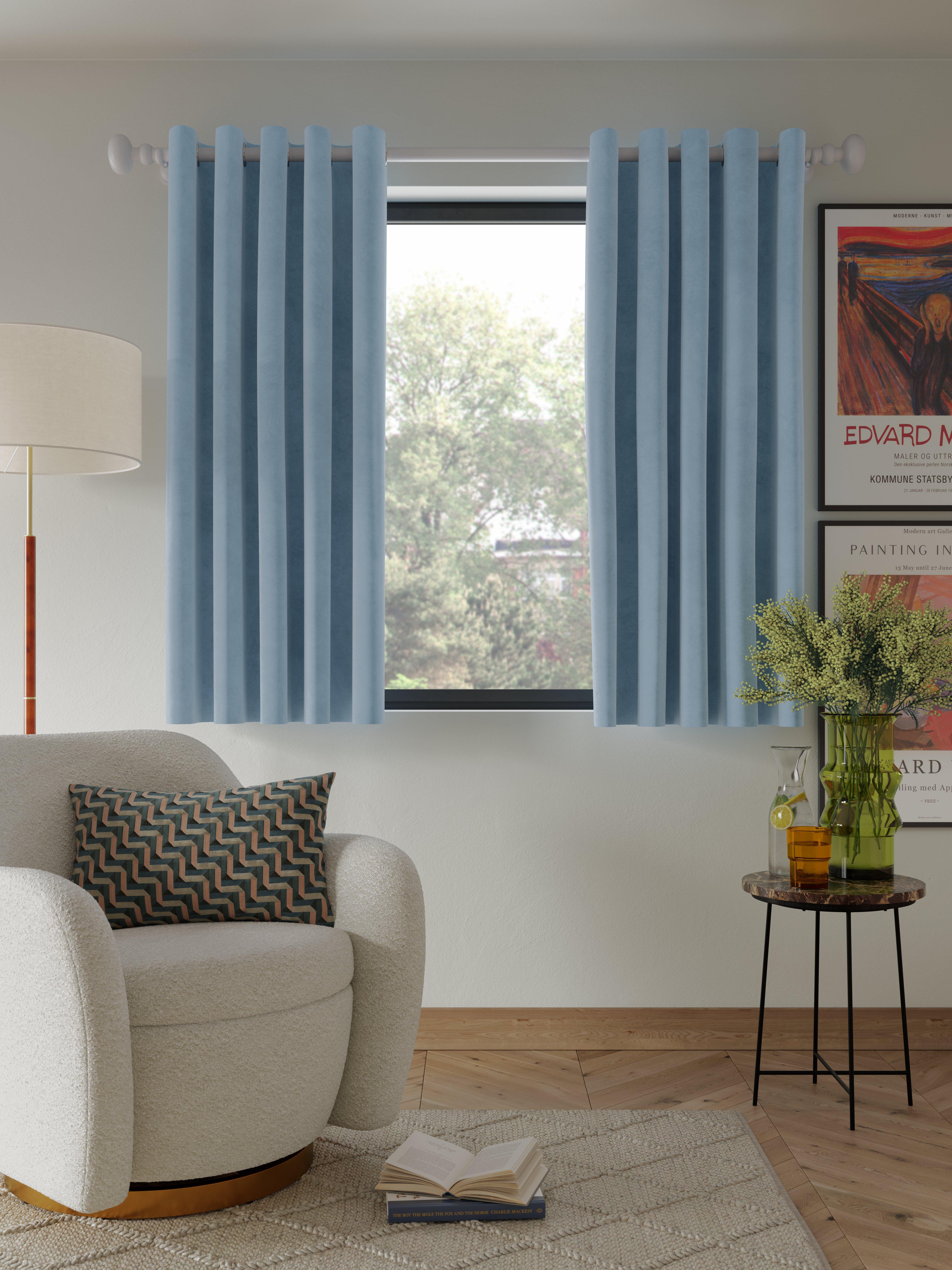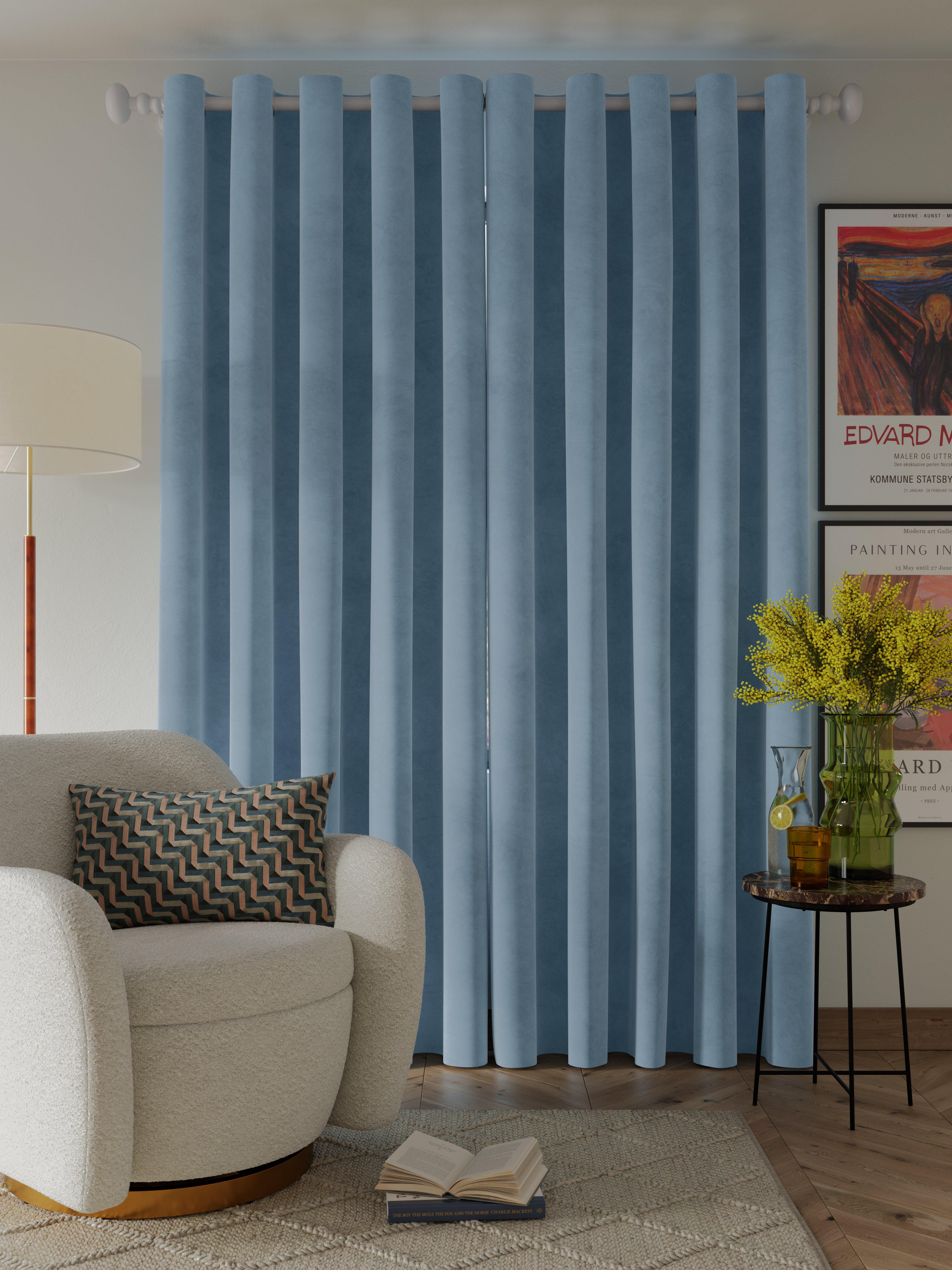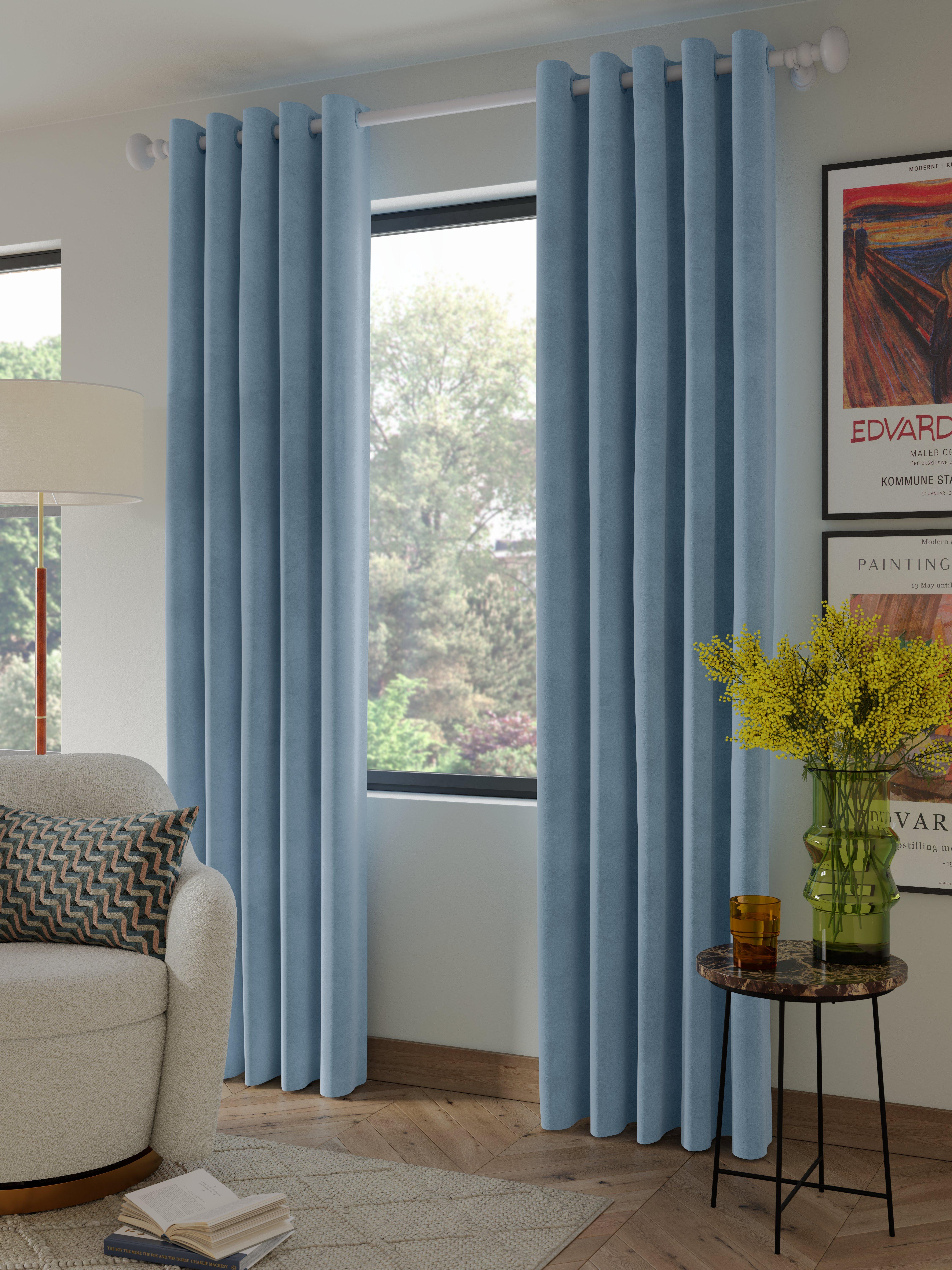 Plain-coloured eyelet curtains made from lustrous polyester velvet. The lining adds the perfect finish, improving the drape and enhancing the vibrancy of the curtain.