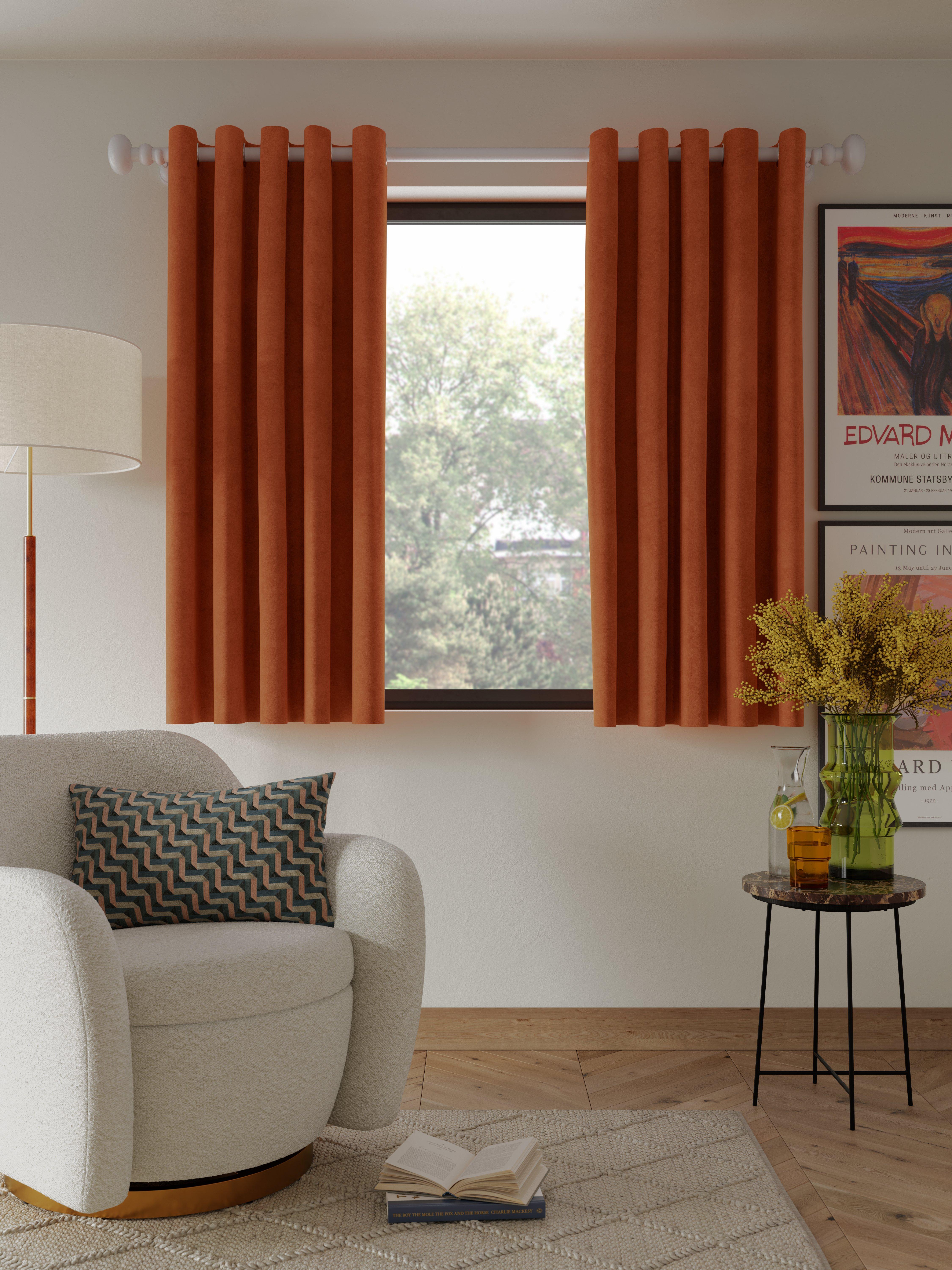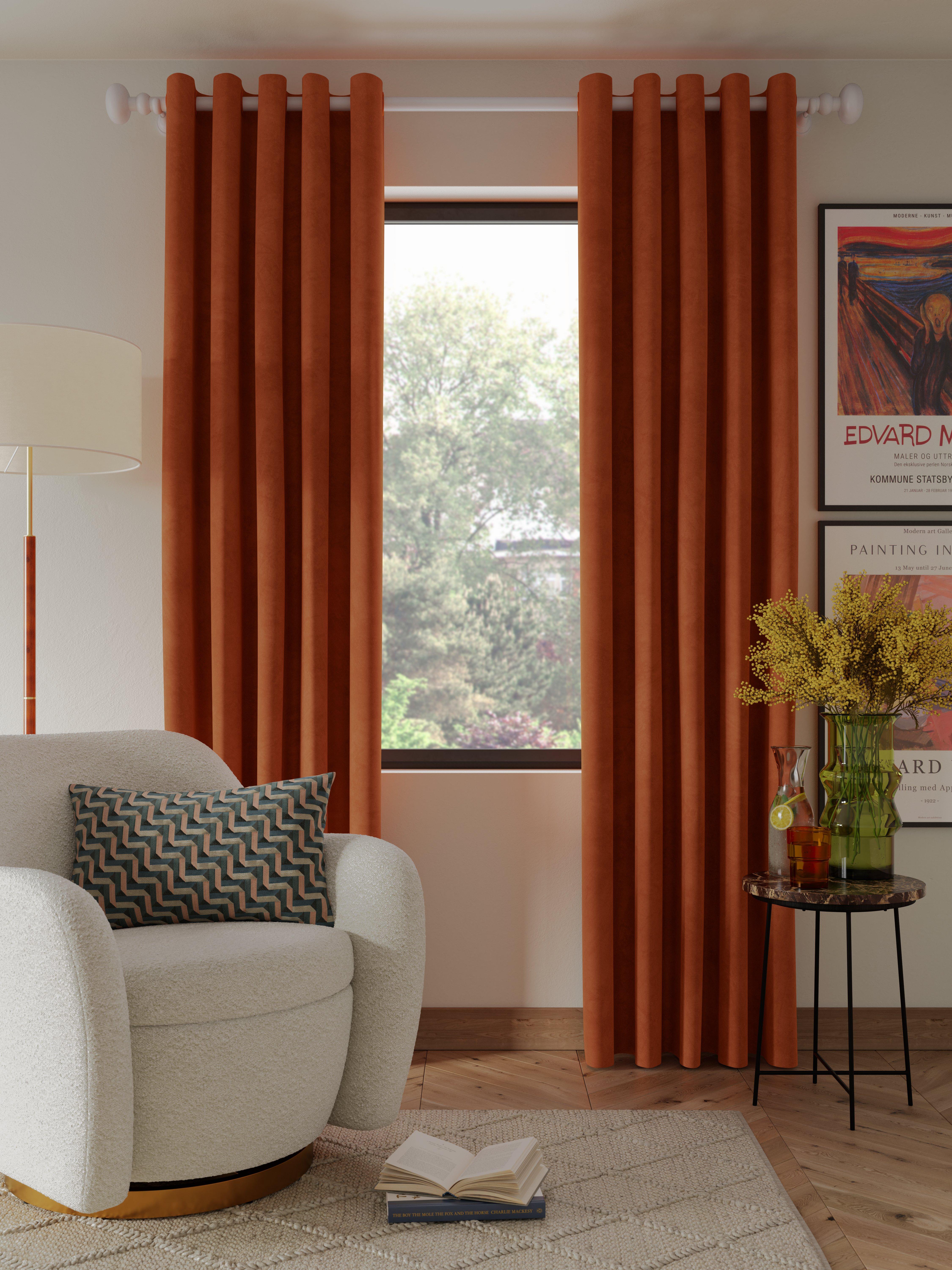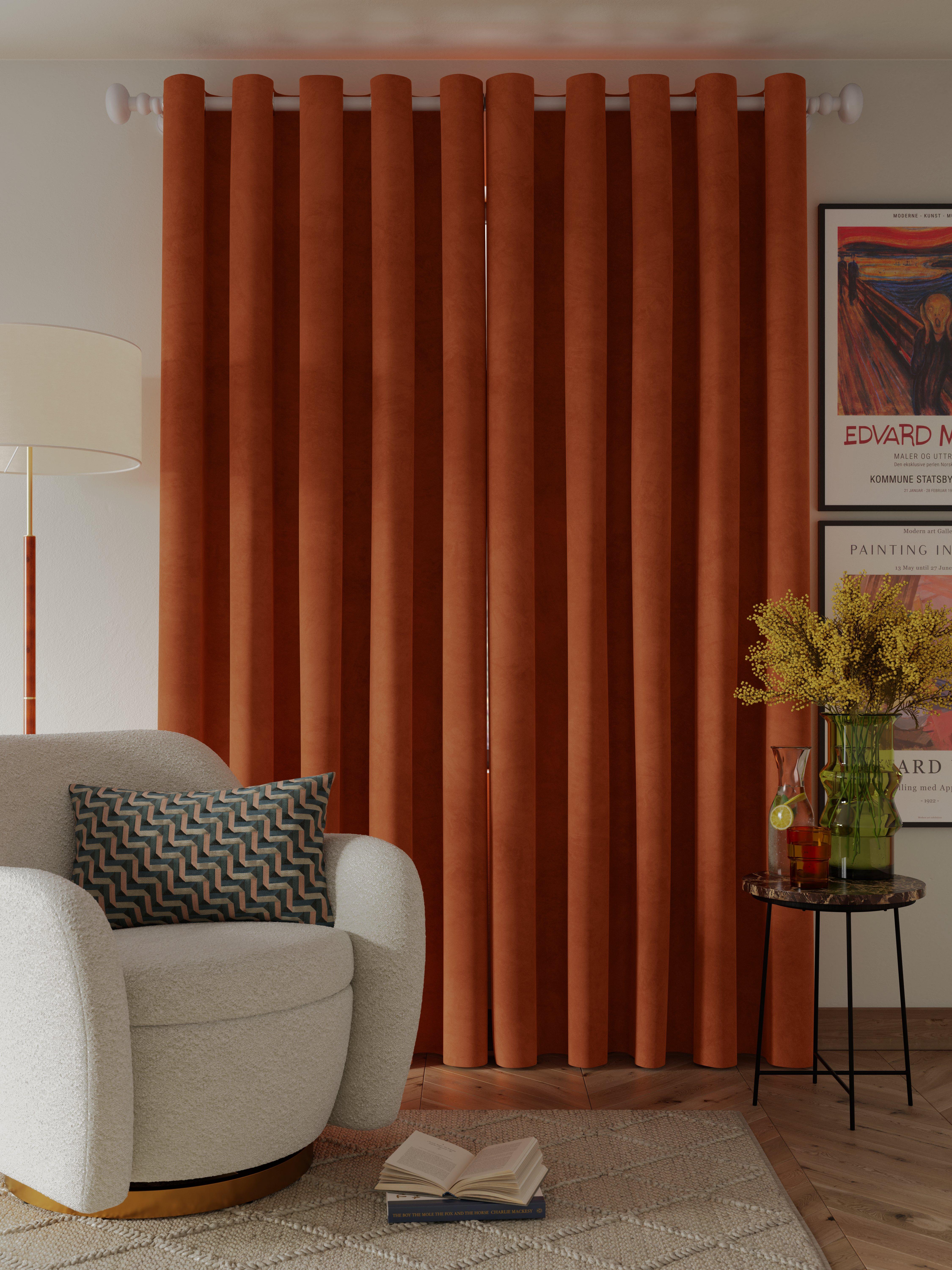 Plain-coloured eyelet curtains made from lustrous polyester velvet. The lining adds the perfect finish, improving the drape and enhancing the vibrancy of the curtain.