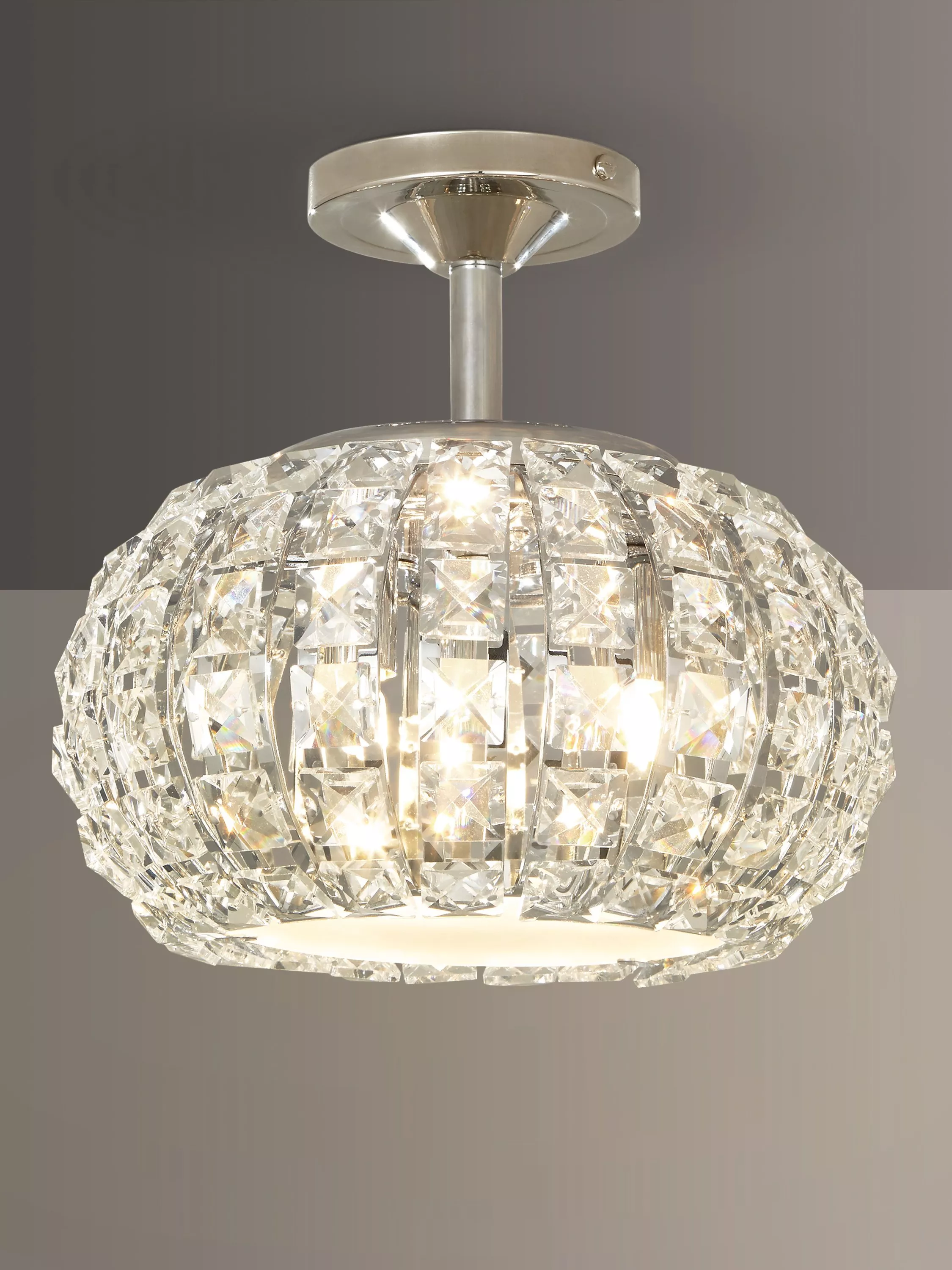 With its intricate array of cut crystal glass, this beautiful semi flush ceiling light adds a real feeling of boutique glamour to a room.