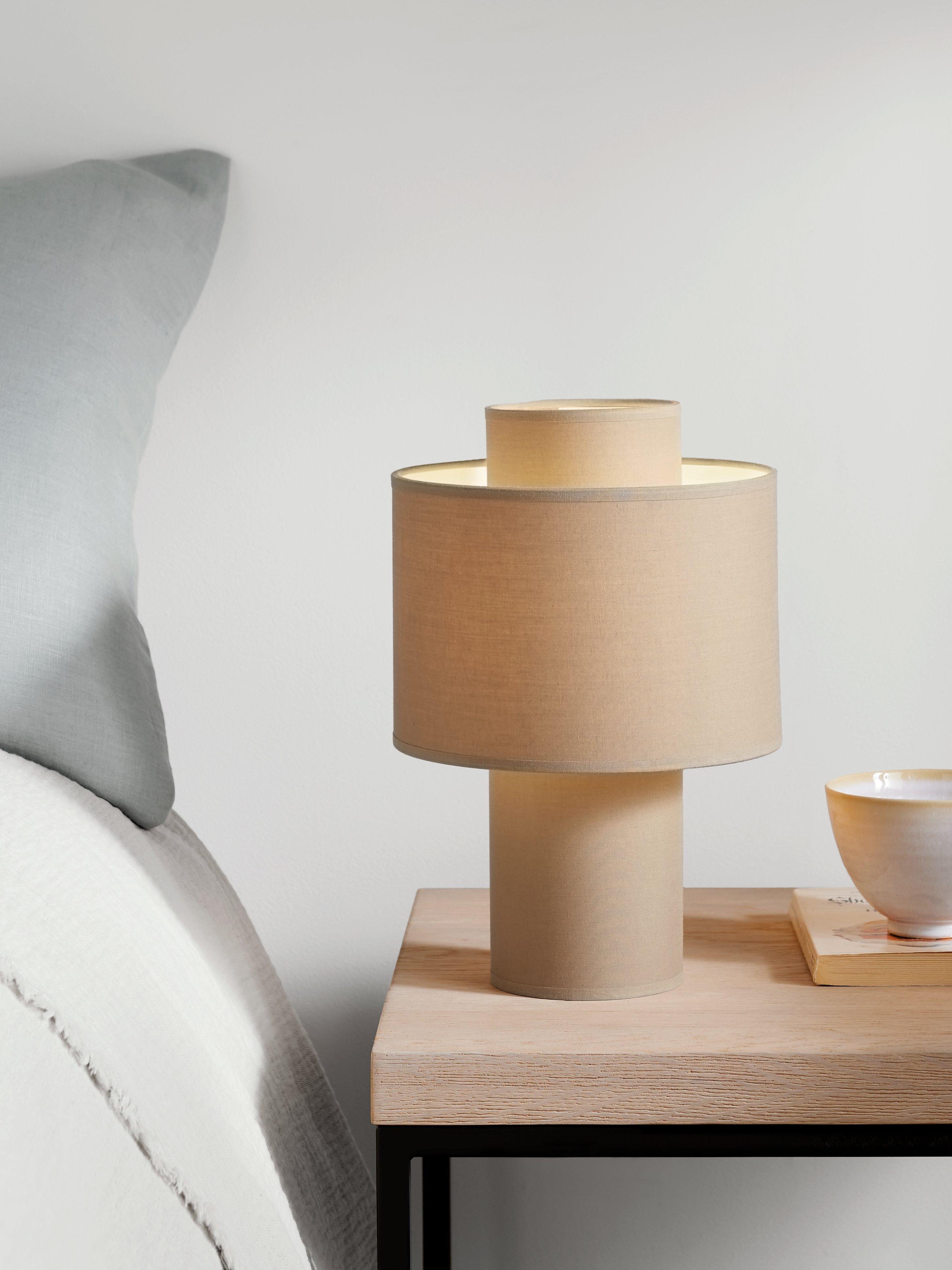 Our Vicente mini table lamp creates a warm atmosphere in small areas. The natural fabrics on the base and shade suit any decor. Combine with our Vicente wall lighting for a coordinating modern look.