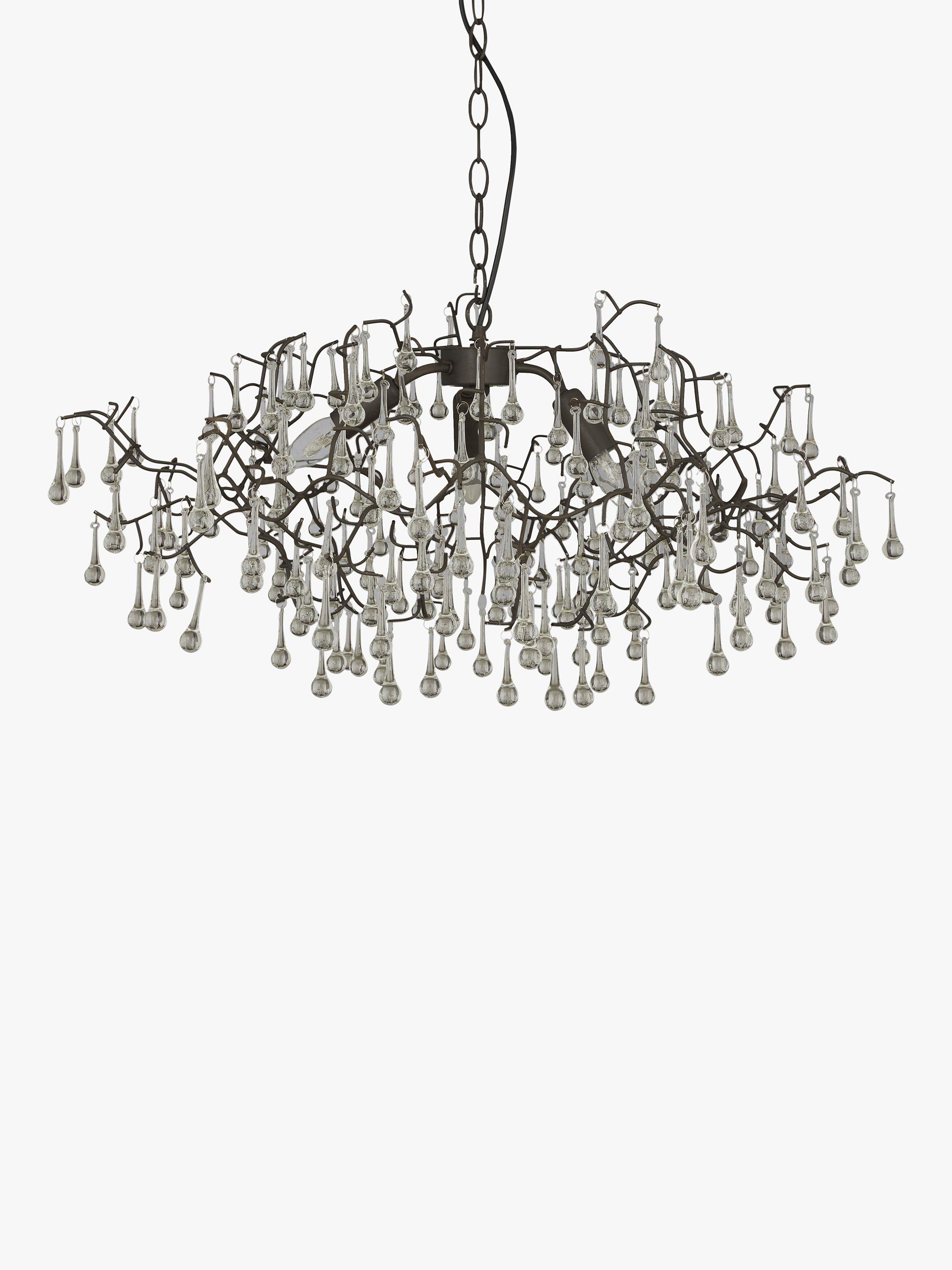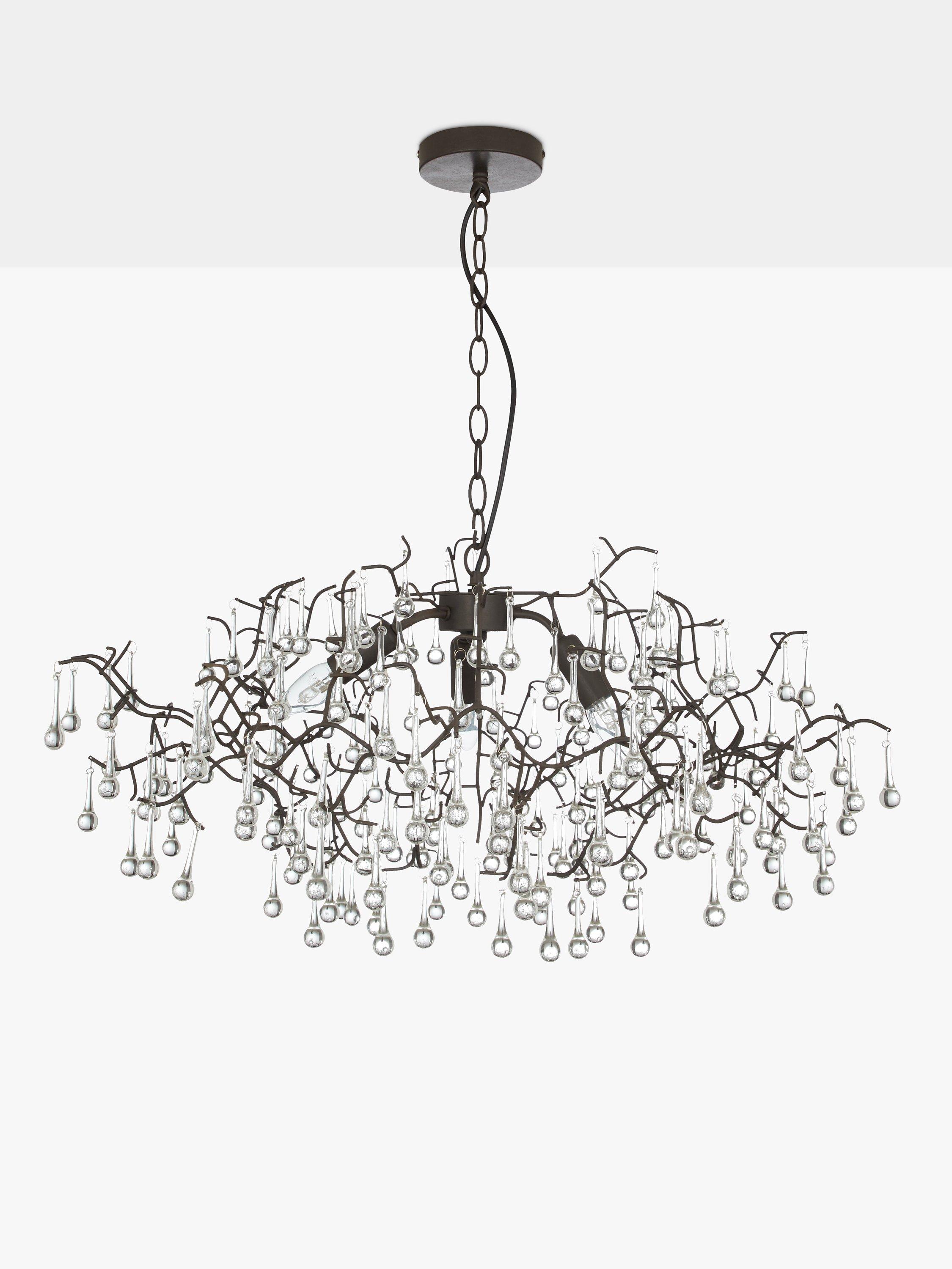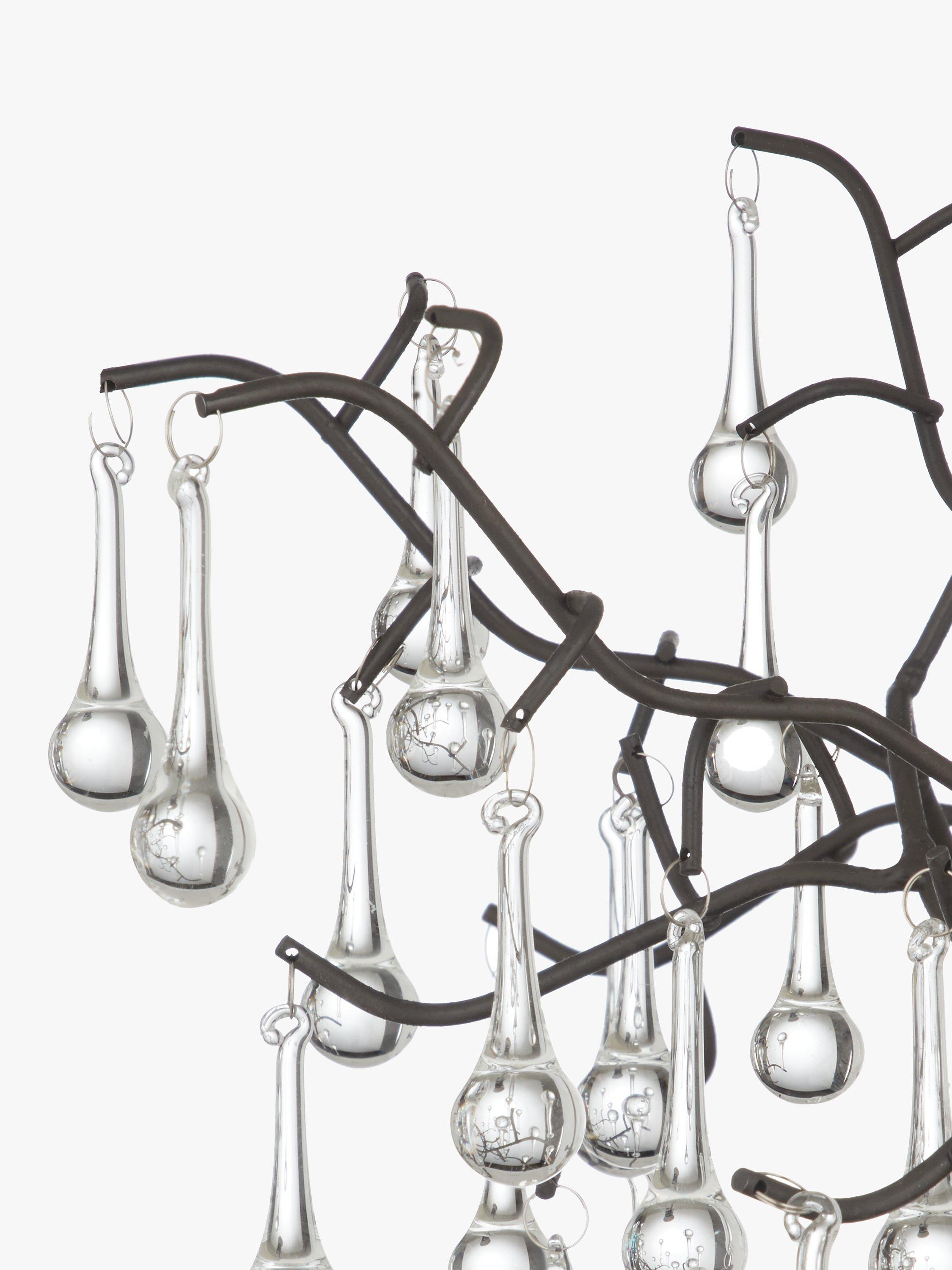 Branch-like lines, topped with moulded glass raindrops, create this beautiful ethereal light pendant. An organic centrepiece, dangled with shards of glass that reflect and refract the light, to create a spectrum of dancing colours, it would look perfect in a period property.