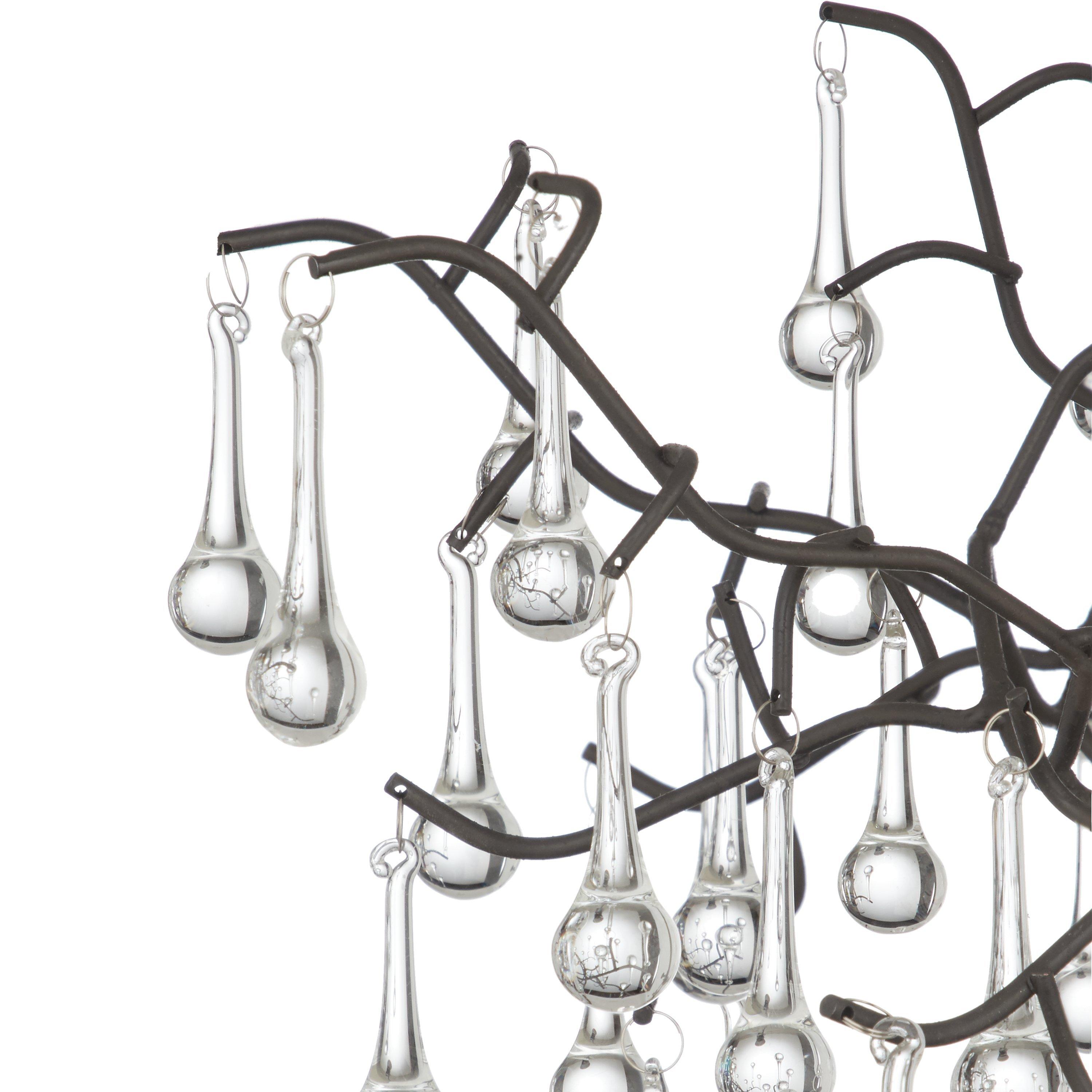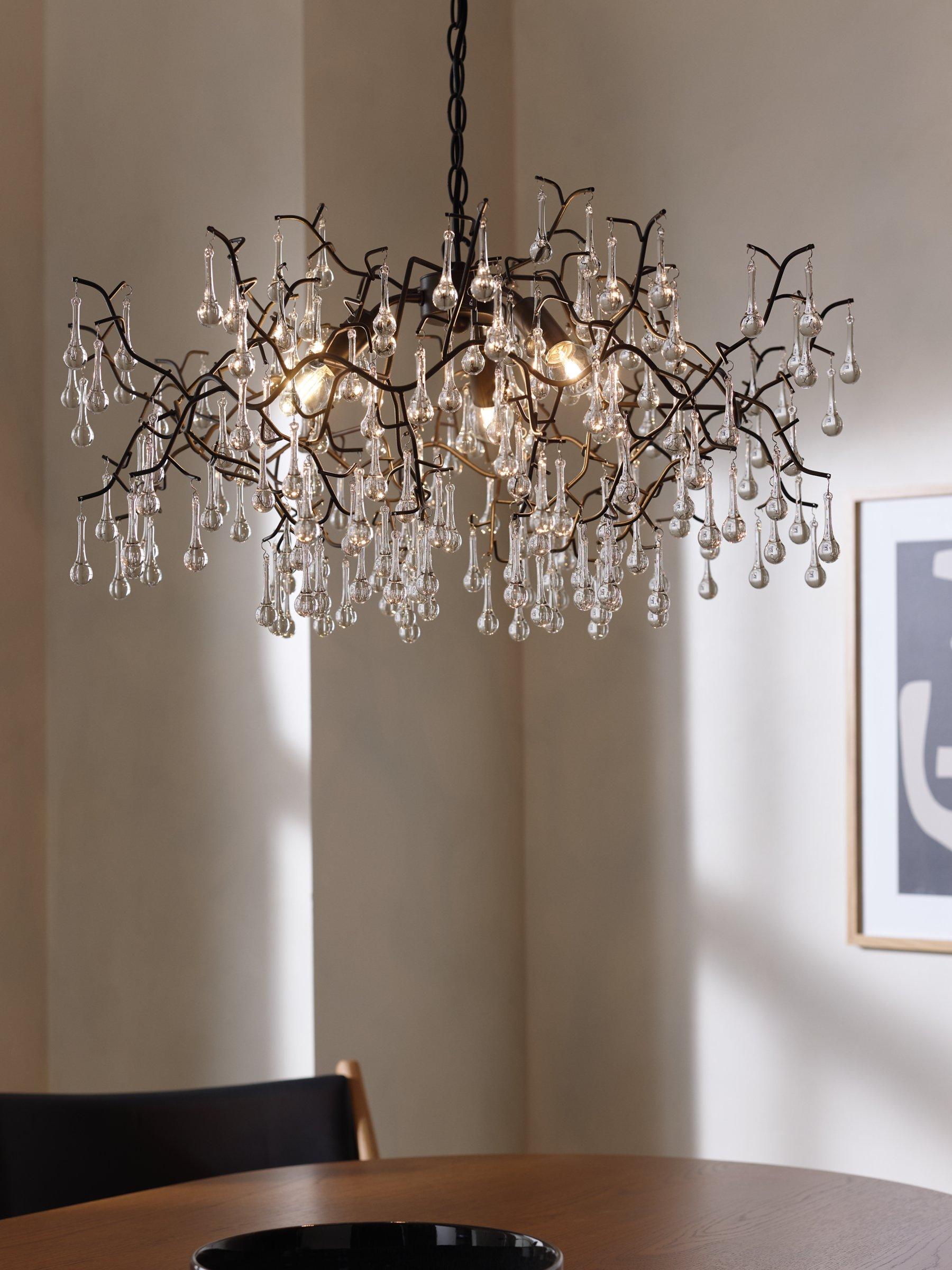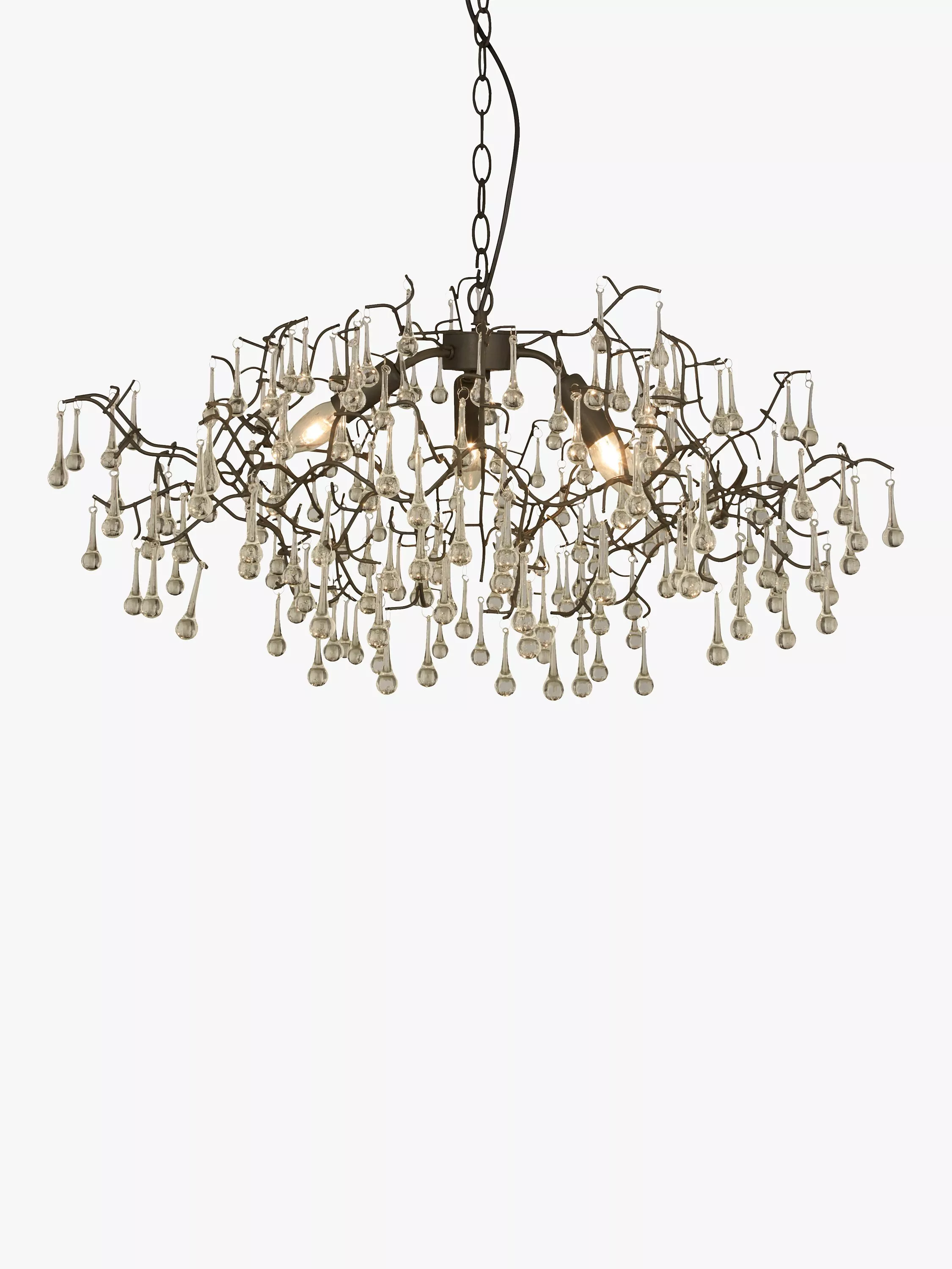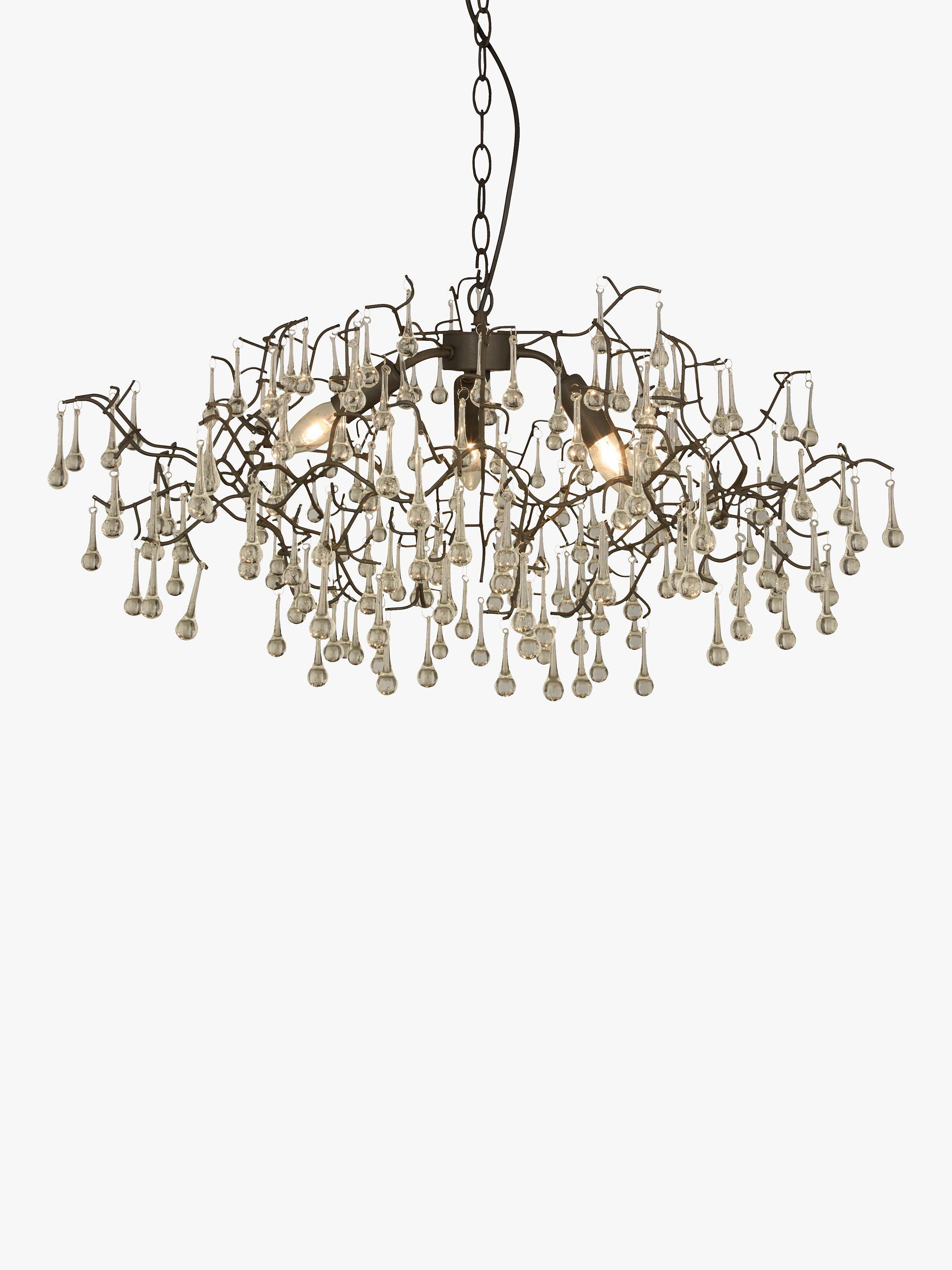 Branch-like lines, topped with moulded glass raindrops, create this beautiful ethereal light pendant. An organic centrepiece, dangled with shards of glass that reflect and refract the light, to create a spectrum of dancing colours, it would look perfect in a period property.