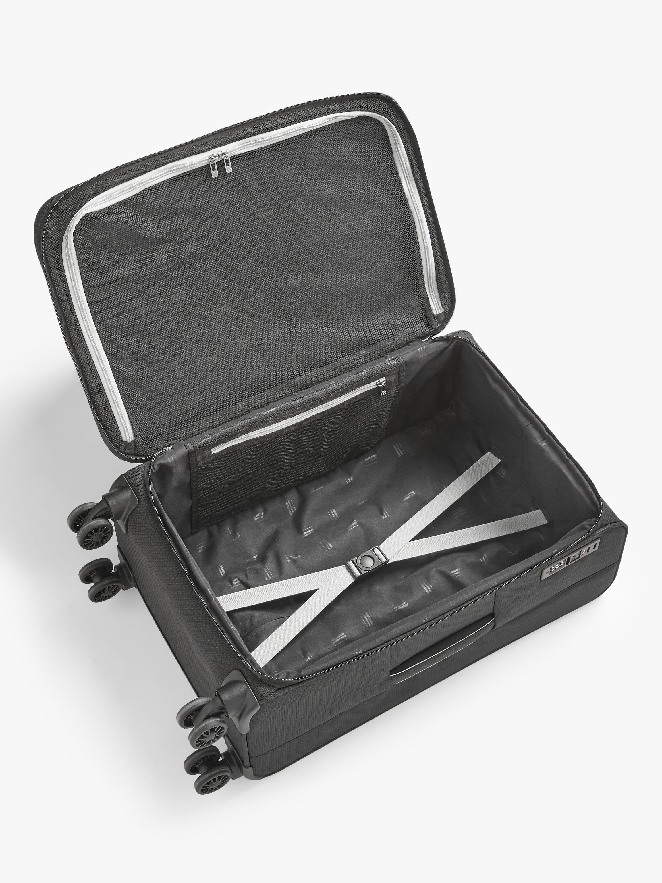 Inside there's one main packing compartment complete with elastic compression straps that keep belongings secure. The mesh zipped pocket in the lid of the case makes finding smaller essentials like passports and boarding passes easier on the go, with a recessed TSA combination lock allowing safe passage when travelling through the US.