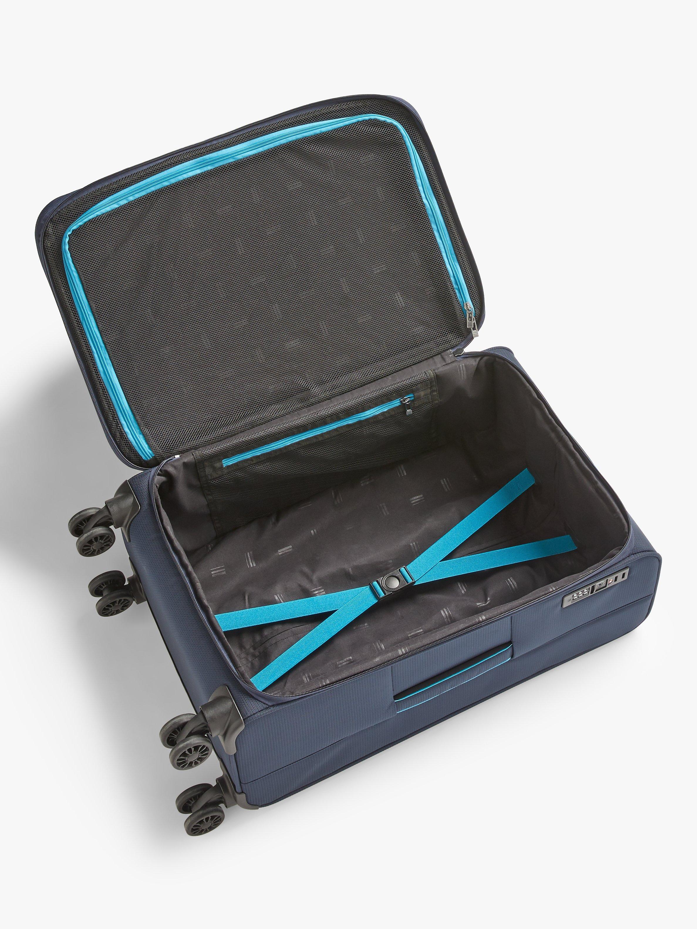 Inside there's one main packing compartment complete with elastic compression straps that keep belongings secure. The mesh zipped pocket in the lid of the case makes finding smaller essentials like passports and boarding passes easier on the go, with a recessed TSA combination lock allowing safe passage when travelling through the US.