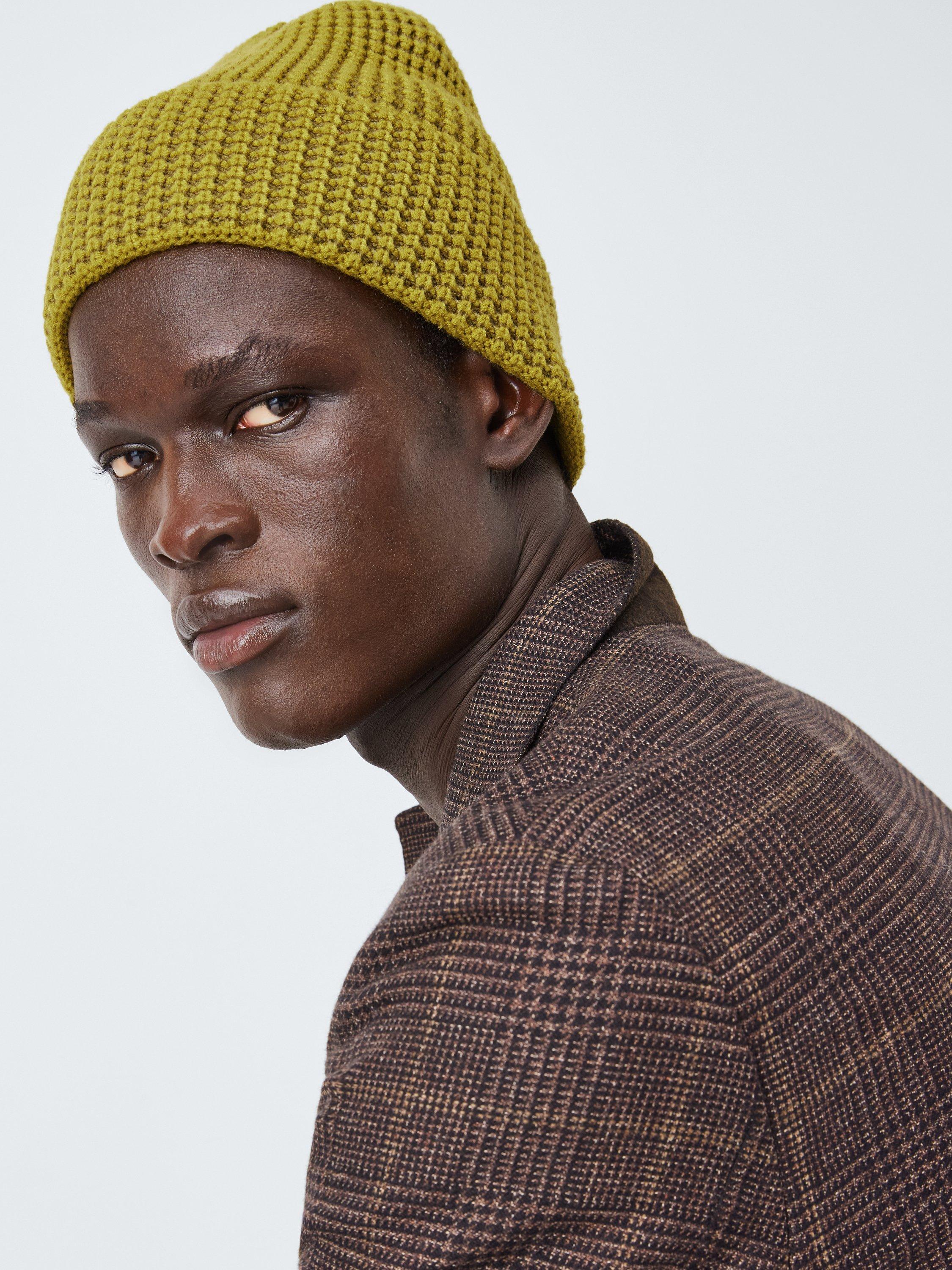 This beanie has a unique waffle texture in addition to the usual turn up.