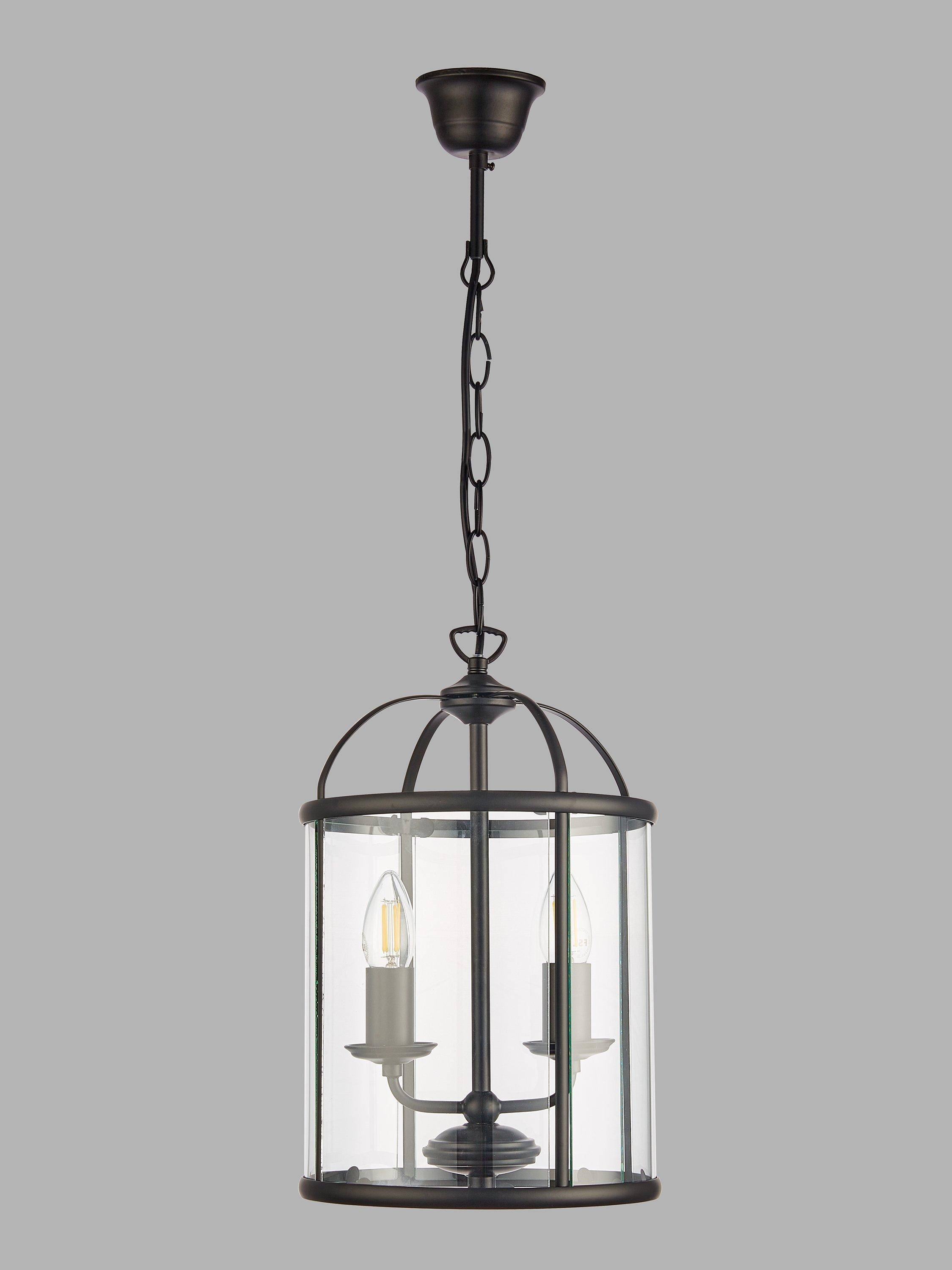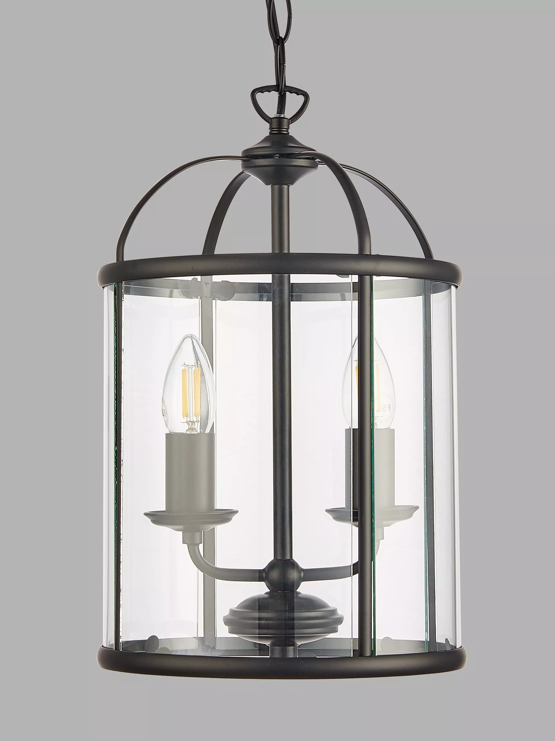 This Victorian style lantern has a decorated hanging assembly that hooks through the main body of the lantern.