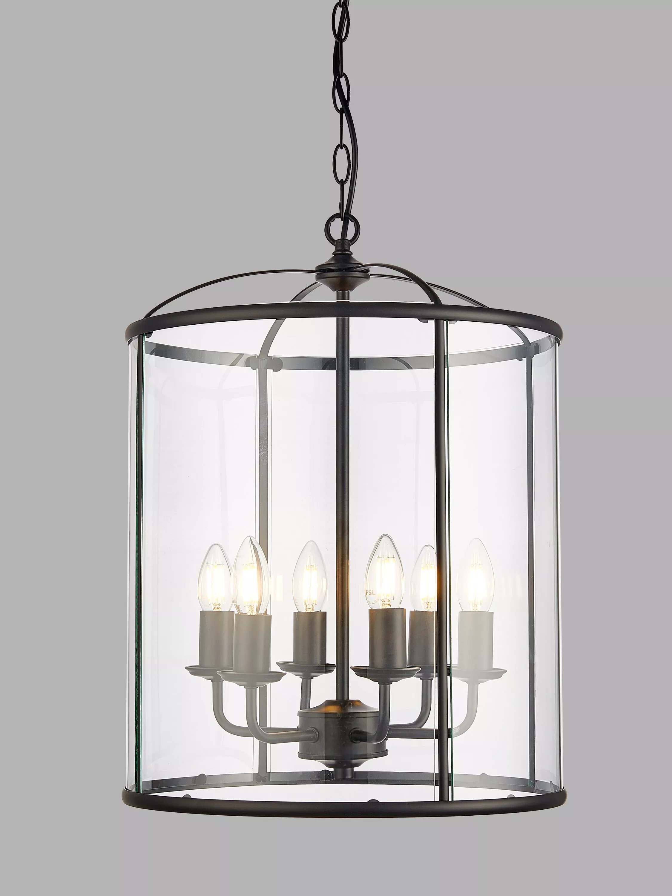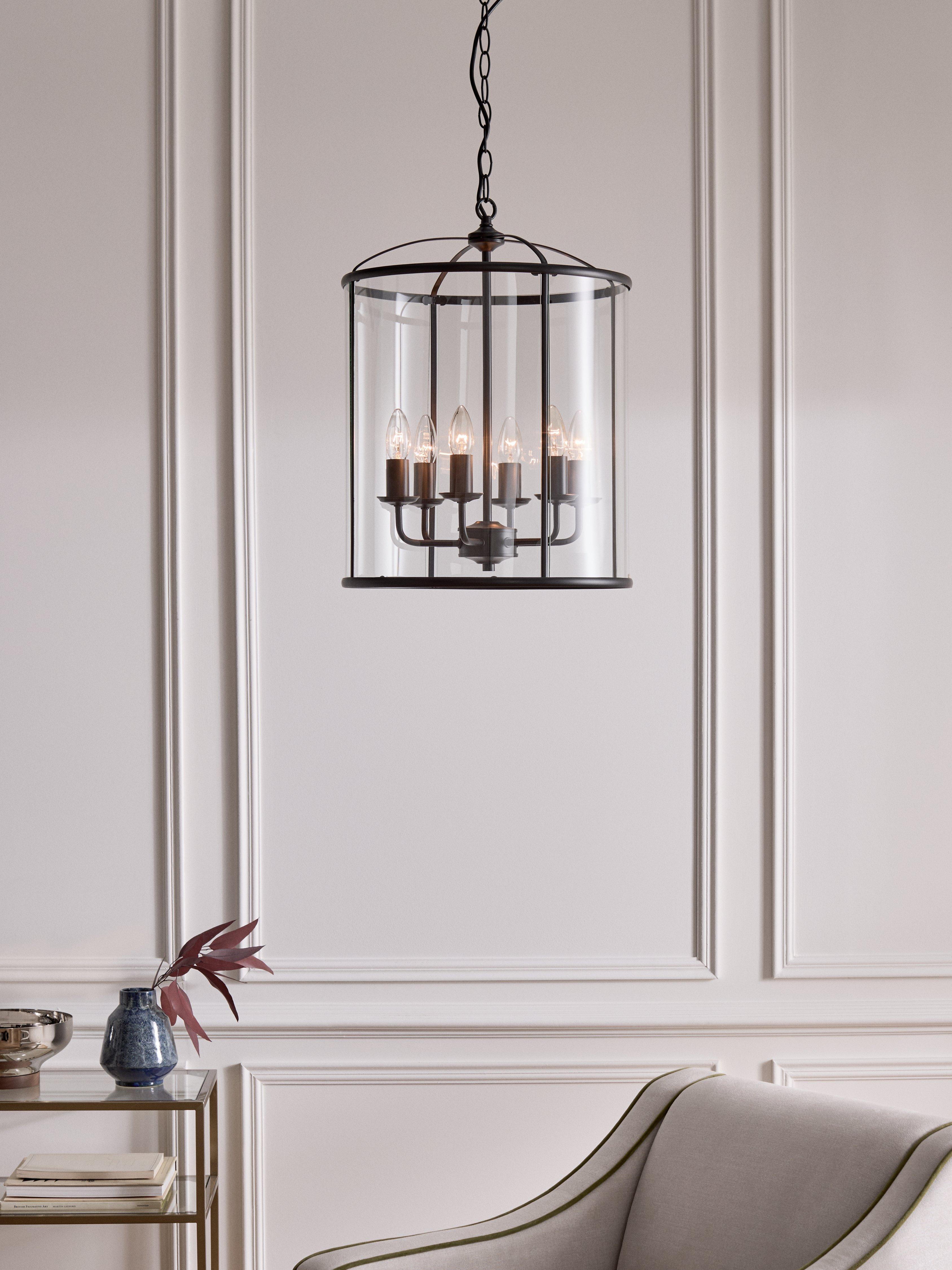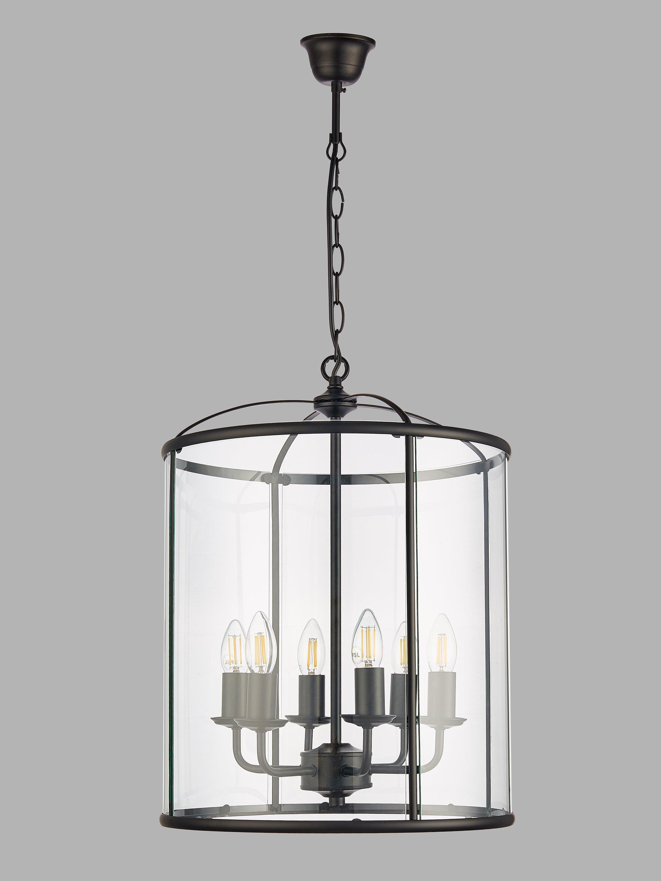 This Victorian style lantern has a decorated hanging assembly that hooks through the main body of the lantern.