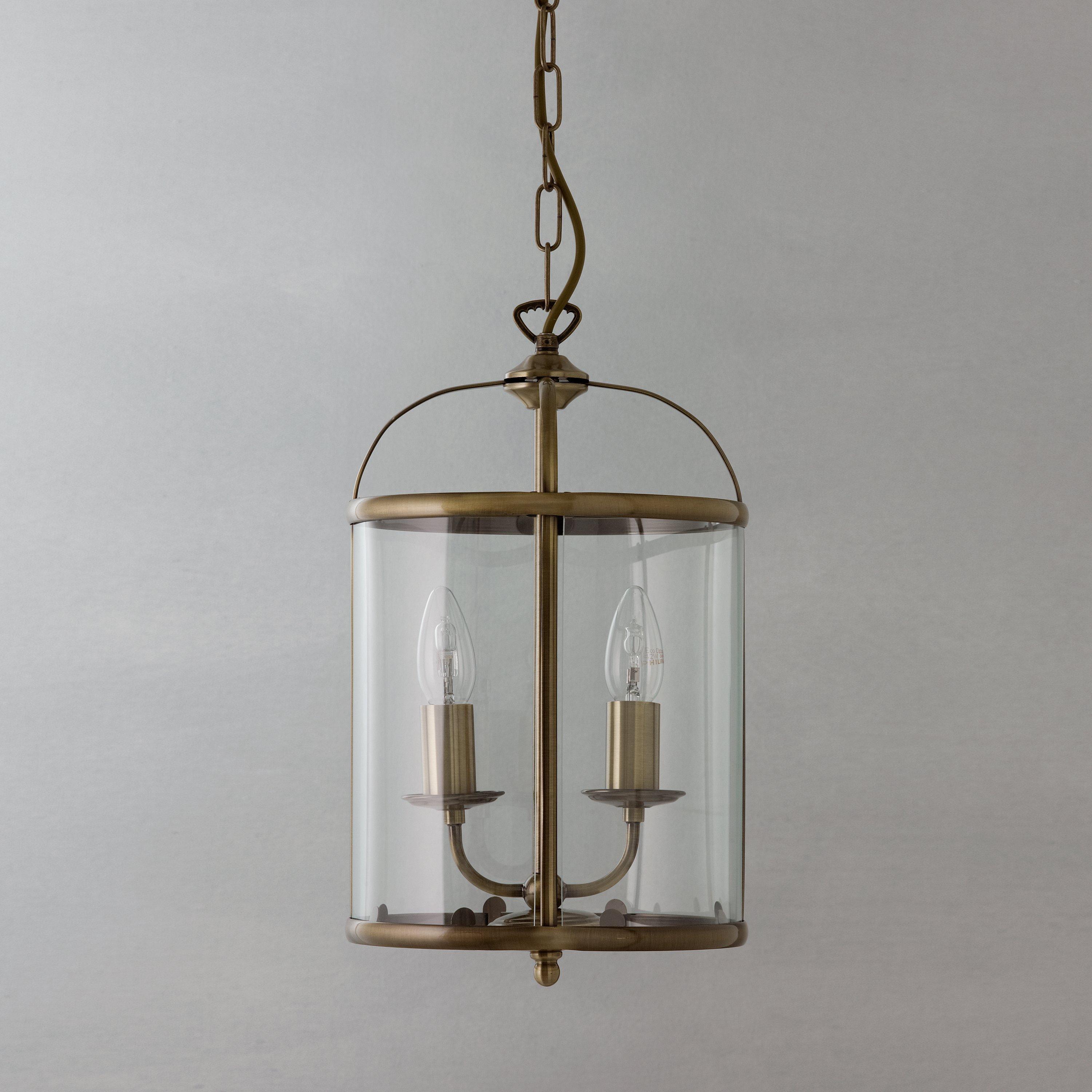Antiqued brass, Victorian style lantern, with a decorated hanging assembly that hooks through the main body of the lantern.