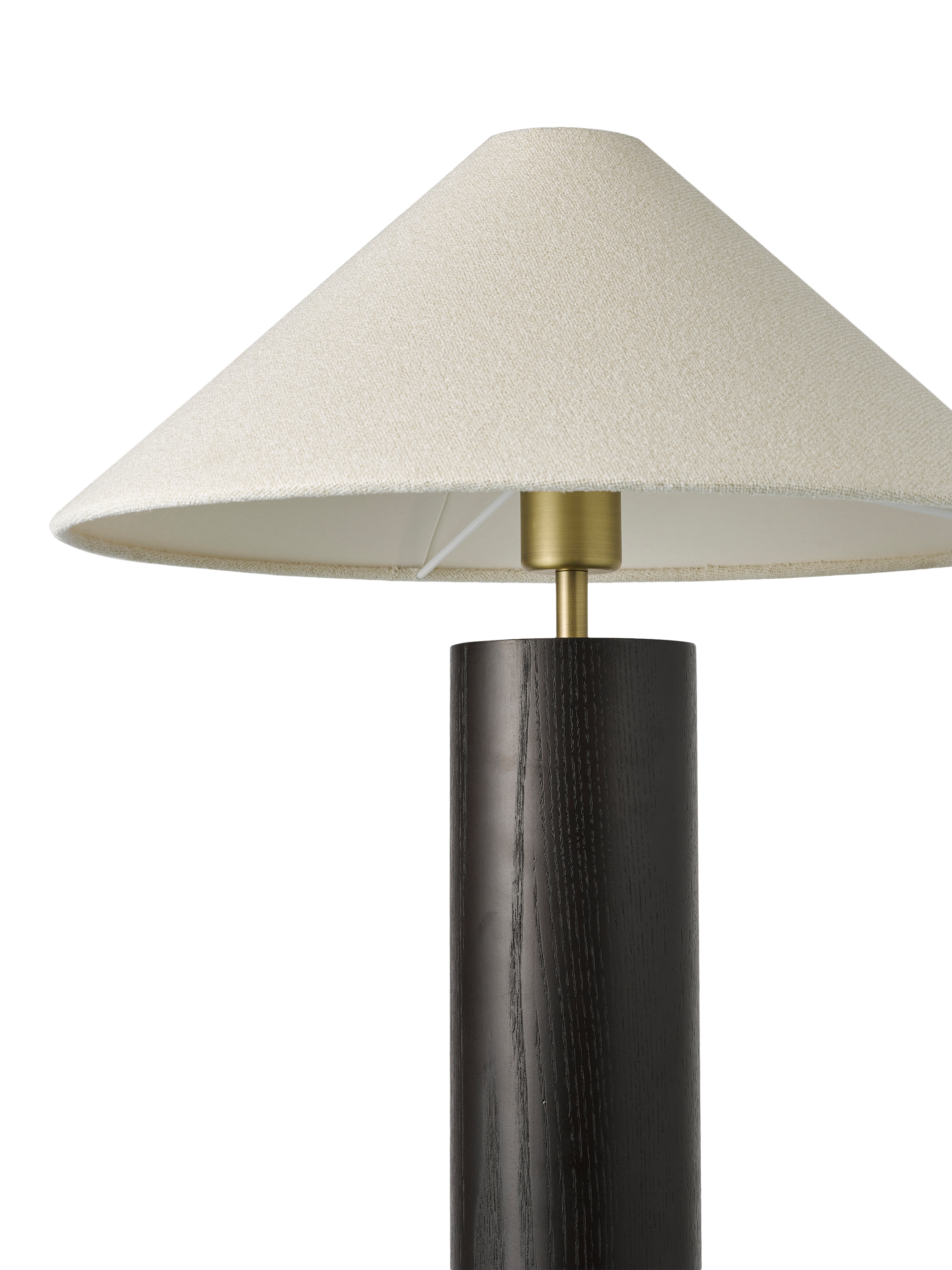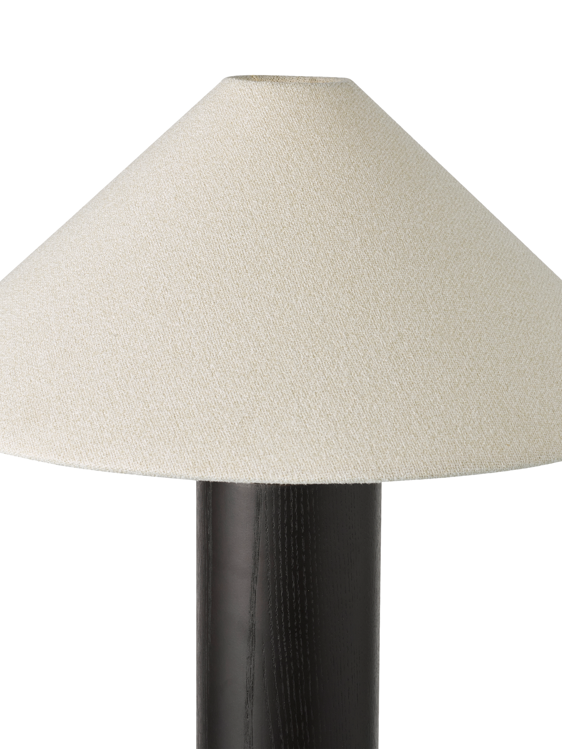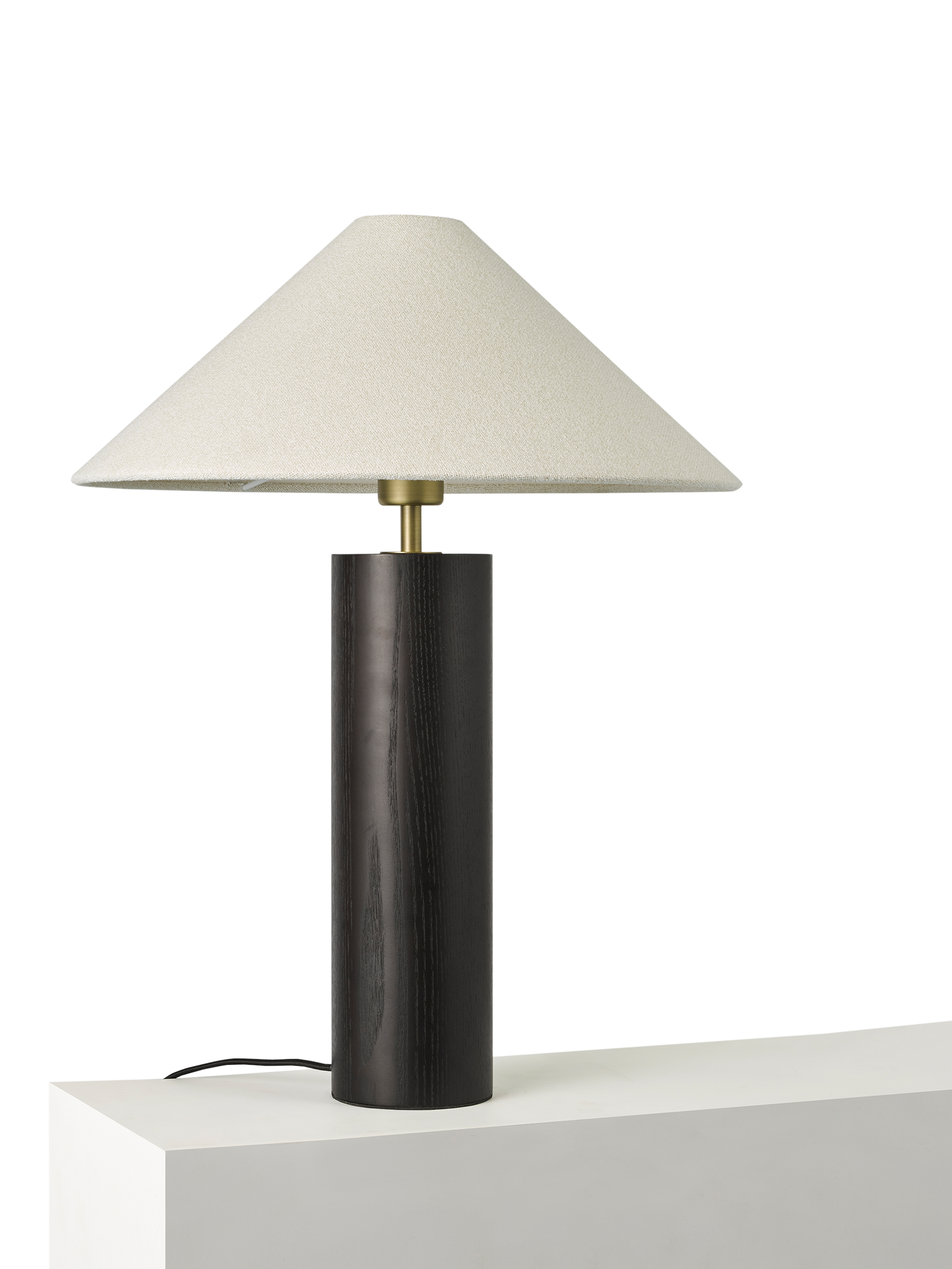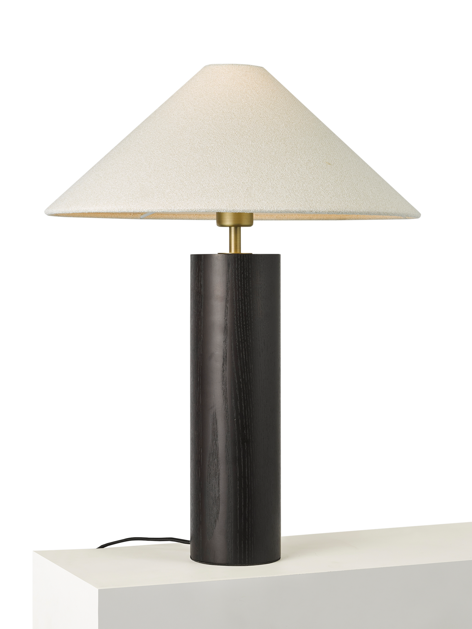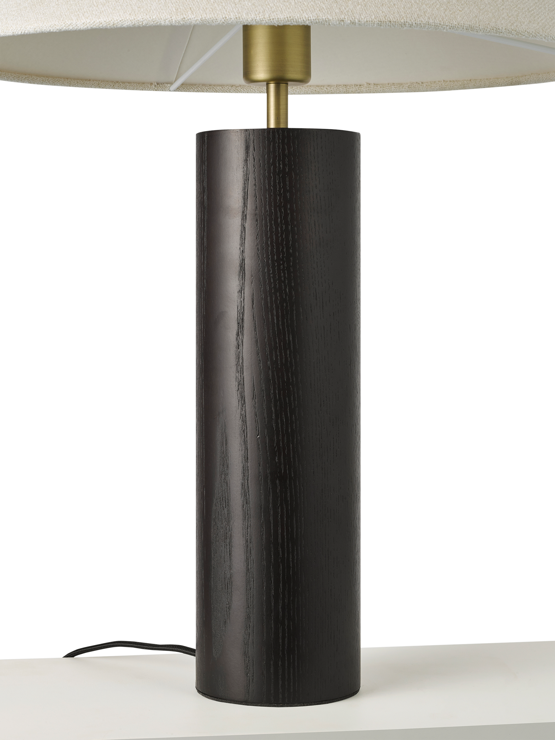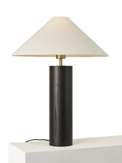 Striking black stained ash is used on this contemporary table lamp. Finished and topped with a modern woven lampshade, with a braided cable.