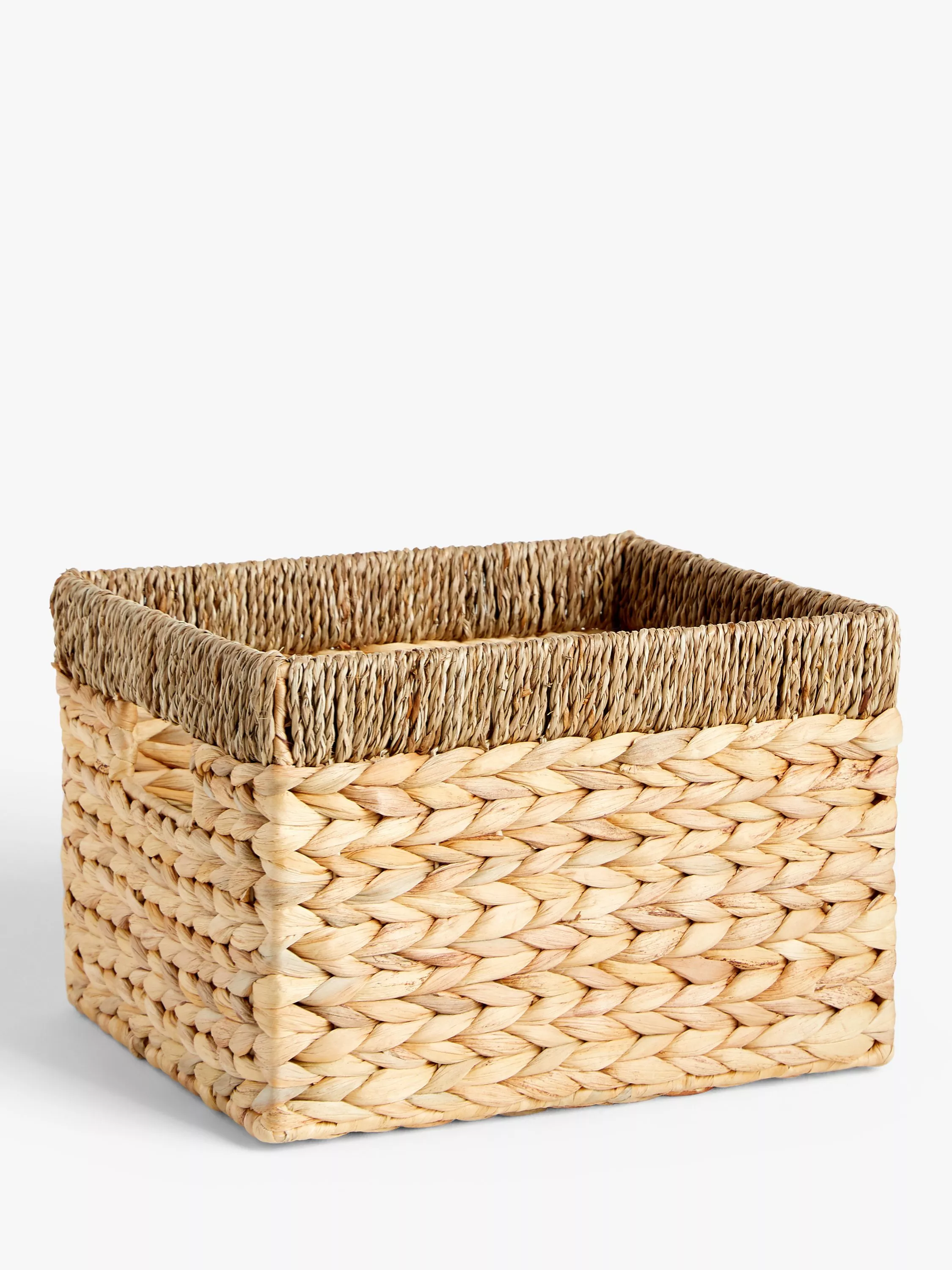 Perfect for storing bathroom accessories or toiletries, this water hyacinth basket has an attractive contrast trim.