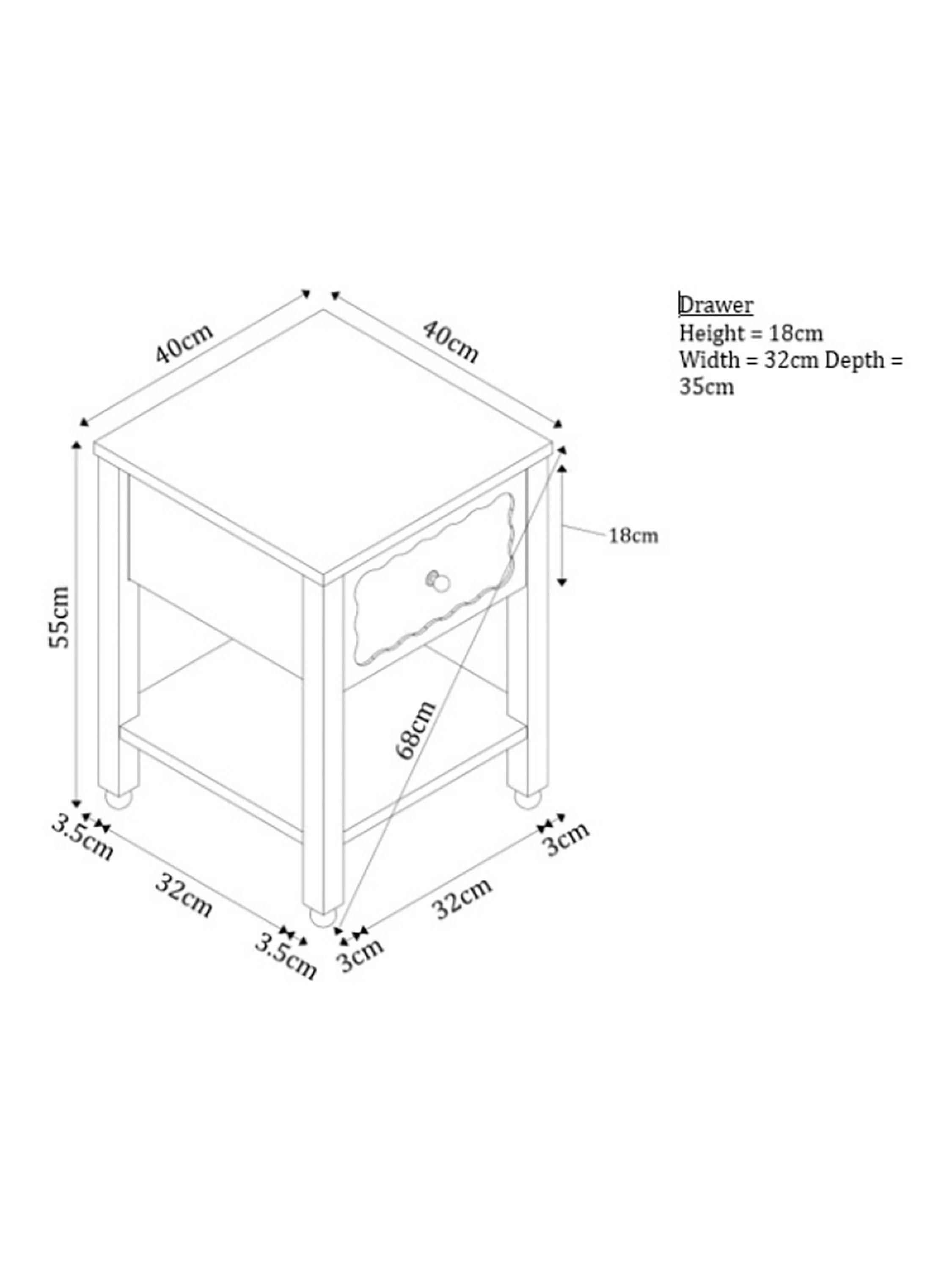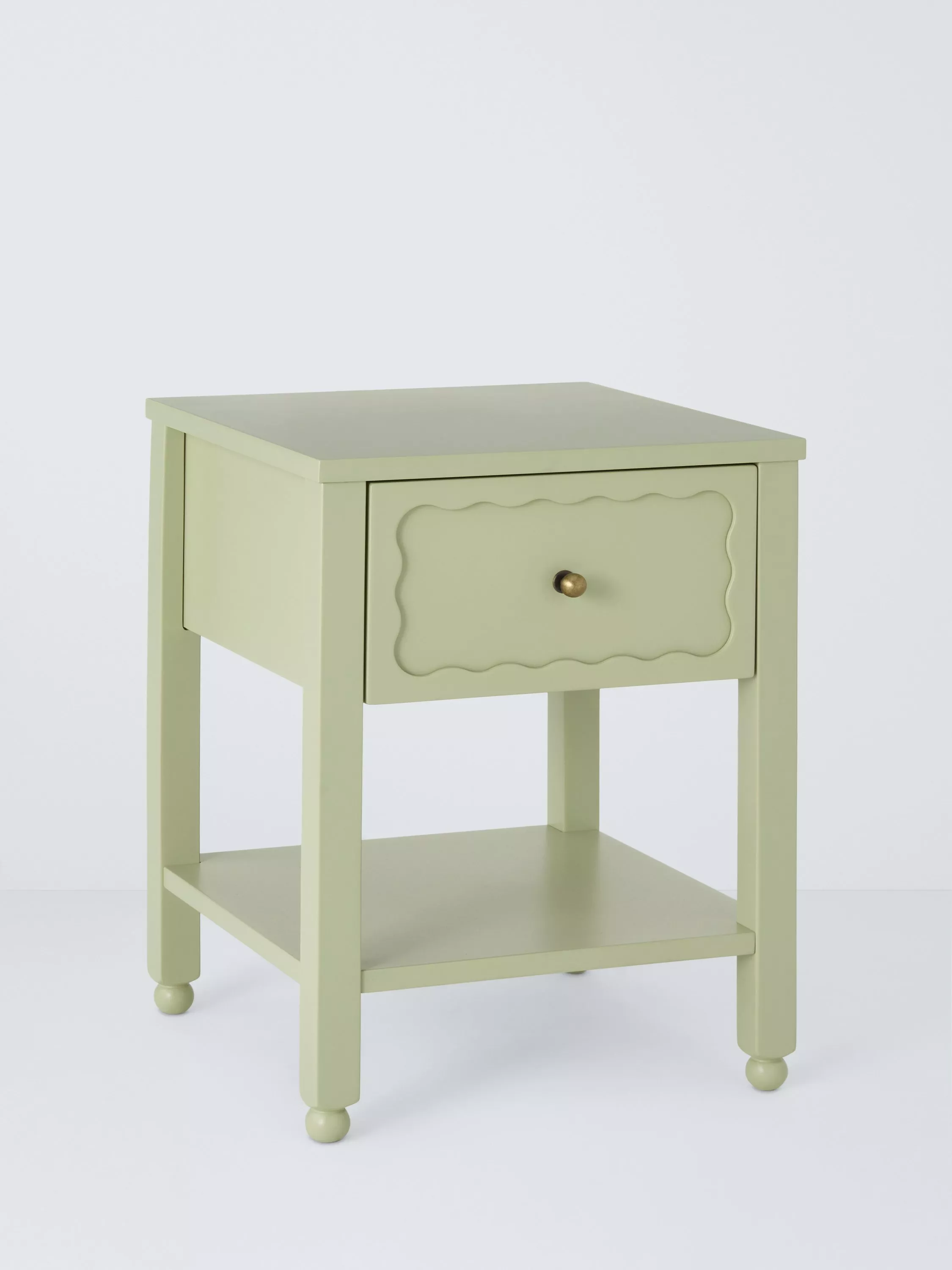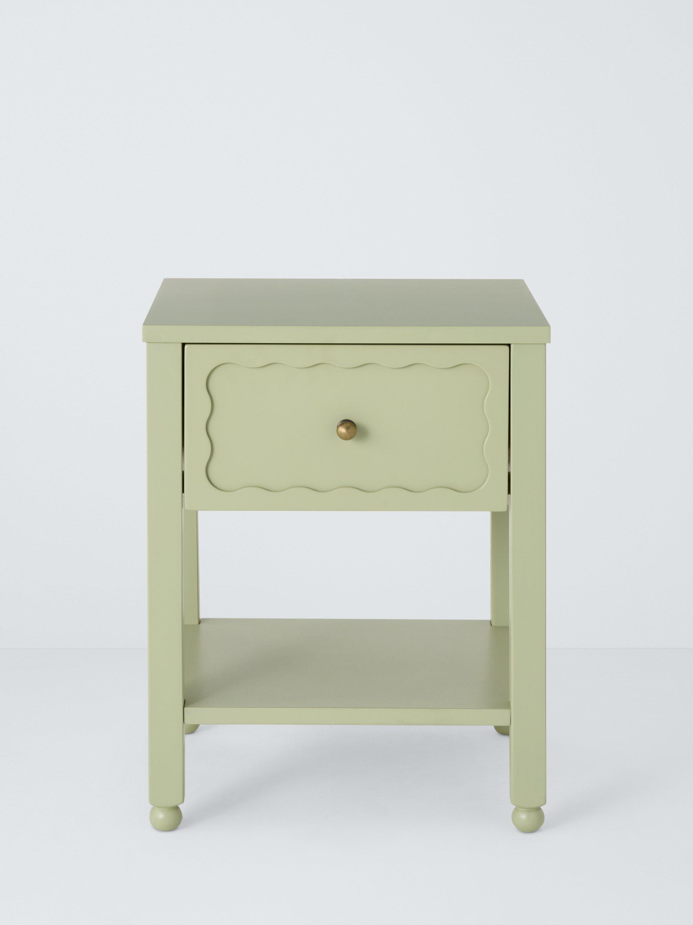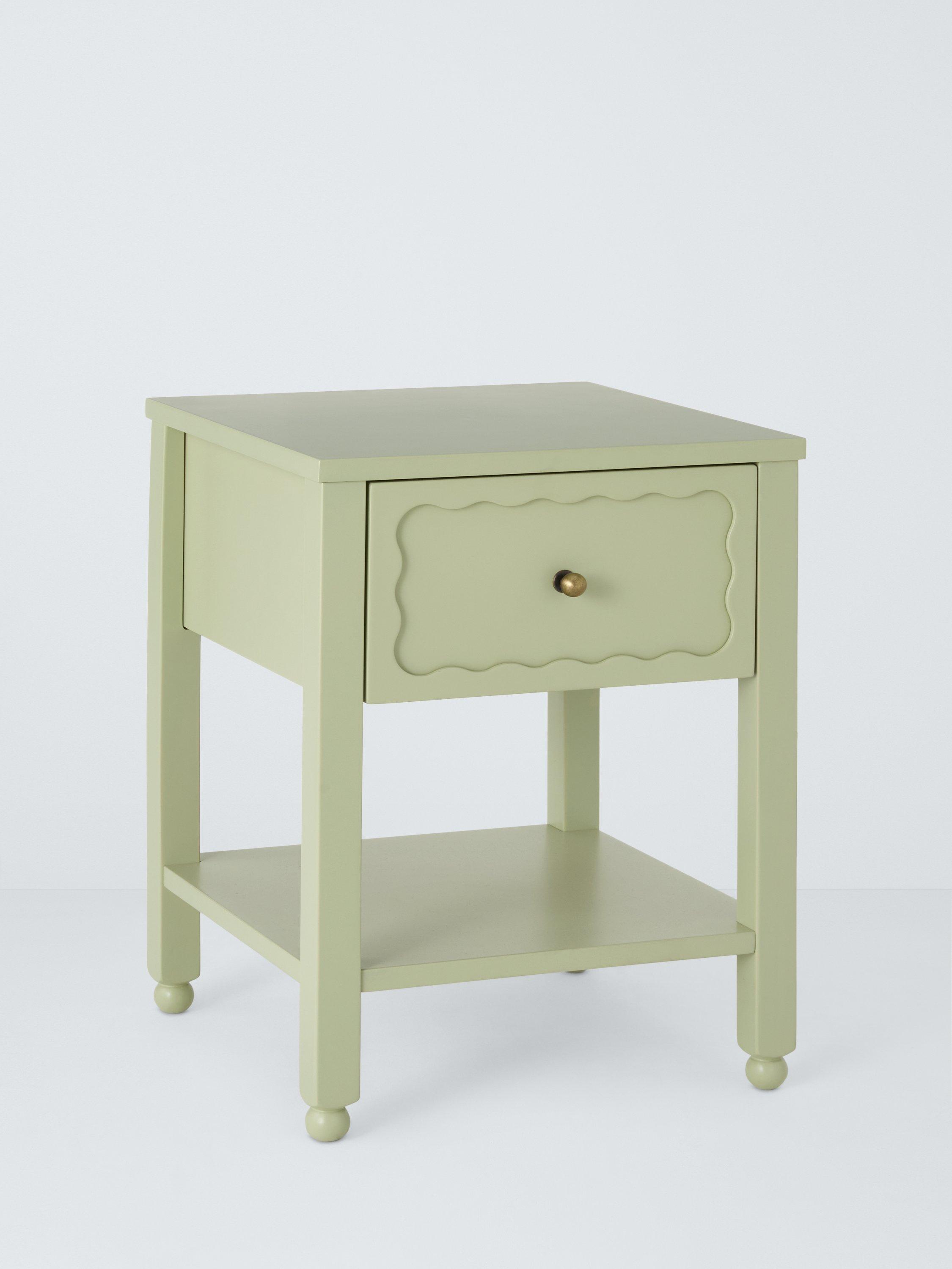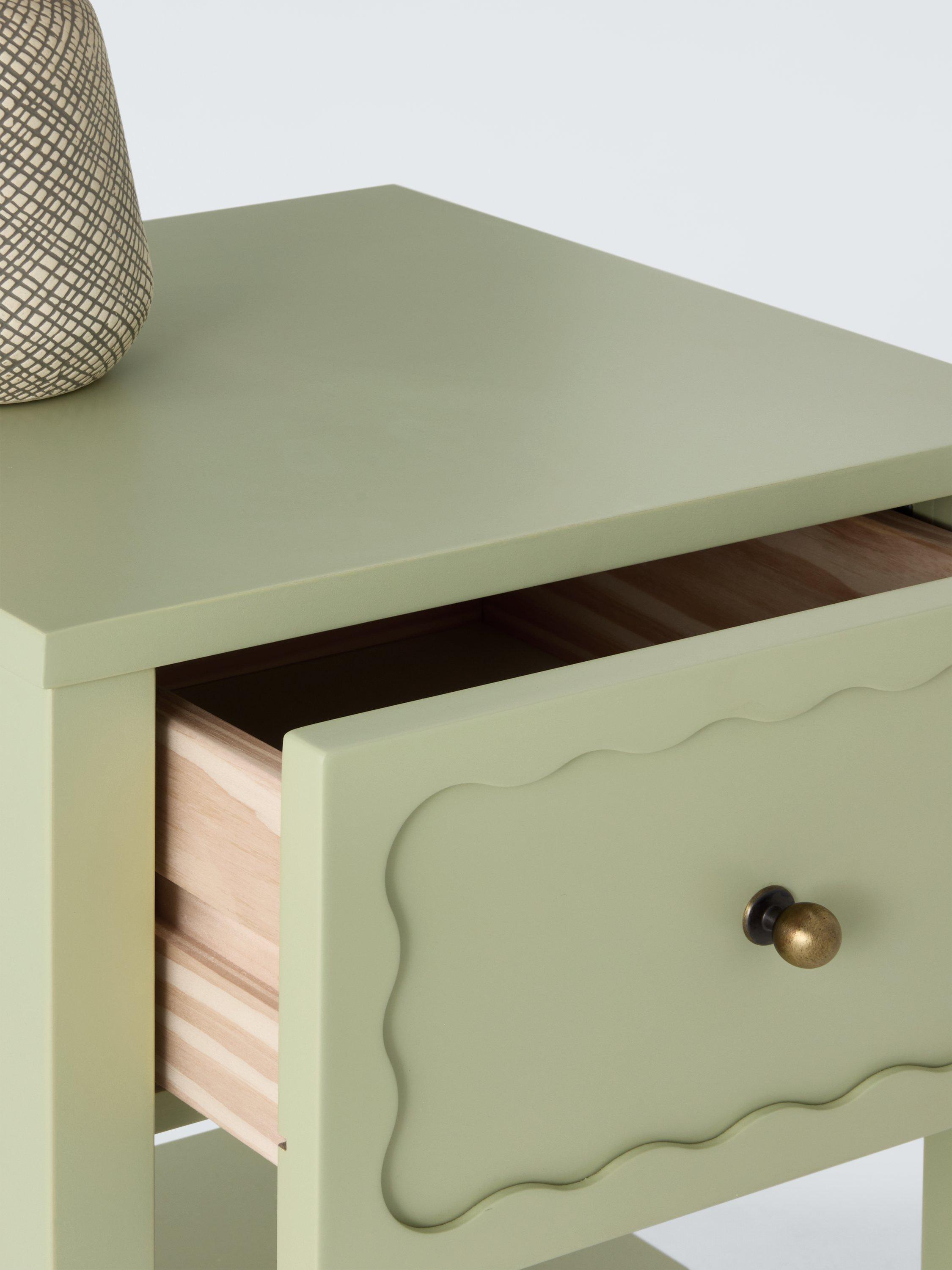 Transform your bedroom with furniture that's decorative and splashed with colour. This compact bedside table offers both, with a handy drawer accented with a sweet, scalloped inlay design, playful ball feet and a bold painted finish.