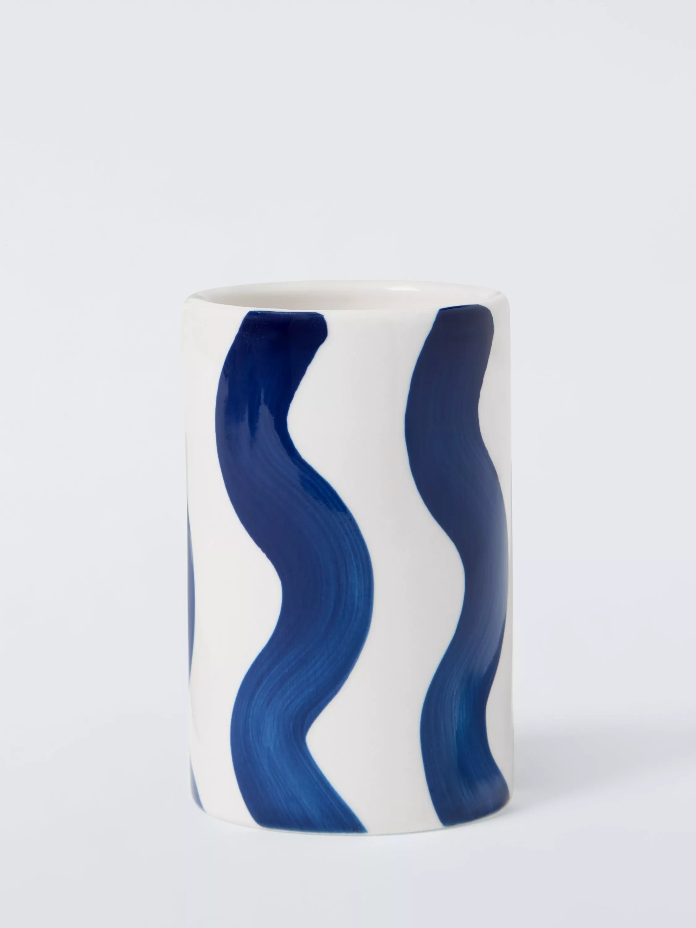 Made from glazed ceramic, each piece has a wavy stripe painted with a big, bold brushstroke in olive green or Delft blue.
