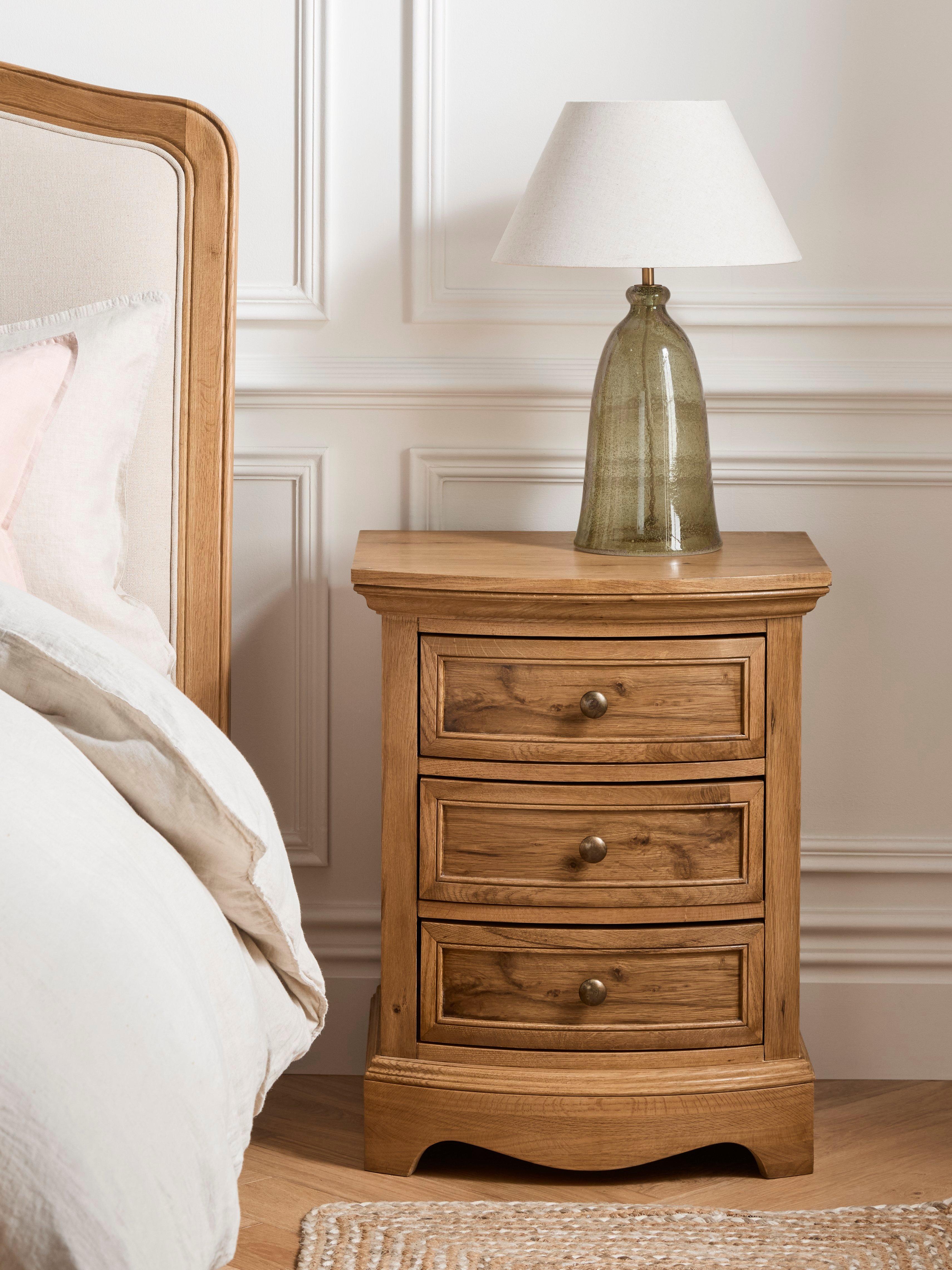 Keep your bedside clutter-free with this beautifully designed bedside table. It features three spacious drawers for all your essentials and earns high marks for its refined aesthetic. The attractive design and curved detailing ensure a look that's timeless.