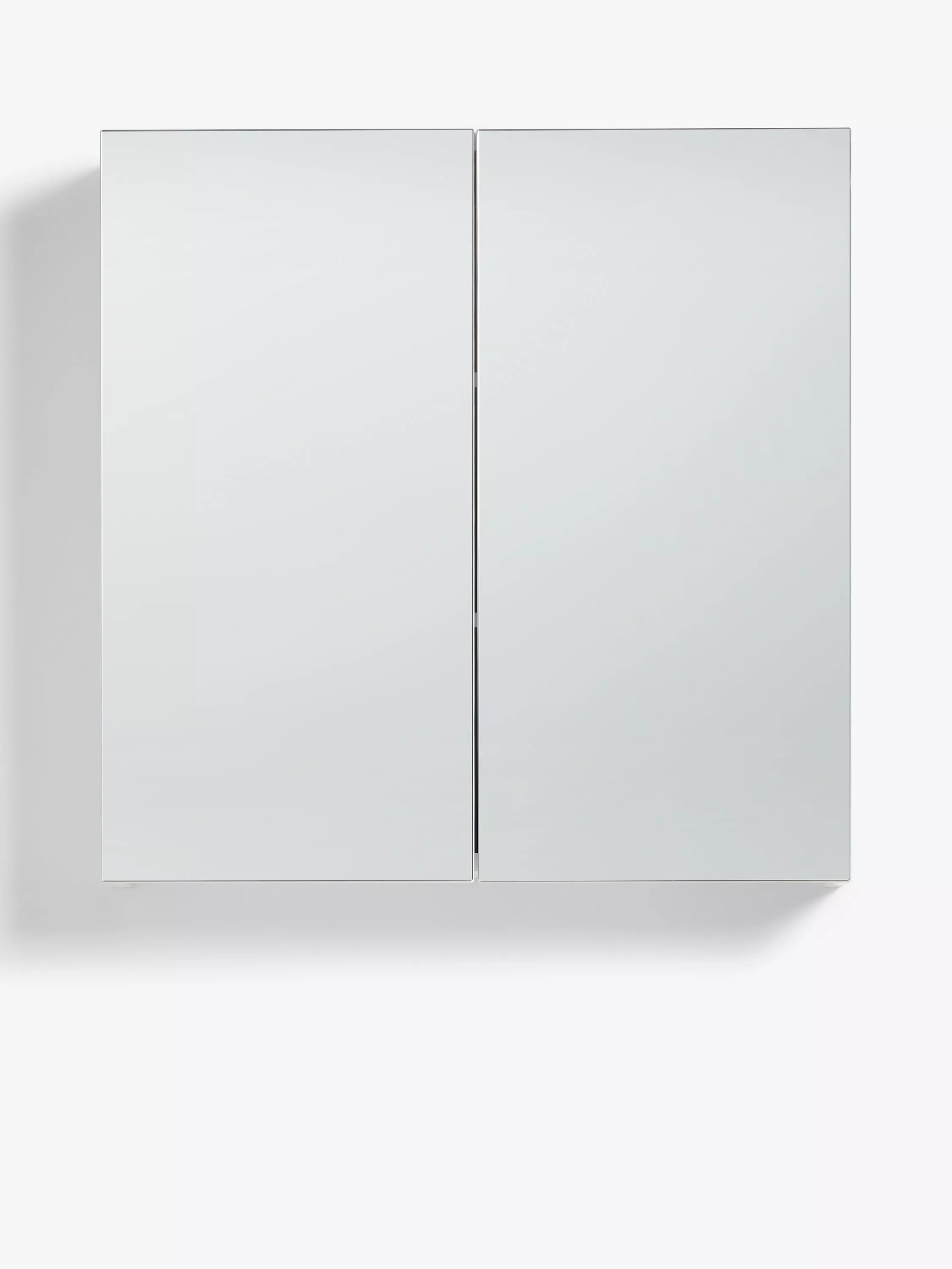 This double bathroom cabinet has a white gloss finish to its sides and the backside of the door.