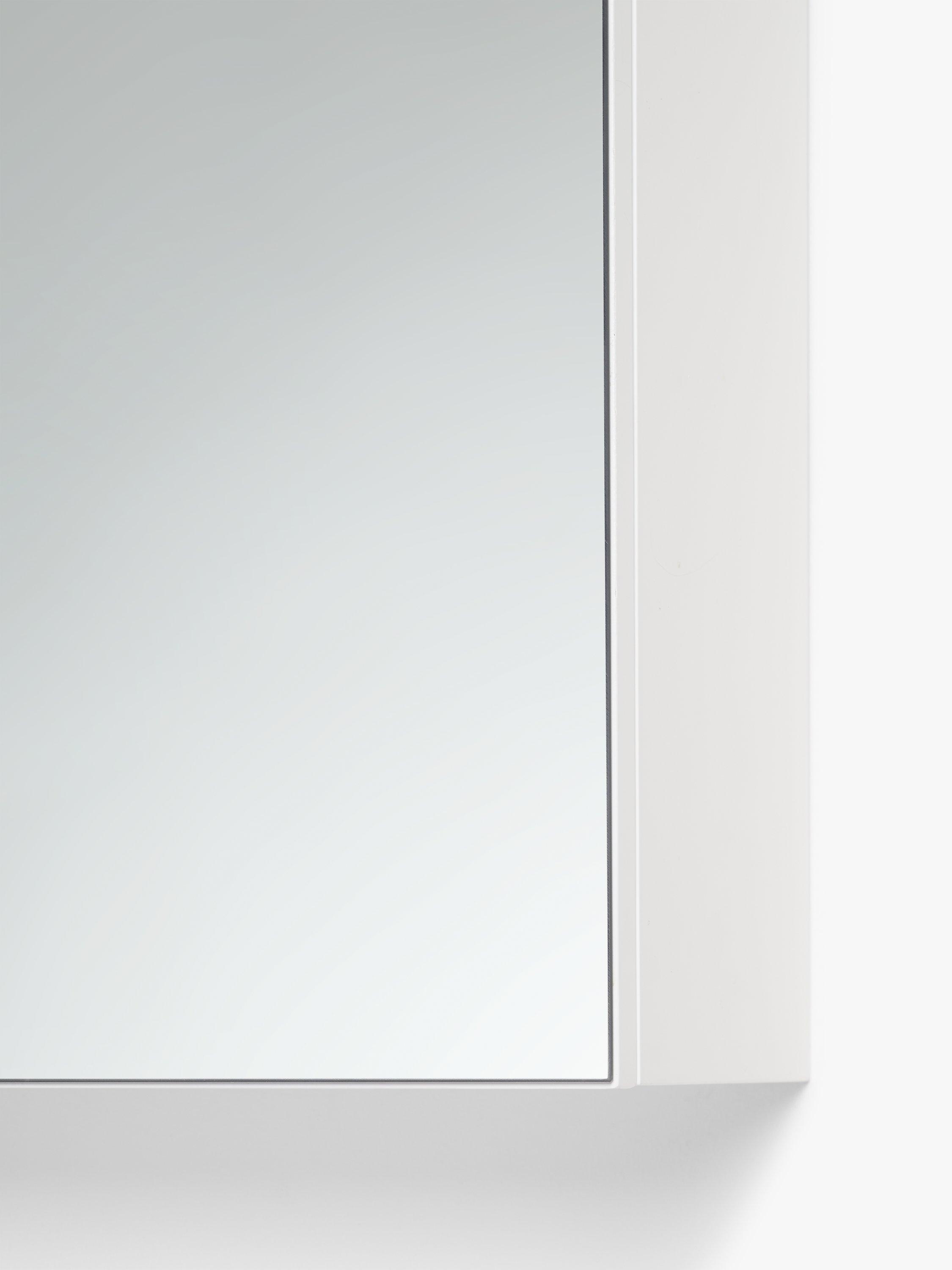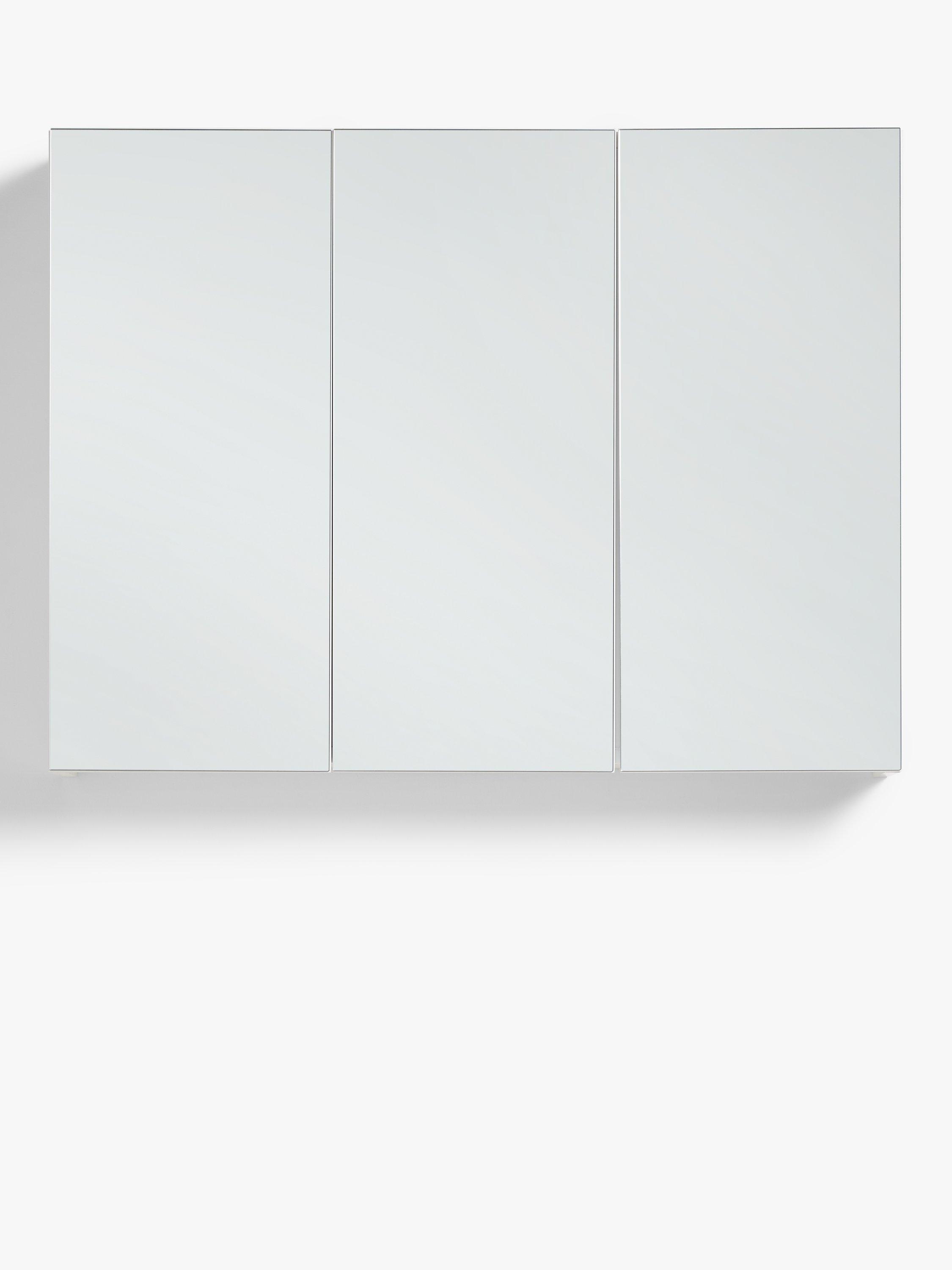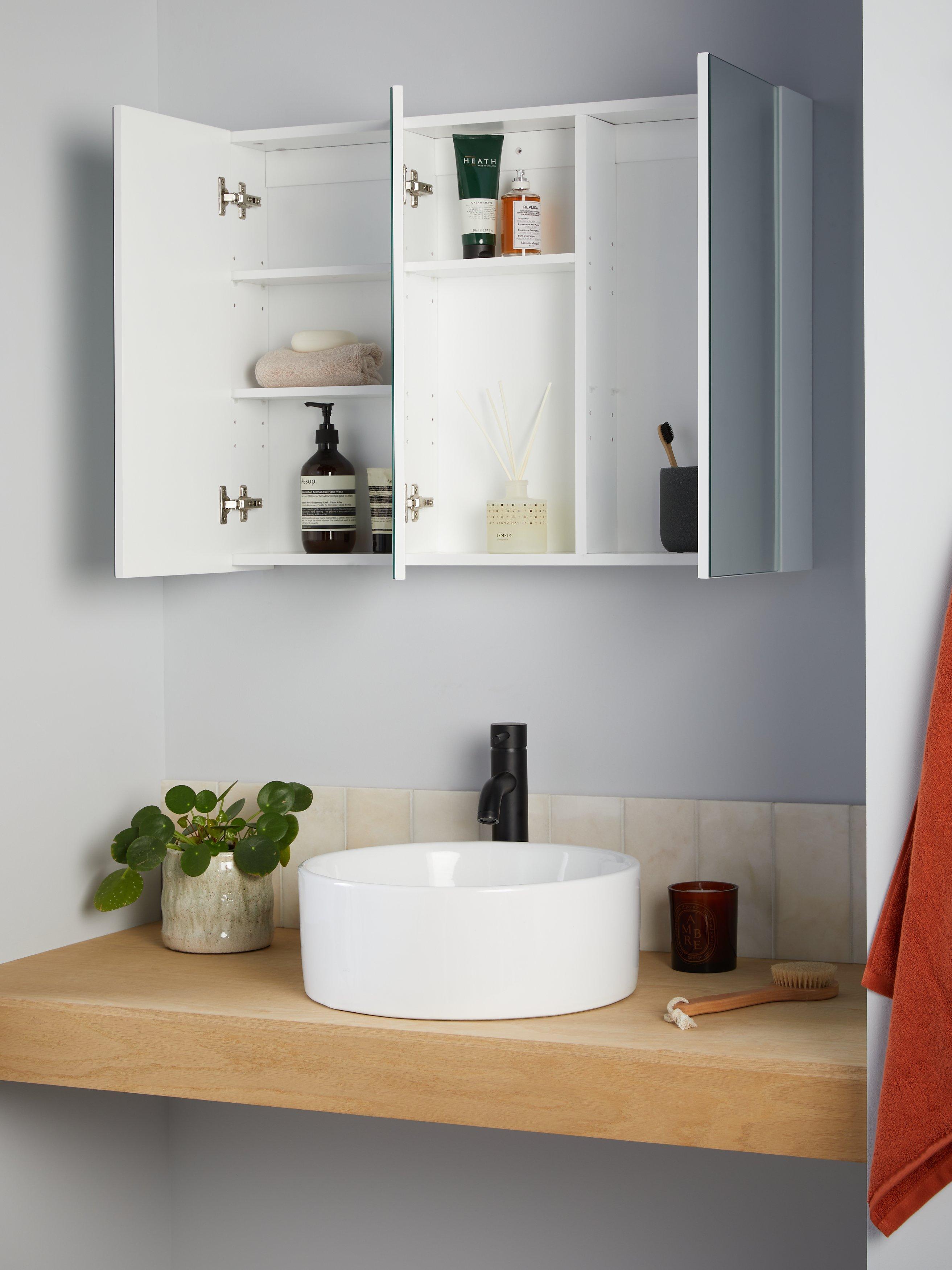 This triple bathroom cabinet has a white gloss finish to its sides and the backside of the door.