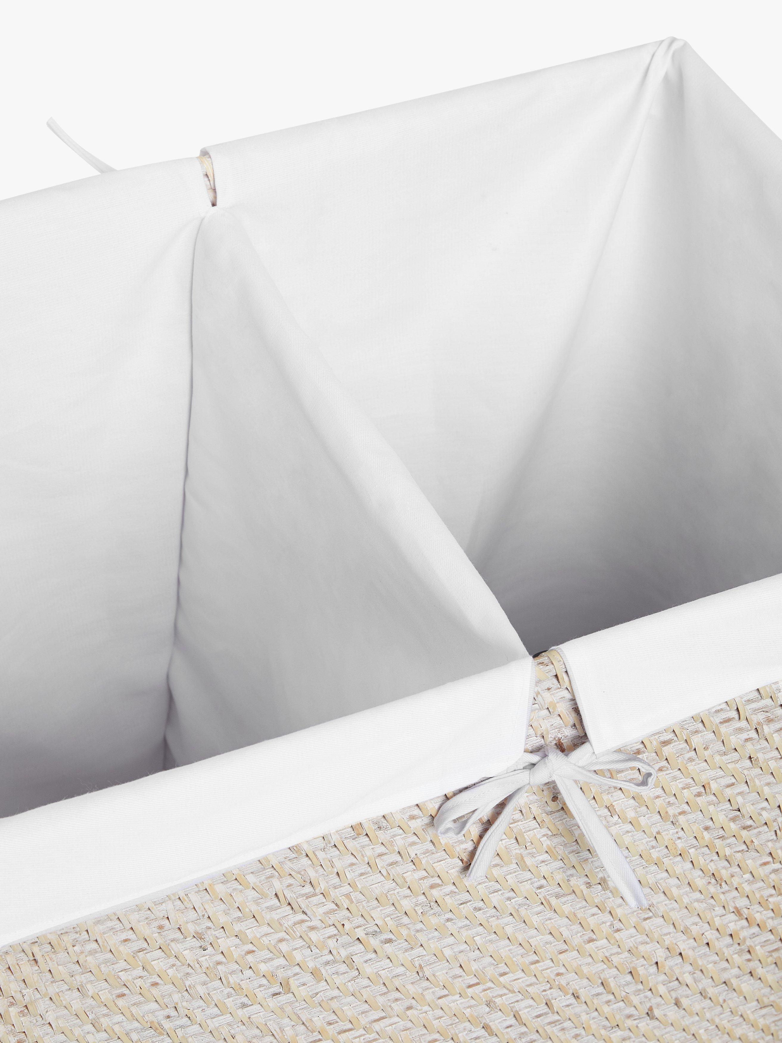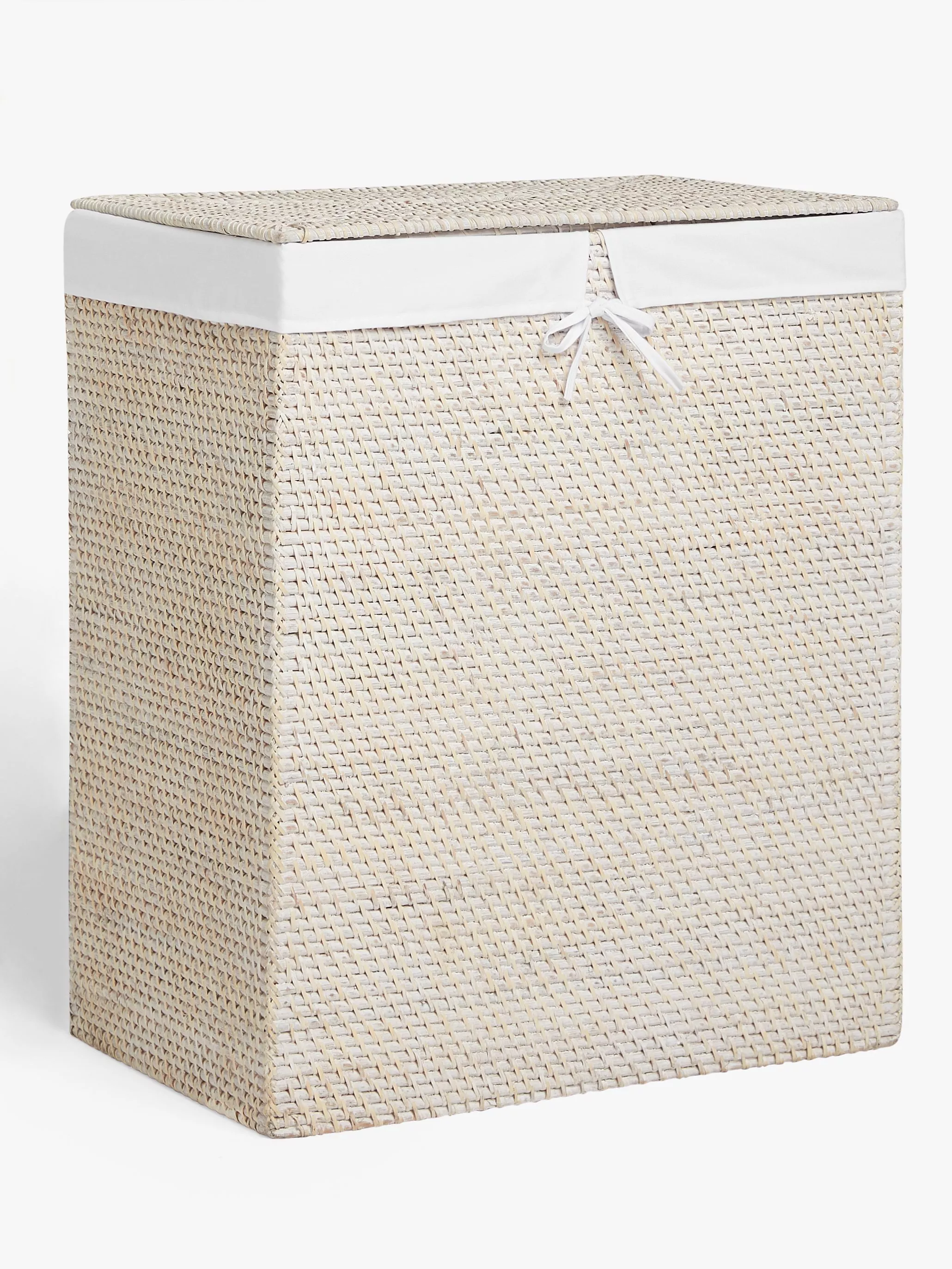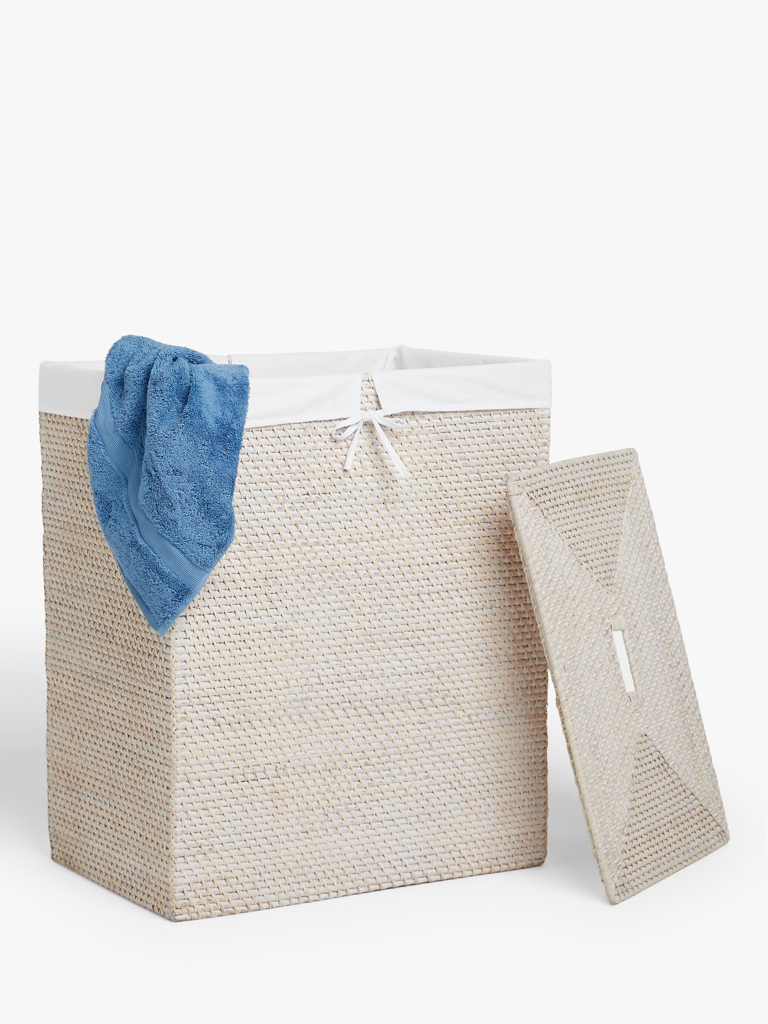 A linen bin with separate sections for whites and colours. The inner liner prevents clothes snagging on the rattan.