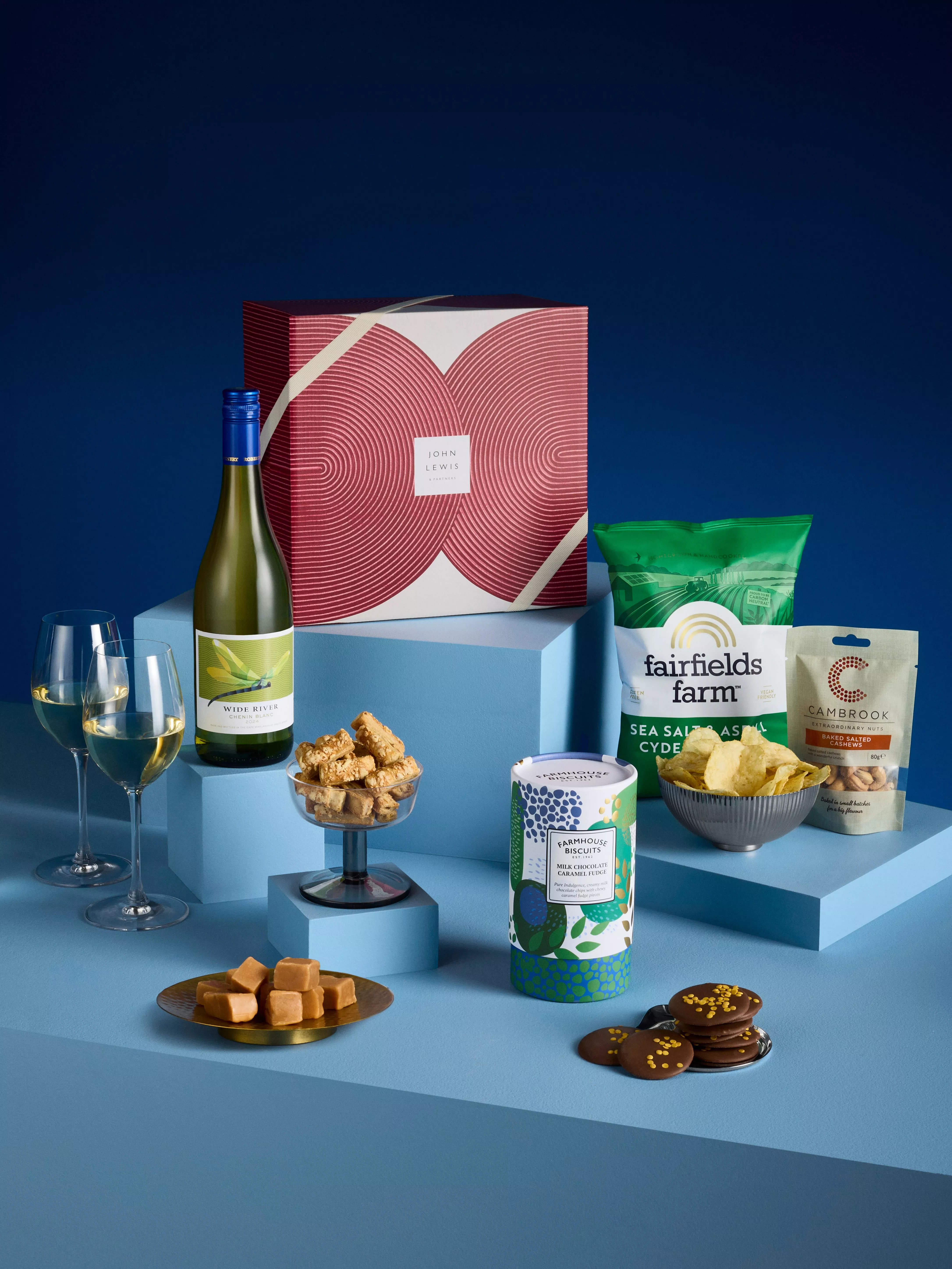 - Wide River Chenin Blanc 75cl Farmhouse Biscuits Milk Chocolate Caramel Fudge 150g Fairfields Farm Crisps Sea Salt & Aspall Cyder Vinegar 150g House of Fudge Gingerbread Fudge 100g Linden Lady Milk Chocolate Buttons 90g Cambrook Extraordinary Baked Salted Cashews 80g Myrtle & Olive Cheese Straws 75g