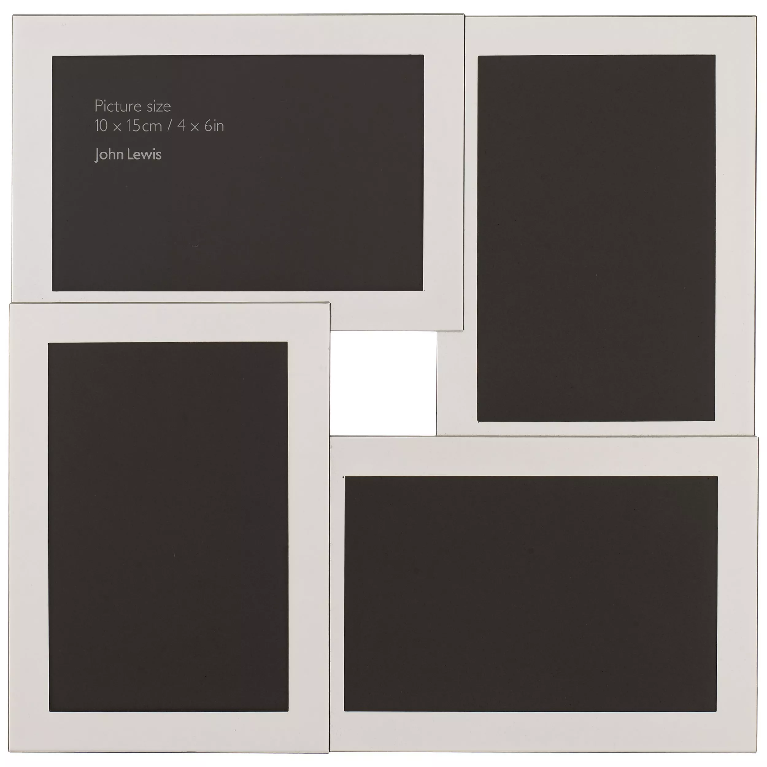 The frame holds four 4 x 6" (10 x 15cm) images. The inch measurements are rounded measurements worked back from standard centimetre sizes.