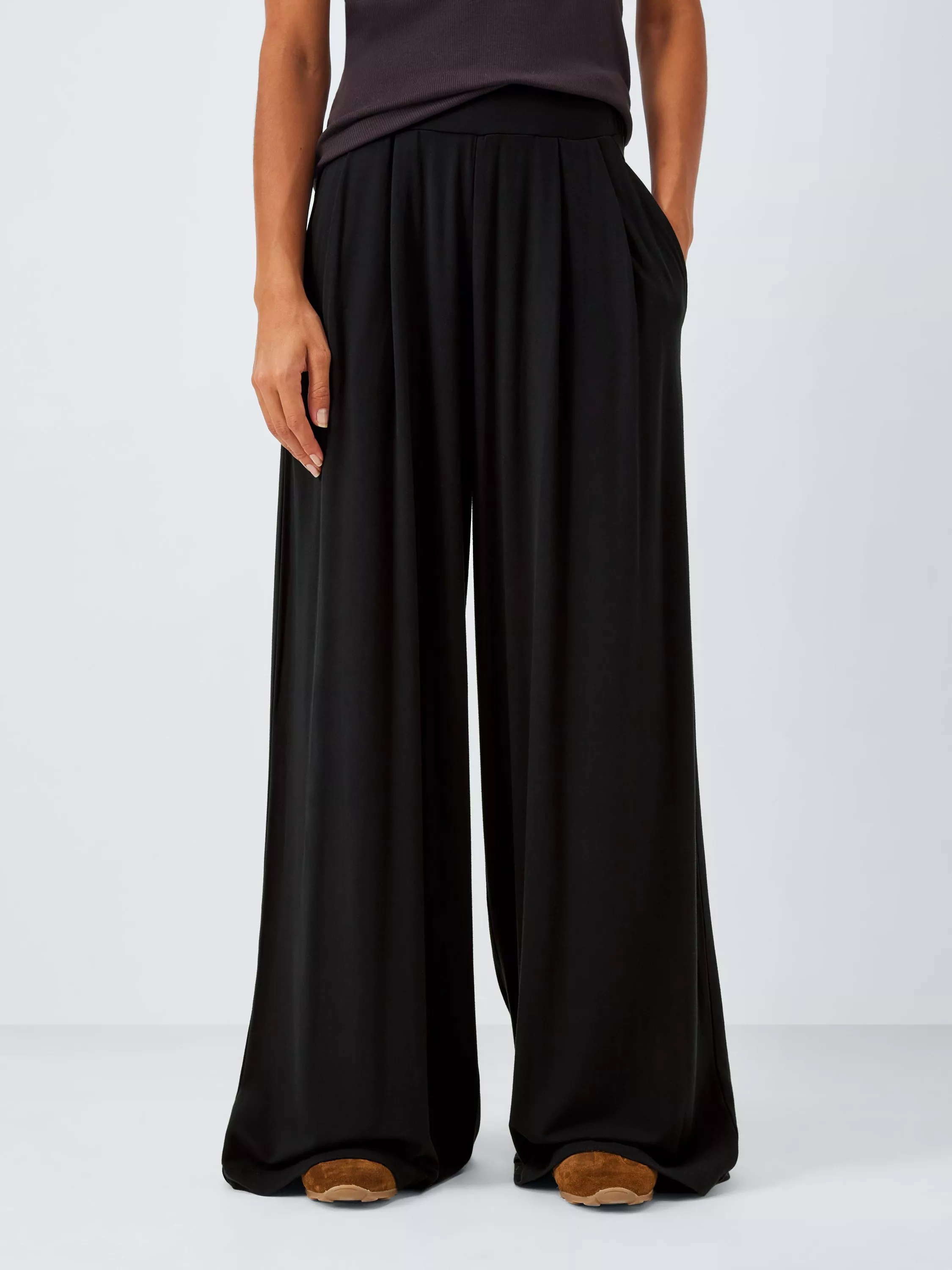 Fluid, soft and stretchy viscose keeps these jersey fabric trousers feeling as comfortable as pyjamas, while making a sleek style statement. A modern wide-leg shape is supported by the deep elasticated waist, so you can literally pull these on and go. Try pairing with a graphic tee and trainers.