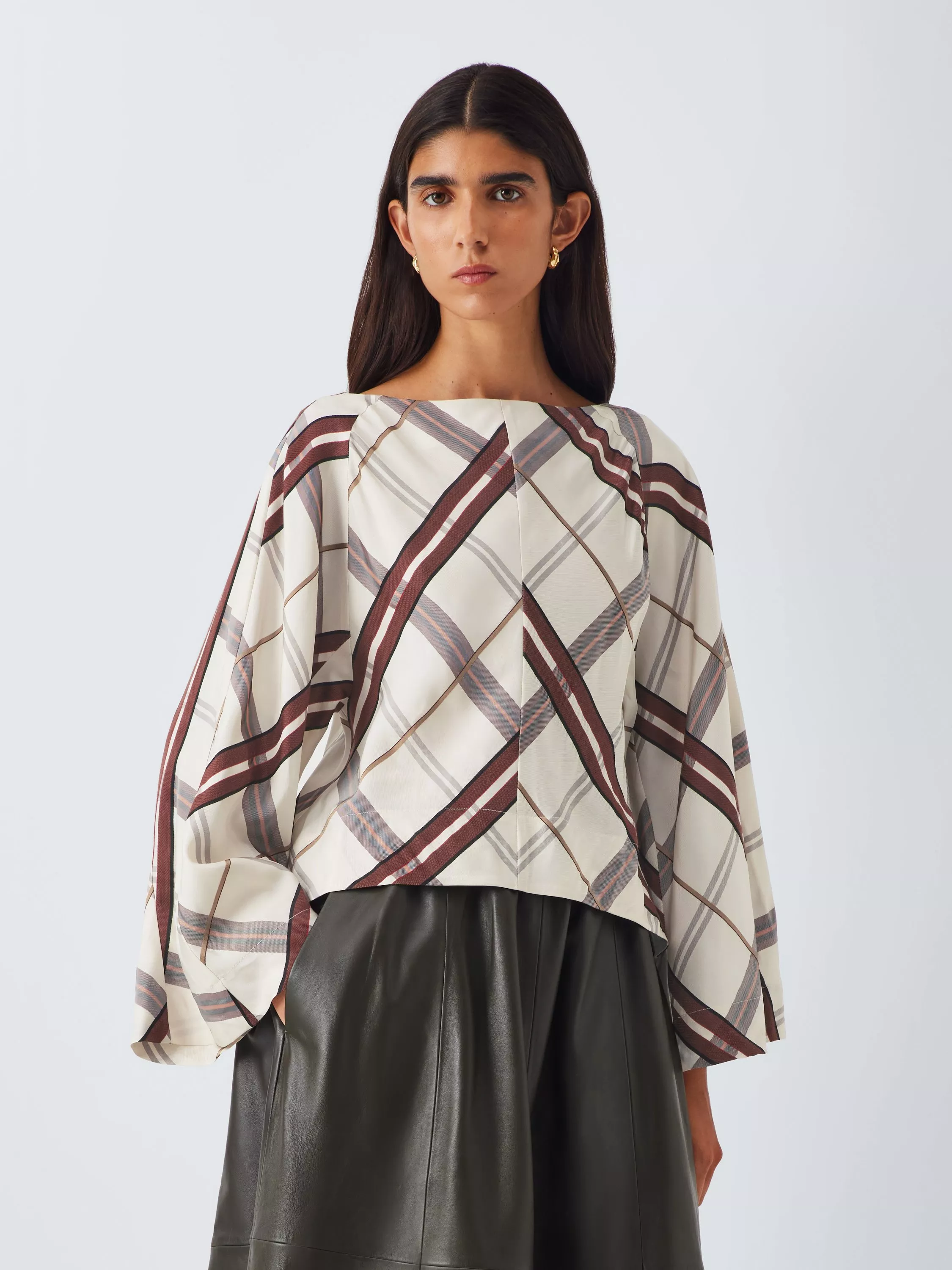 An updated take on a heritage pattern, this top features bold checks and contemporary wide sleeves. Fastens at the back of the neck.