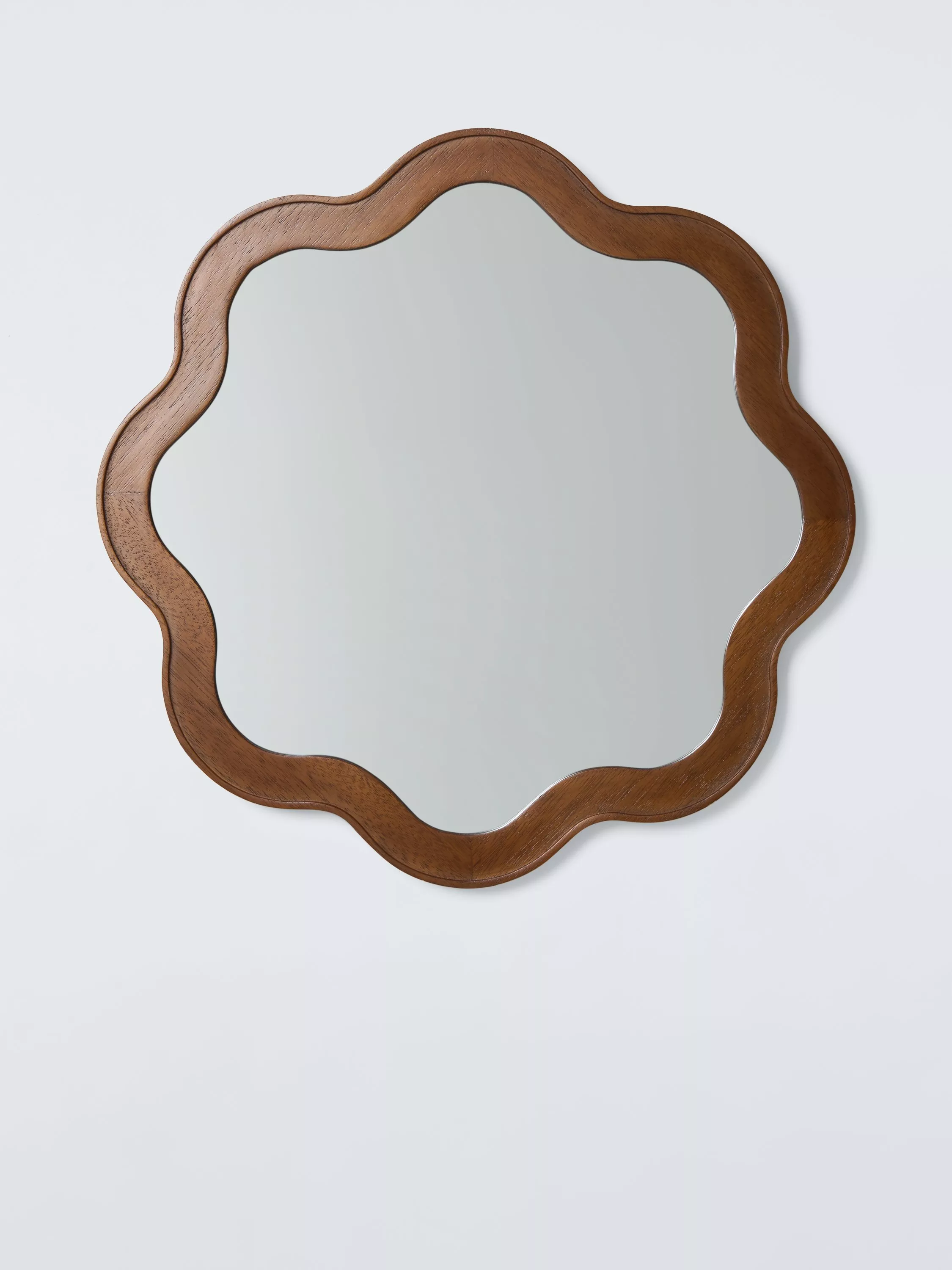 Solid wood wall mirror with a handmade design and dark walnut-stained finish. A contemporary shape and updated take on Mid-century design. Ready to hang on your wall using the D-ring fittings on the back.