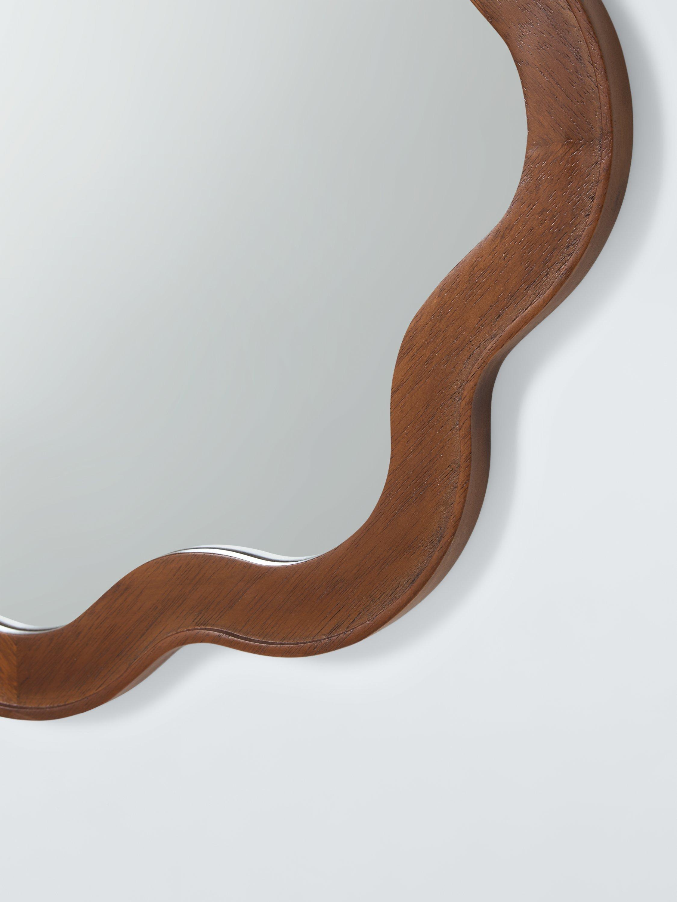 Solid wood wall mirror with a handmade design and dark walnut-stained finish. A contemporary shape and updated take on Mid-century design. Ready to hang on your wall using the D-ring fittings on the back.