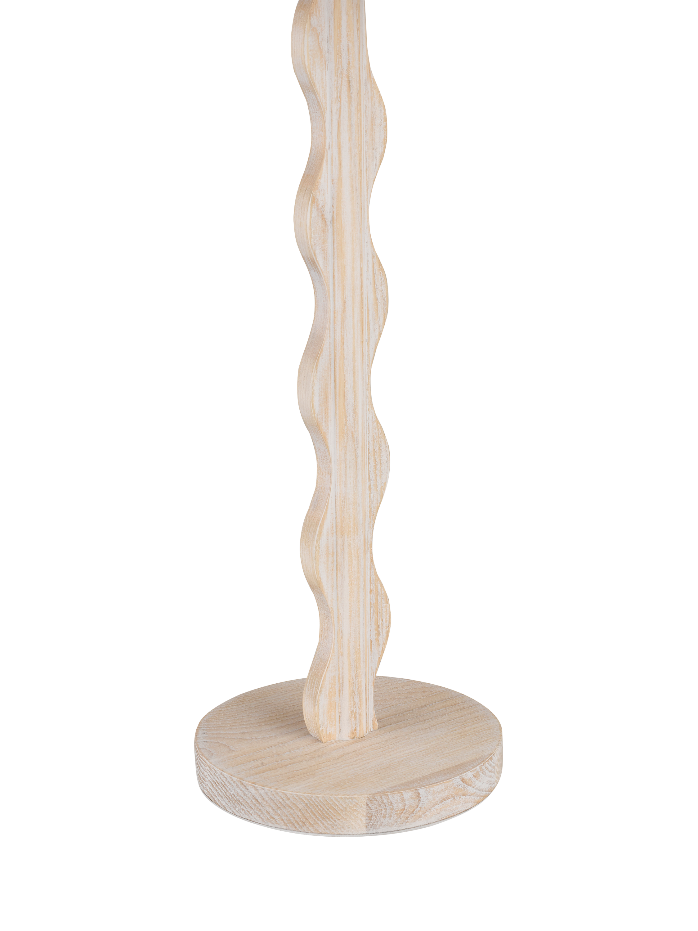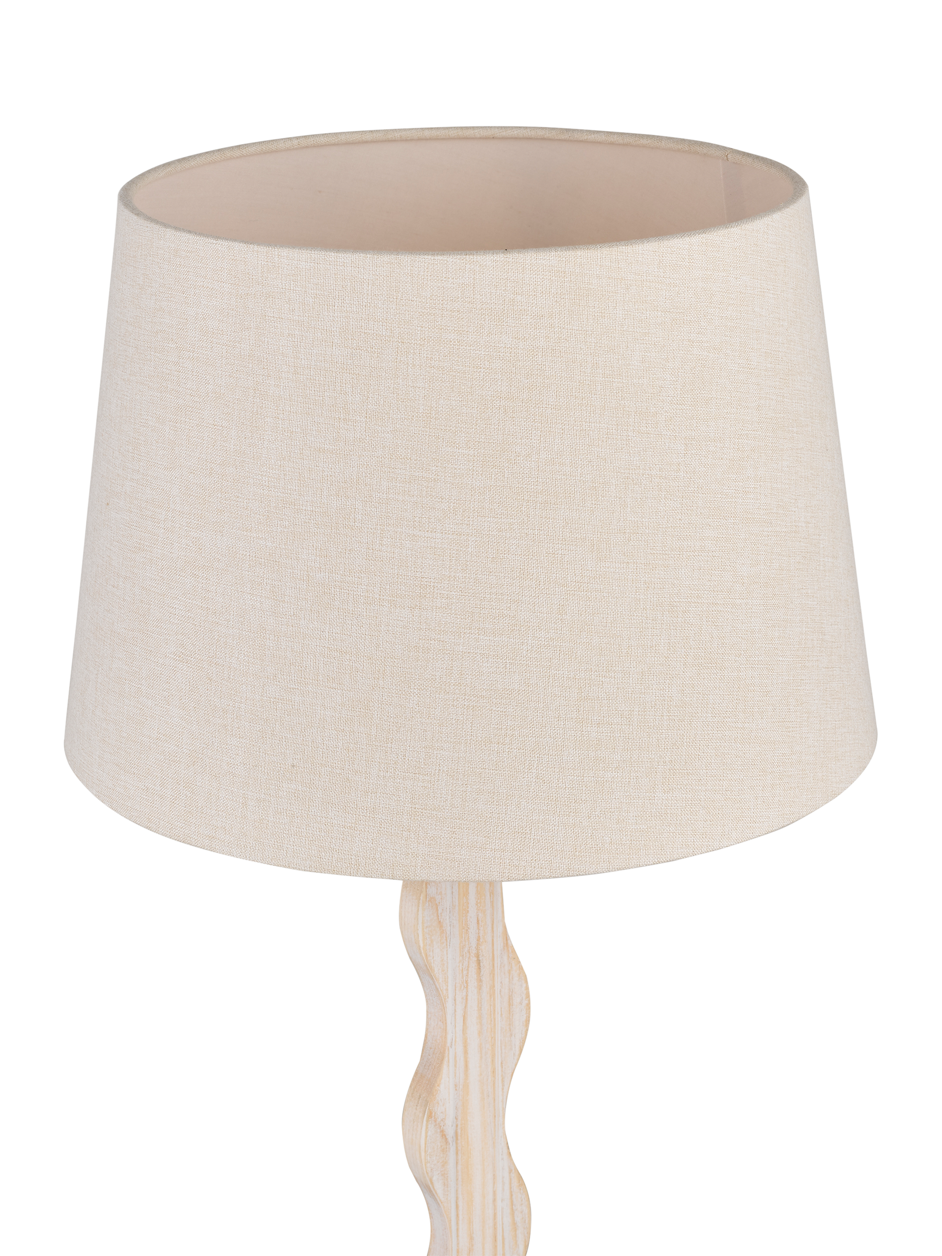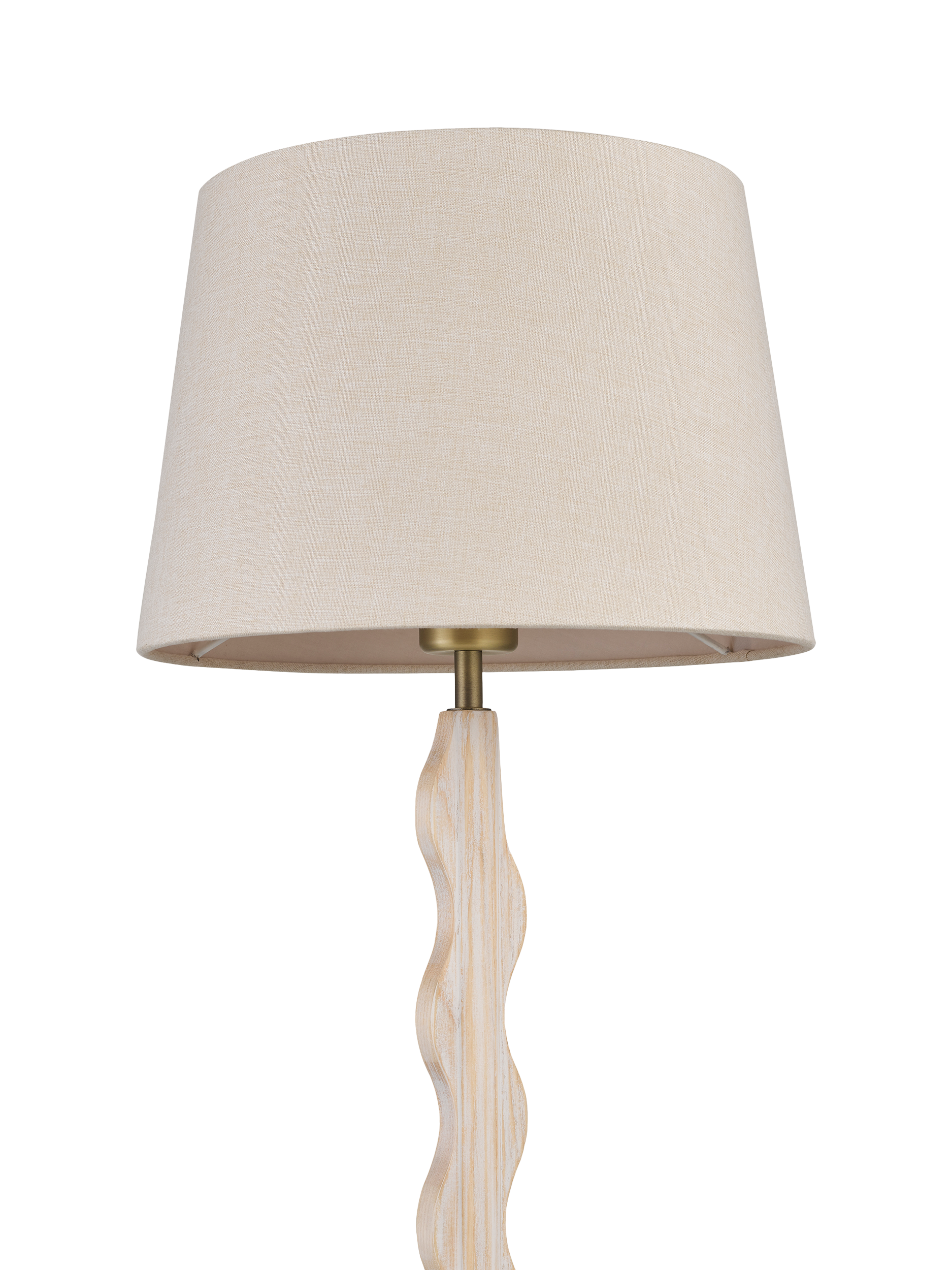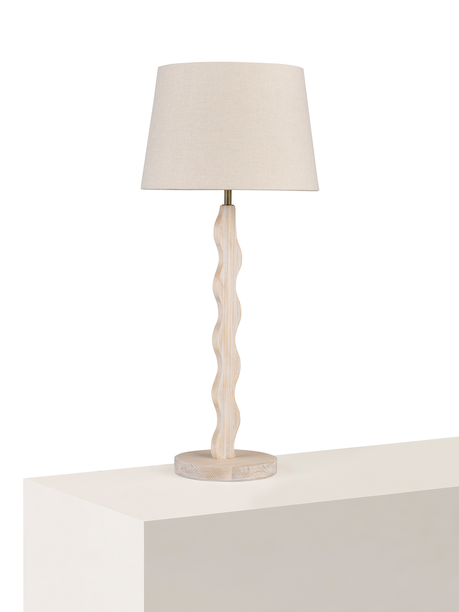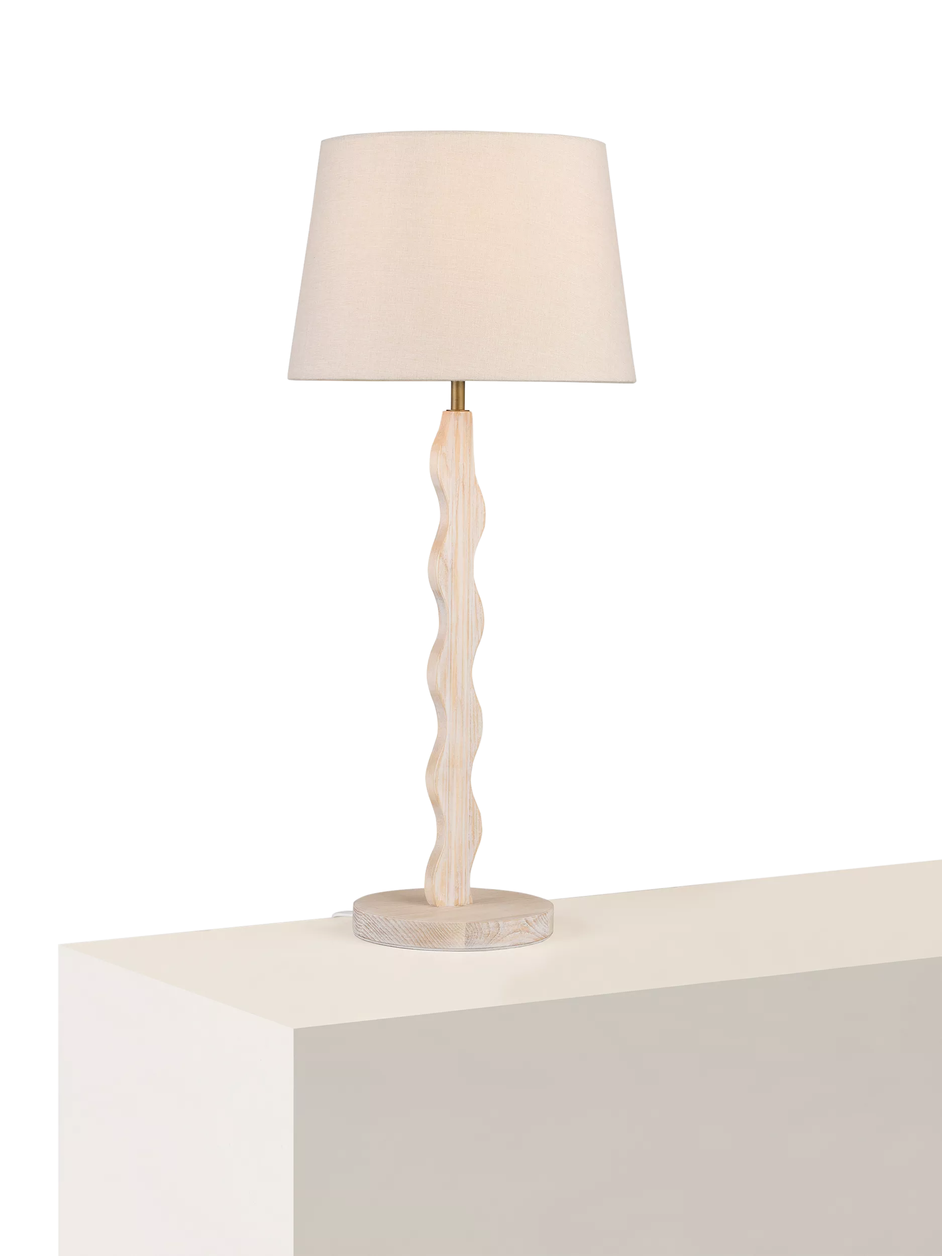 The Wiggle table lamp is designed with a contemporary wiggly silhouette. The staining on the wooden stem and cylindrical plinth enhances the natural grain of the ash wood. A soft tapered linen lampshade adds a warm wash of light to suit a variety of living spaces.